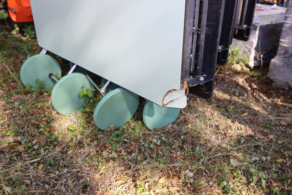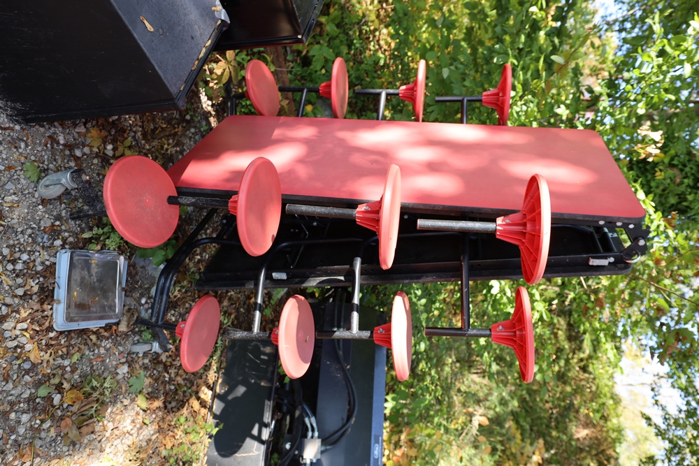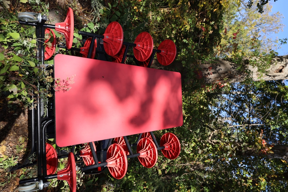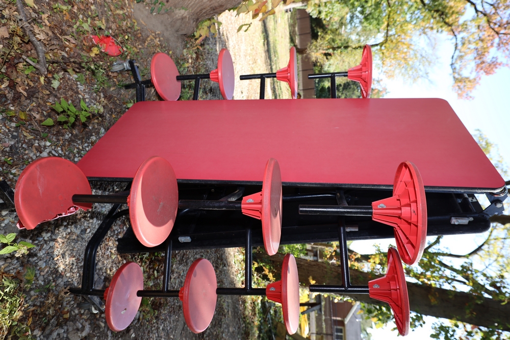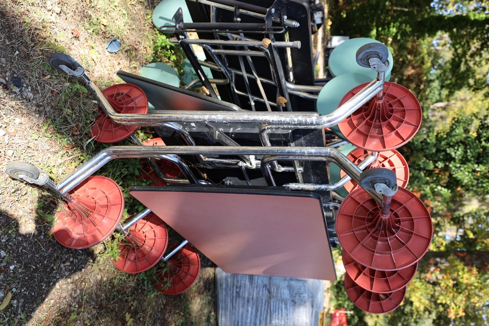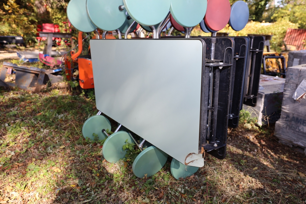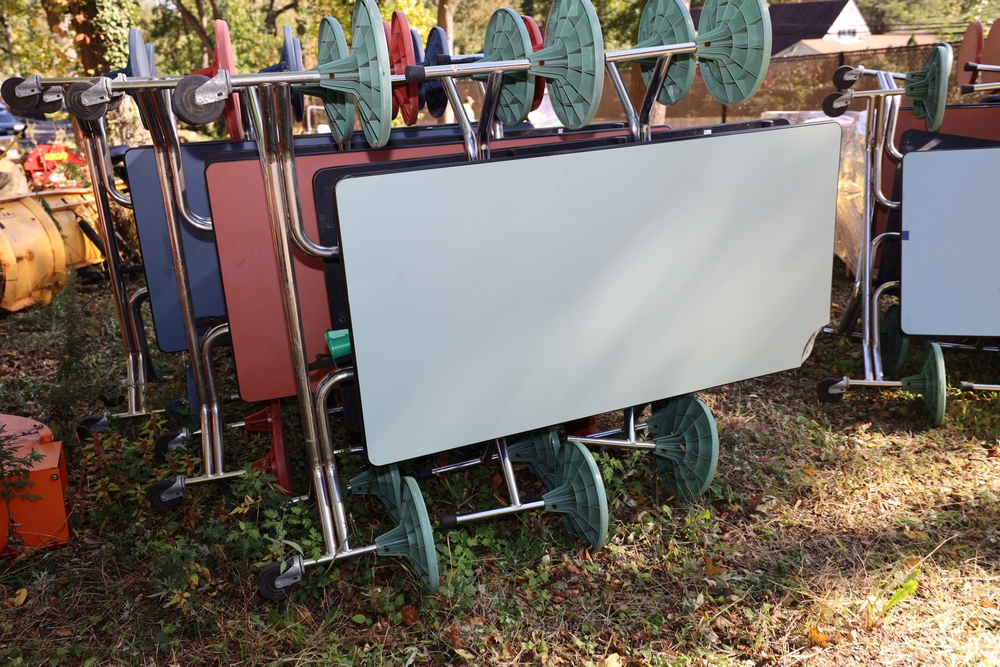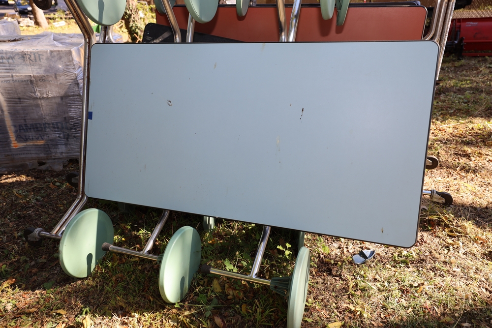 Folding cafeteria tables. (4) eight-seat tables and (5) six-seat tables. Varying condition. Stored outdoors.