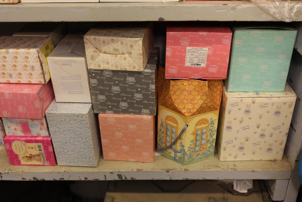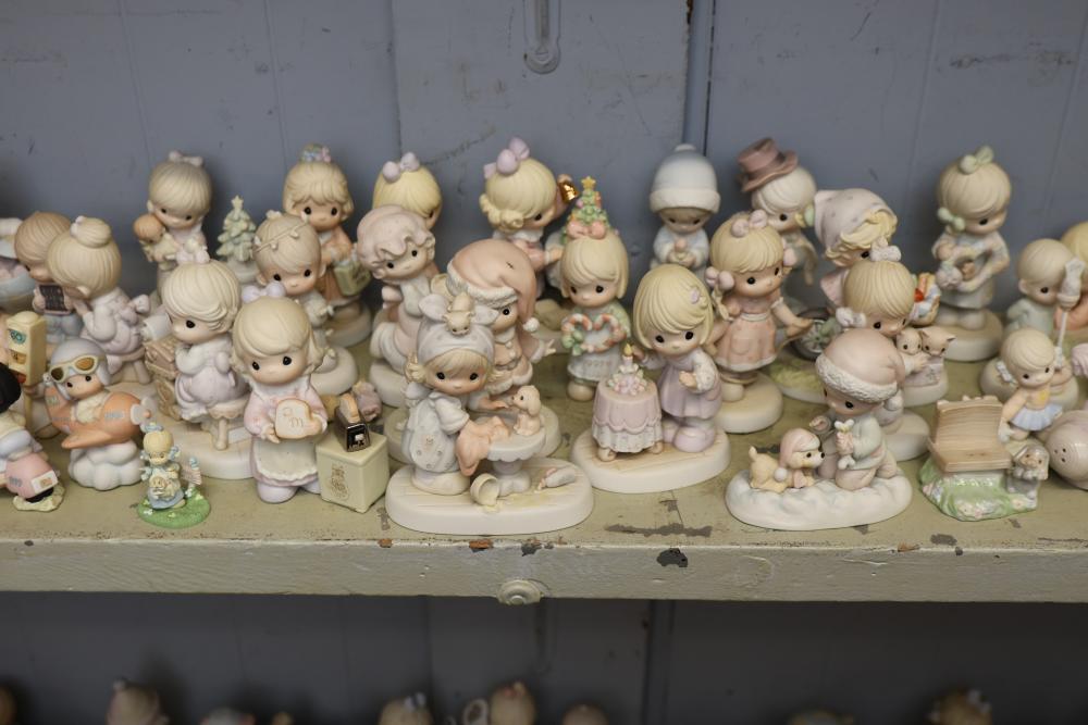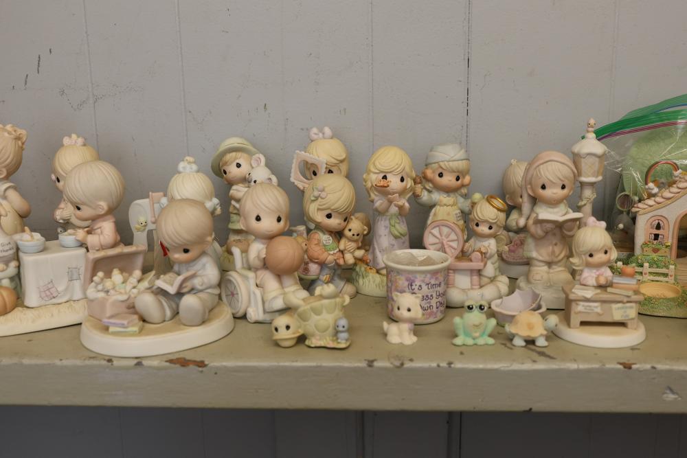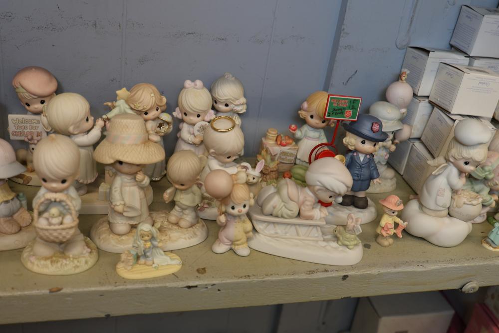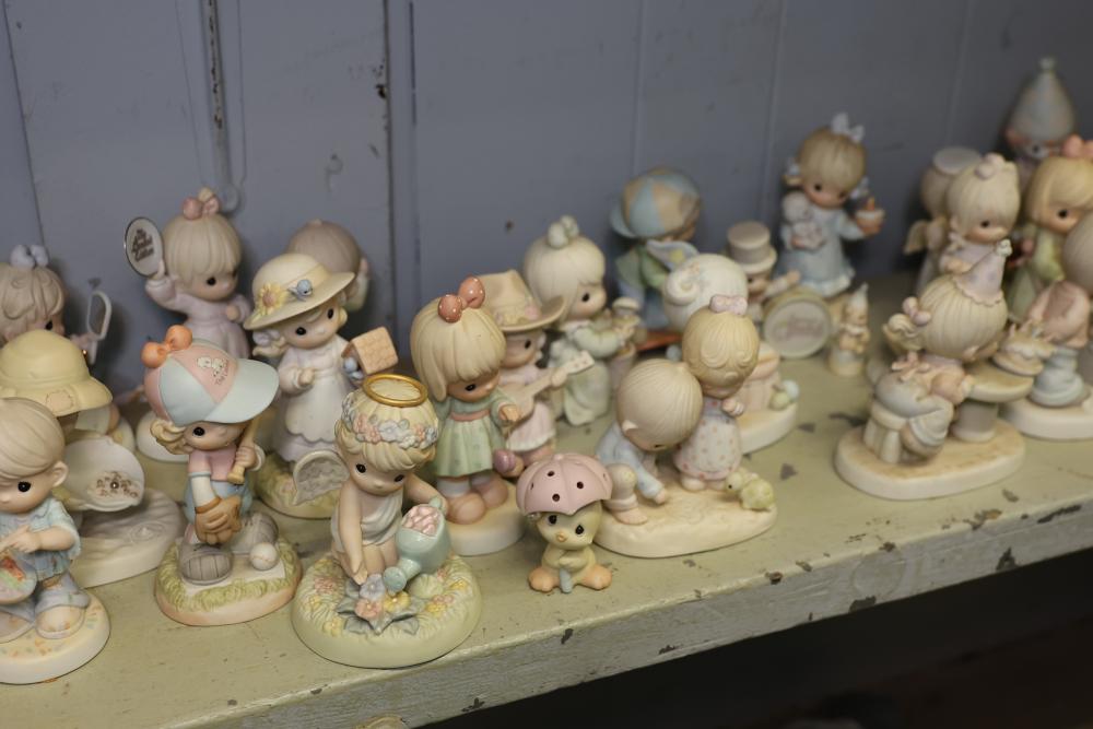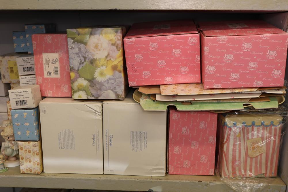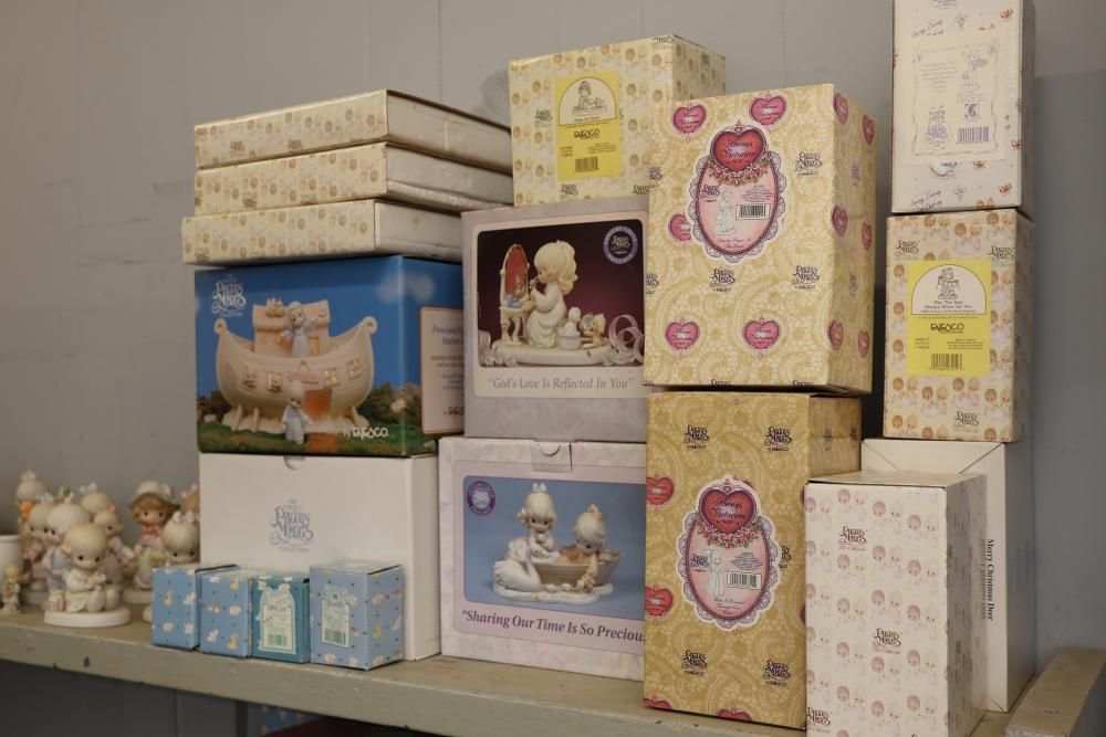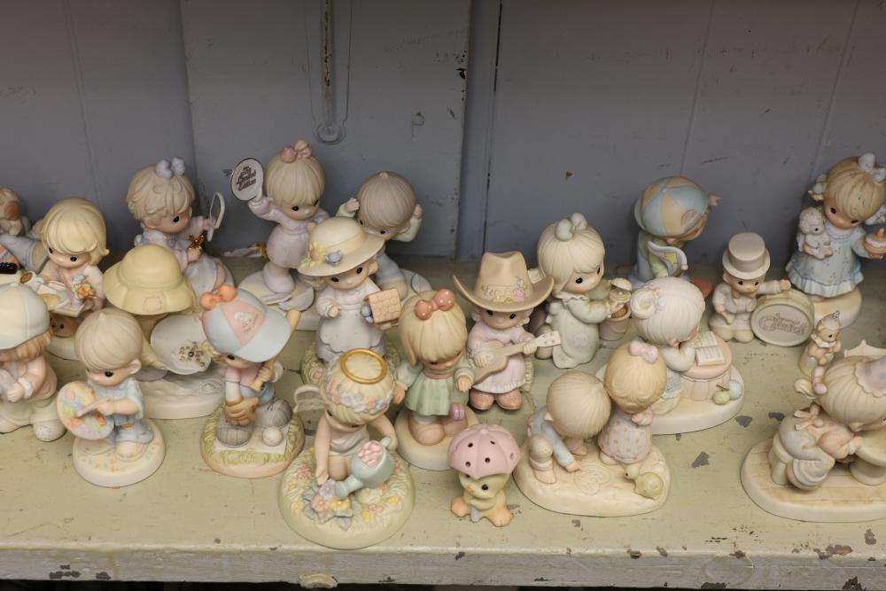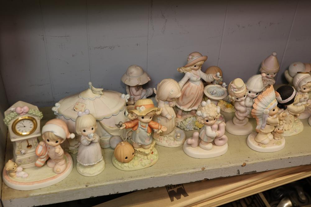 Approximately 200 Precious Moments figurines, many with original boxes. Includes a variety of designs, such as children engaged in activities, posed with animals, and themed holiday pieces. Some figures include accessories like musical instruments, decorative elements, or additional small figurines. Pickup only.