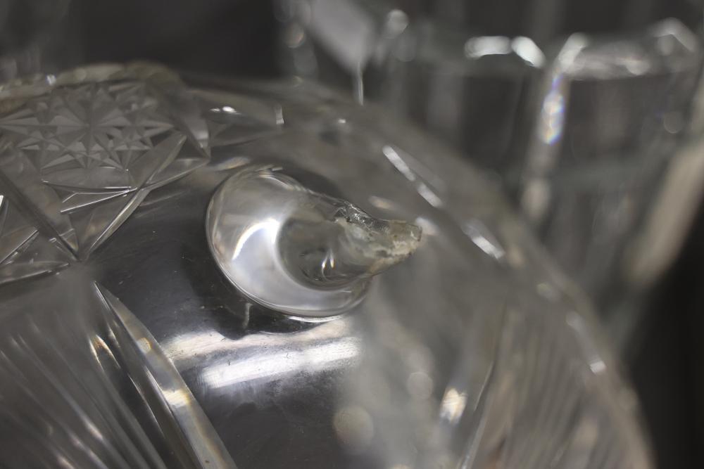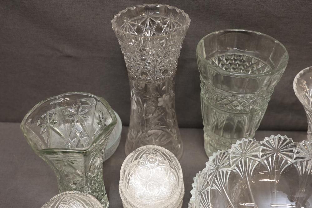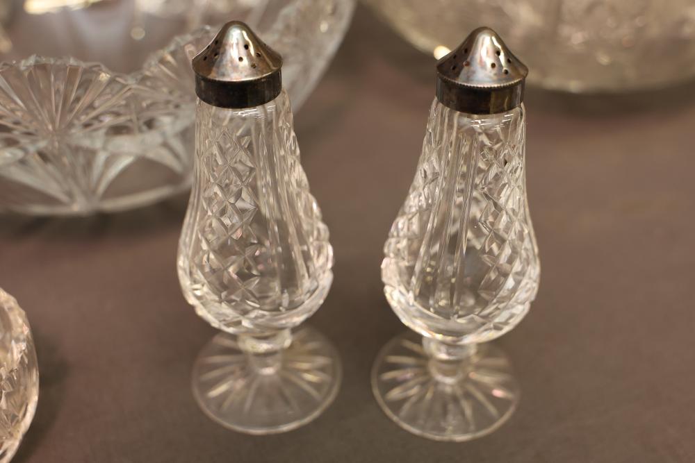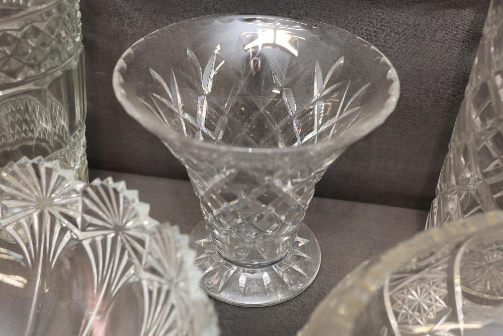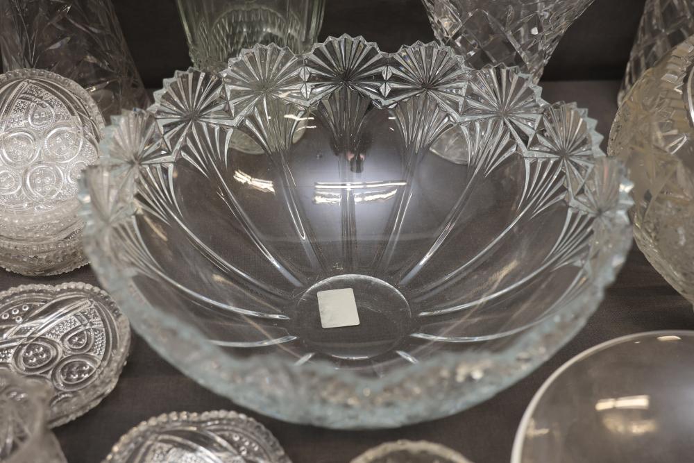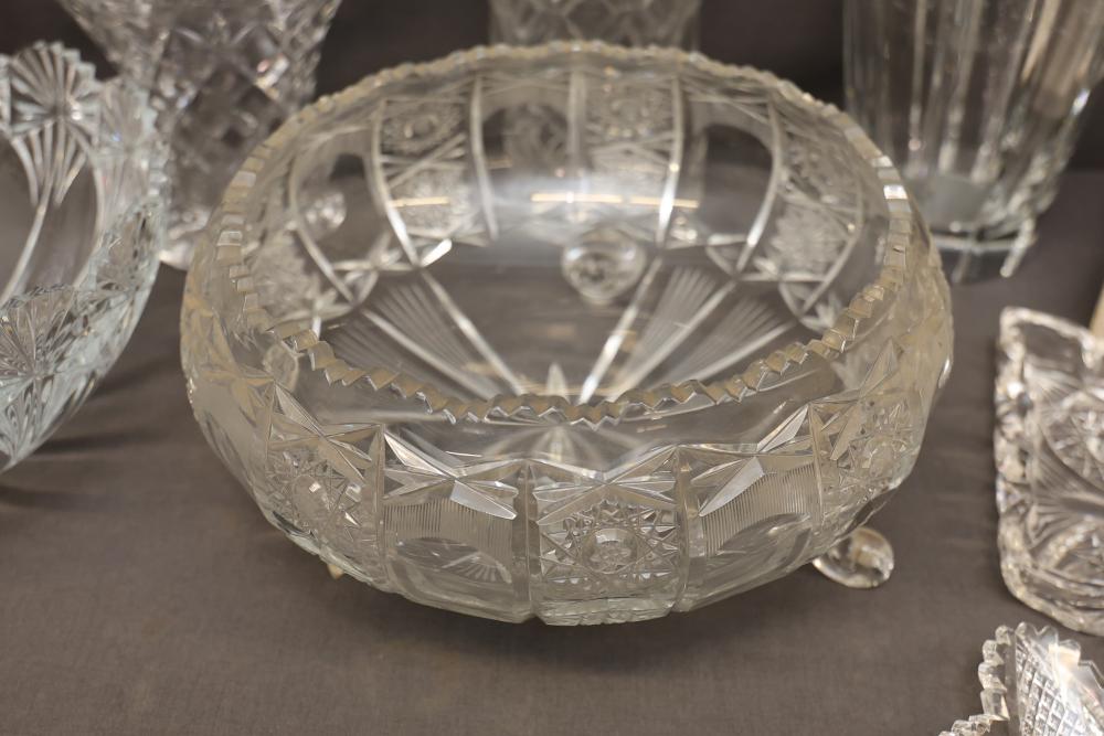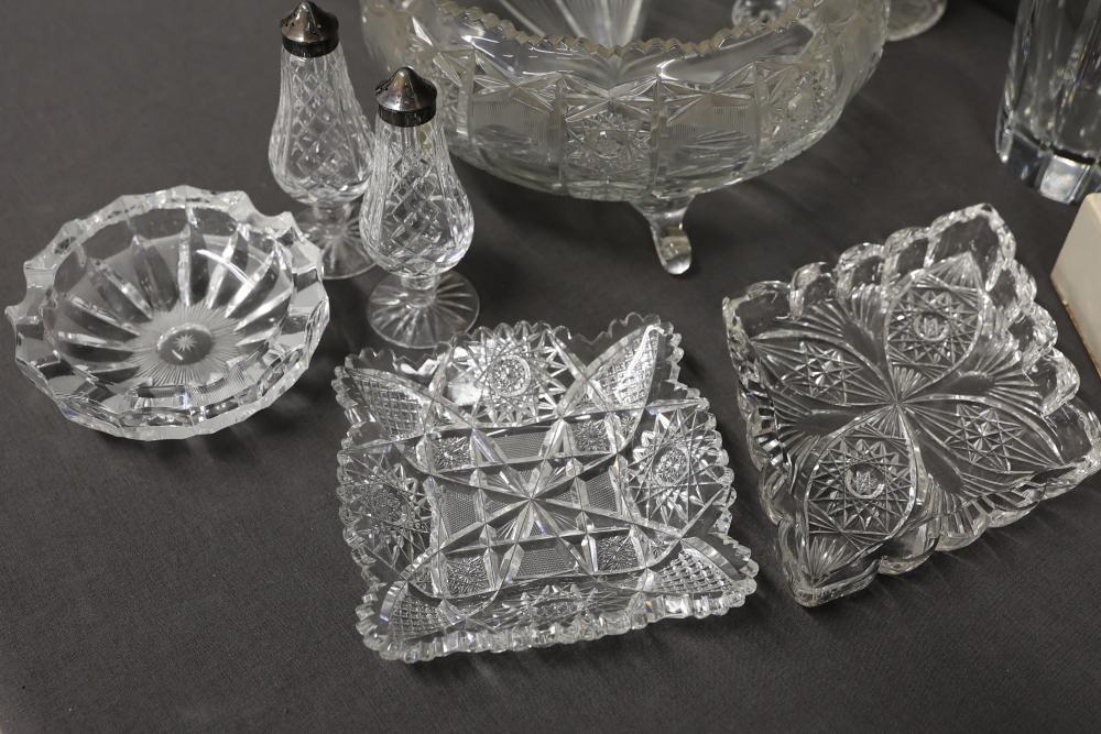Crystal Bowls, Dishes, Vases, and Tableware Pieces. This set features a wide range of clear crystal tableware items including bowls, dishes, vases, and salt and pepper shakers. Some pieces are marked. The collection showcases detailed patterns and various designs throughout the assortment. Pickup only. Buyer must bring packing materials.