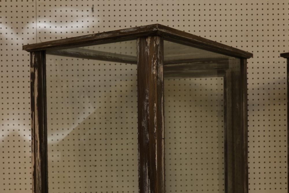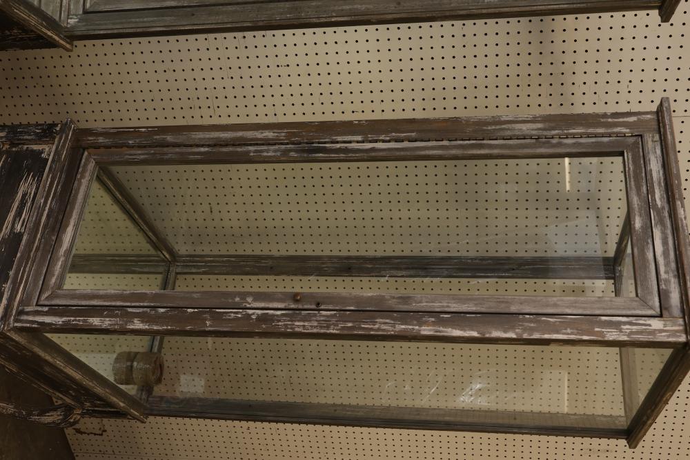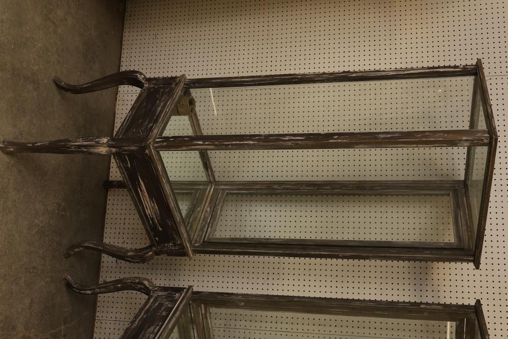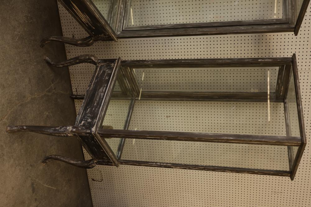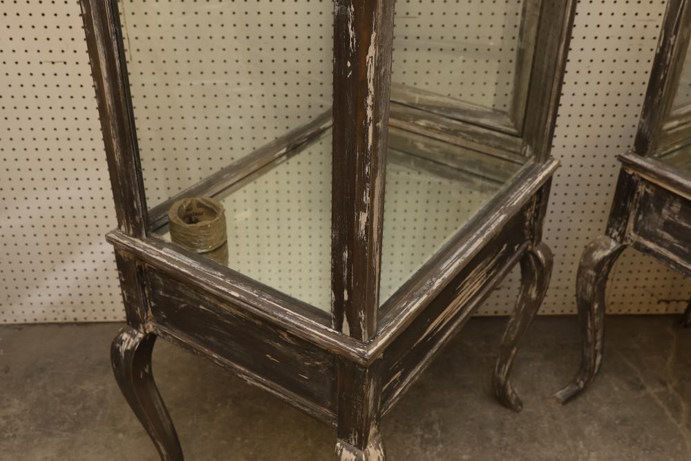 Two Weathered Display Cabinets with Glass Panels. Each cabinet features a wood frame with distressed finish, glass panels on all sides, and curved legs. The flat top and see-through design provide ample display space. No key available but doors are unlocked. Some hardware is included. 26inWx19inDx72.5inH, interior is 46inH Pickup only.