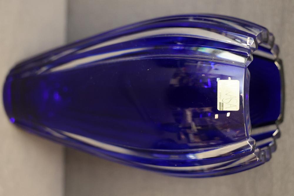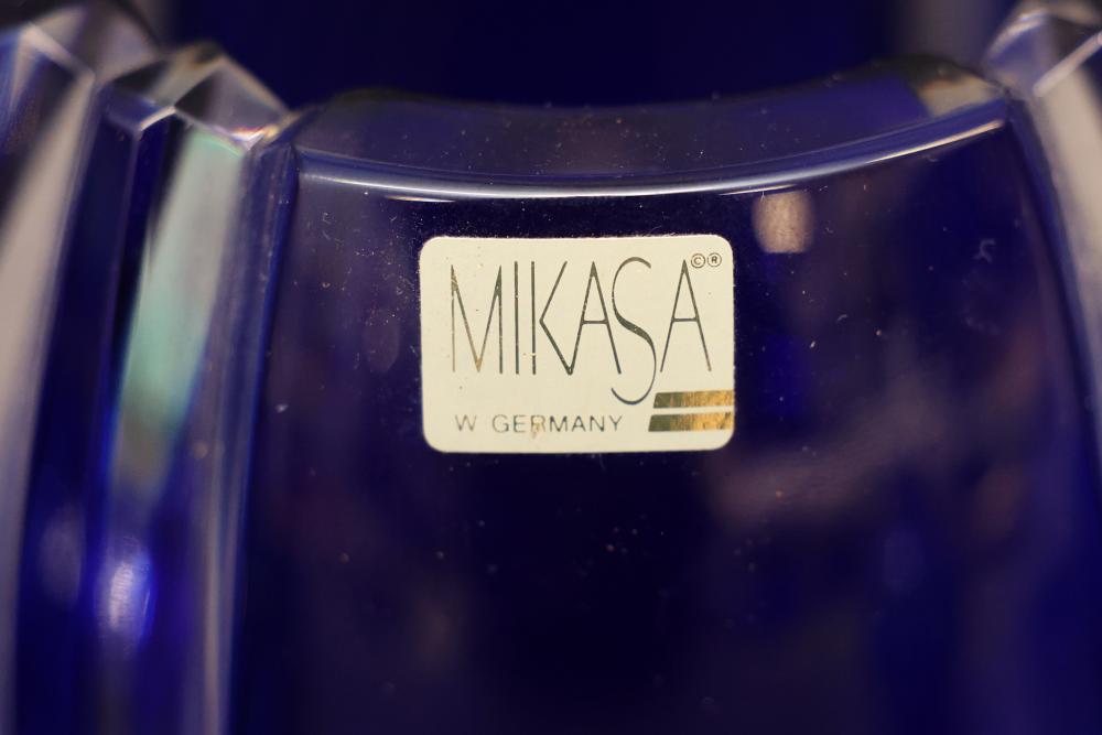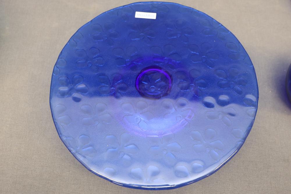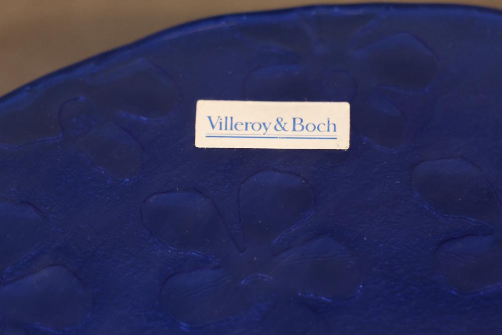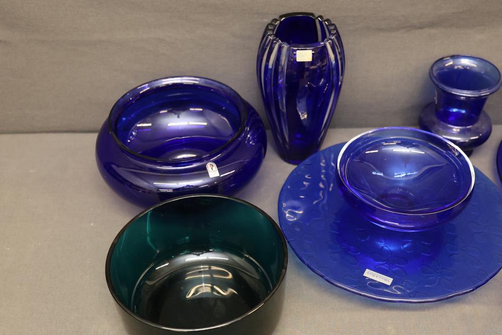 Villeroy & Boch and Mikasa Blue Glassware Pieces, featuring a variety of bowls, plates, vases, and decorative pieces in deep blue and green tones. Items are crafted with textured and smooth finishes. Pickup only.