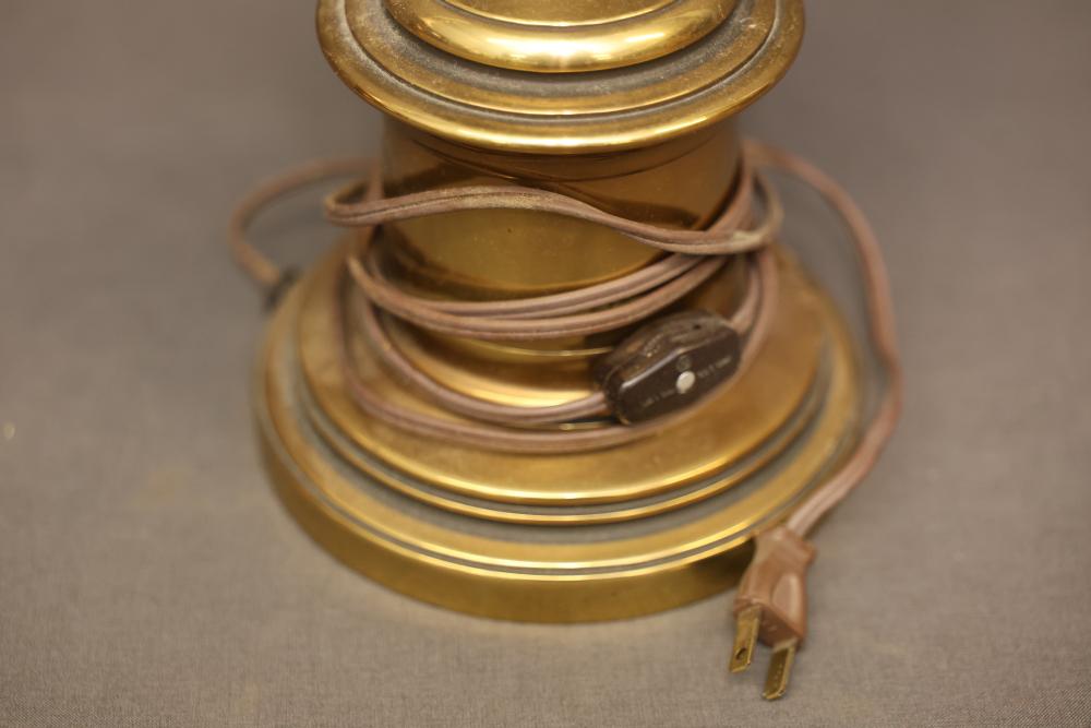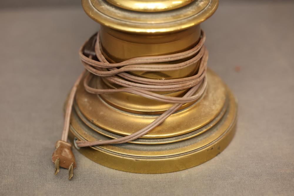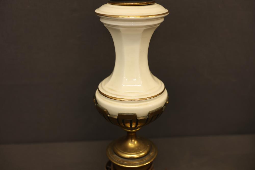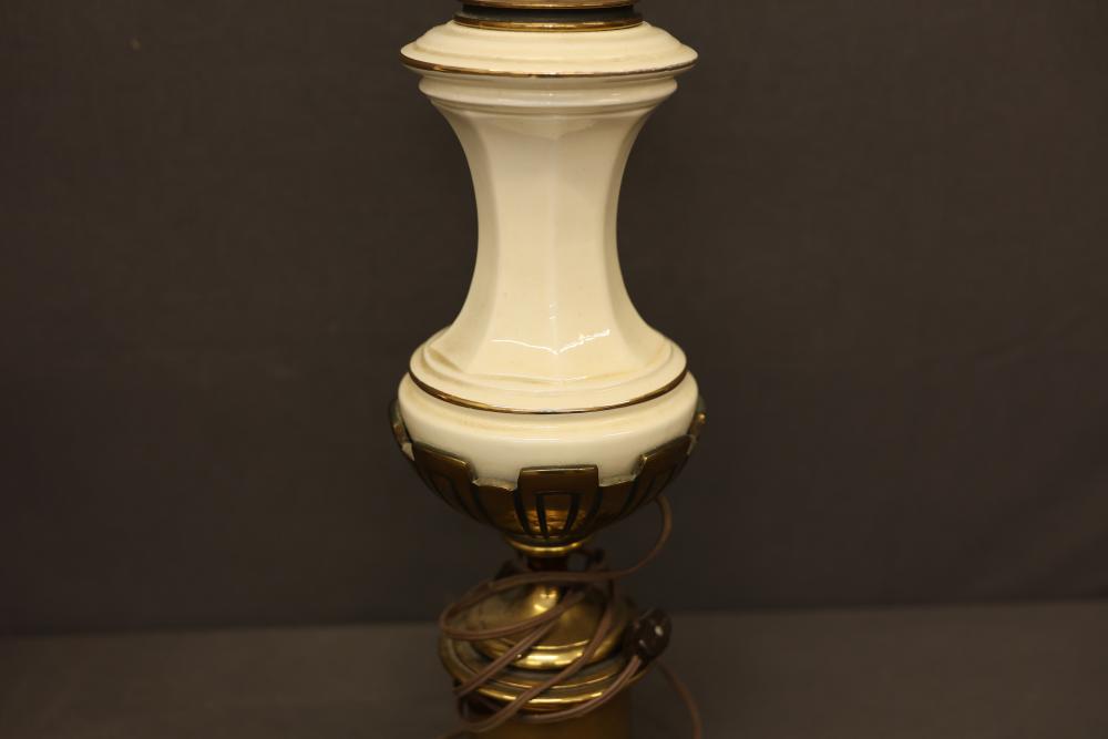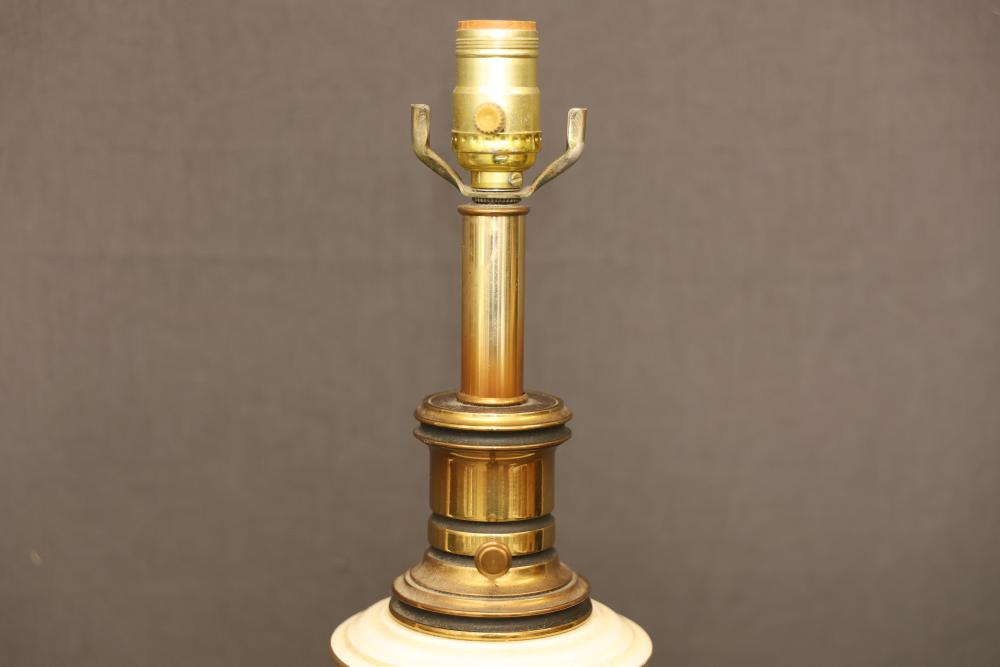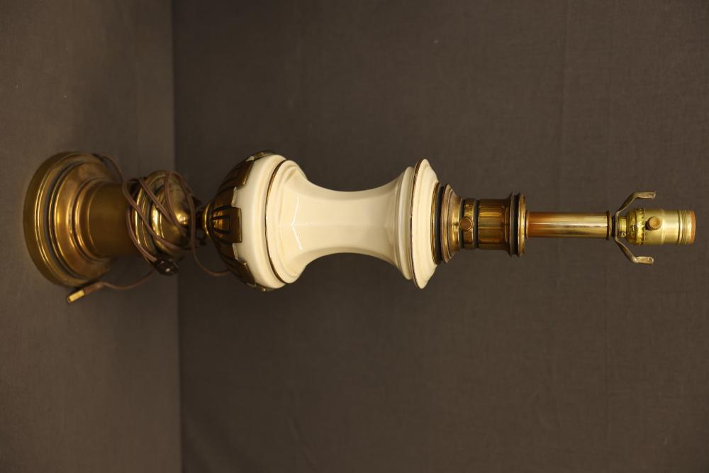 Brass and Ceramic Table Lamps with White Accents. Featuring an elegant brass base and body, accented with white ceramic components. Each lamp is equipped with wiring and a functional switch on the cord. No shades included. Suitable for indoor use. Pickup only.