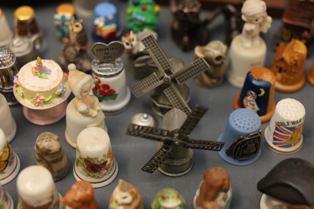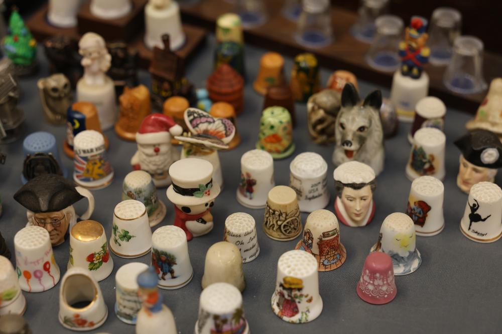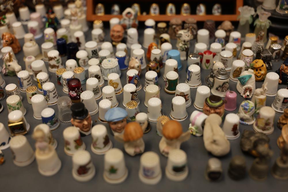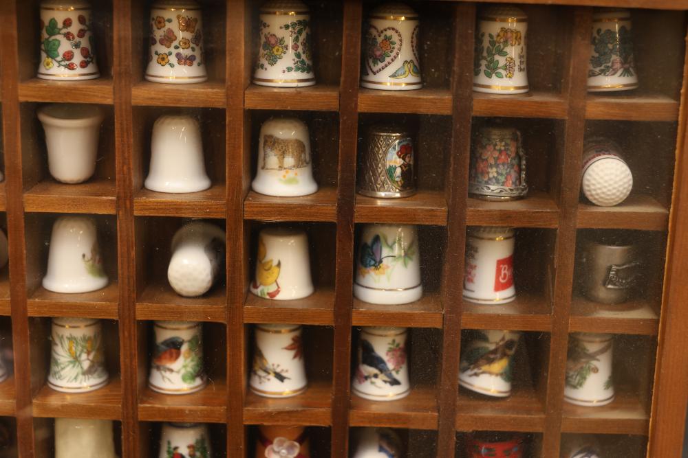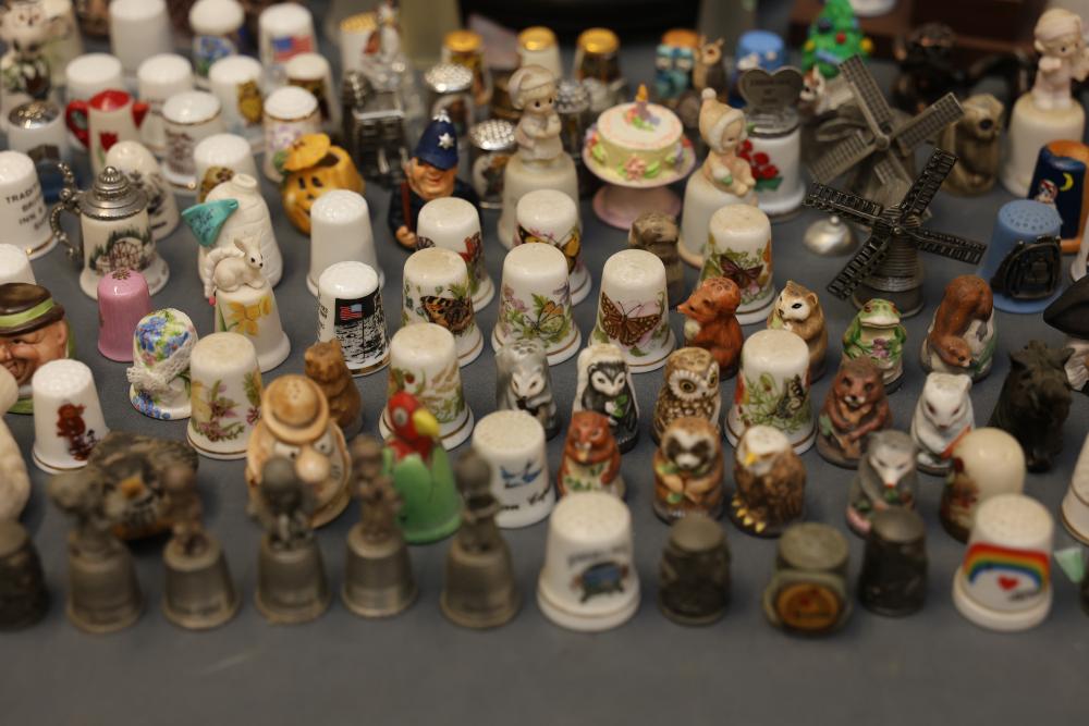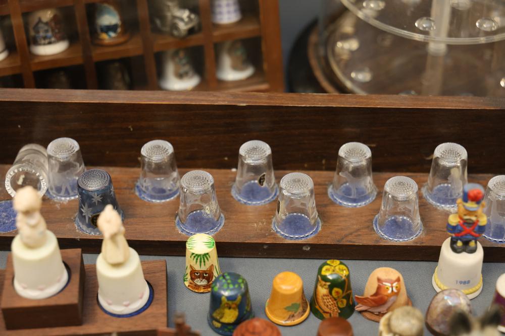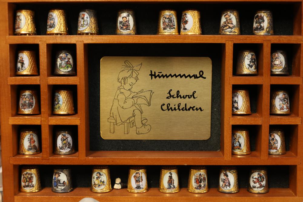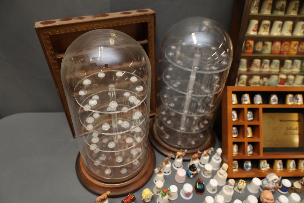 Extensive collection of decorative thimbles including ceramic, porcelain, and themed designs. Wide variety of intricate styles and motifs, with multiple custom display cases, shelves, and two glass dome display stands. Features notable collections such as Hummel-designed thimbles, animal-themed designs, and novelty figurines. Includes wood-framed wall-mounted cases and display racks. Pickup only.
