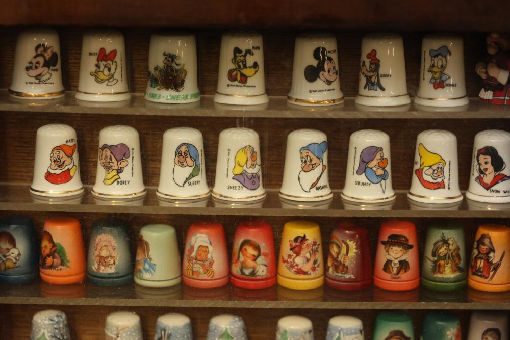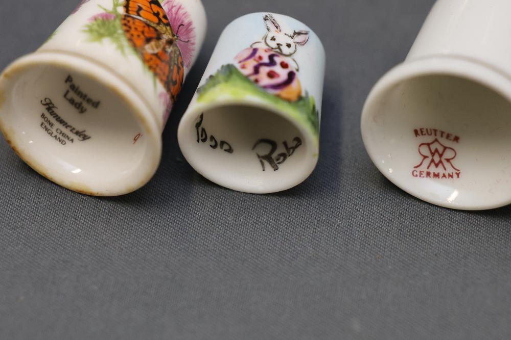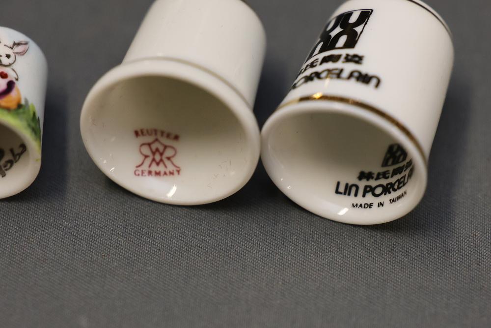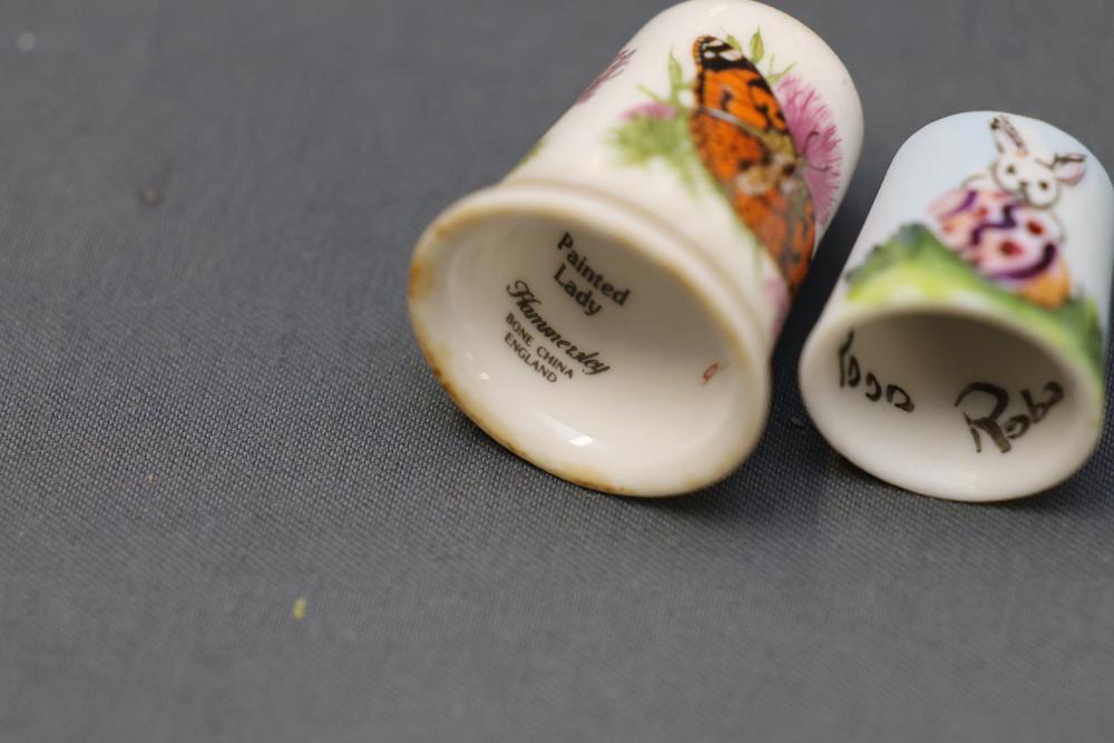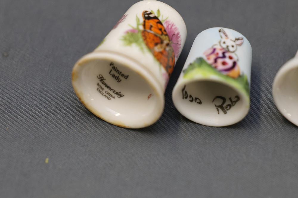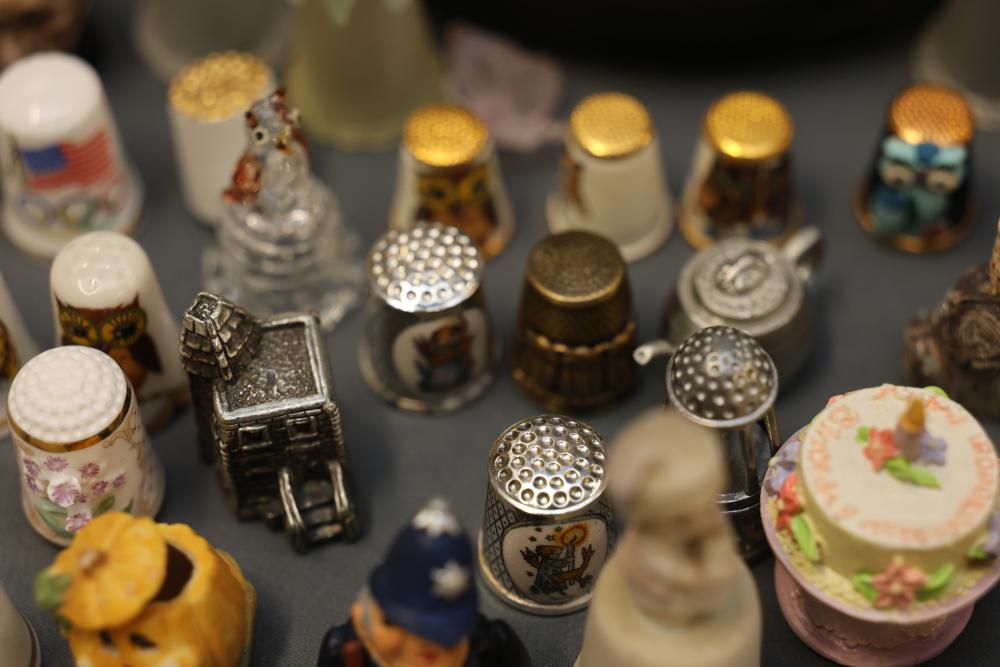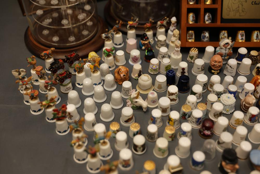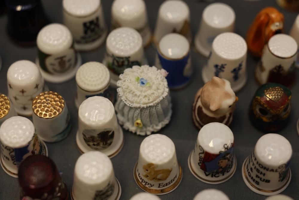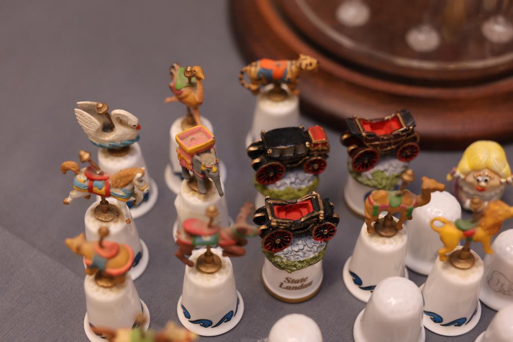Extensive collection of decorative thimbles including ceramic, porcelain, and themed designs. Wide variety of intricate styles and motifs, with multiple custom display cases, shelves, and two glass dome display stands. Features notable collections such as Hummel-designed thimbles, animal-themed designs, and novelty figurines. Includes wood-framed wall-mounted cases and display racks. Pickup only.