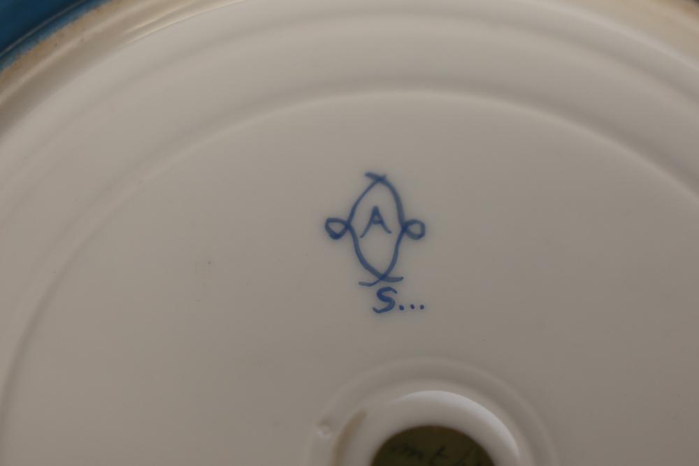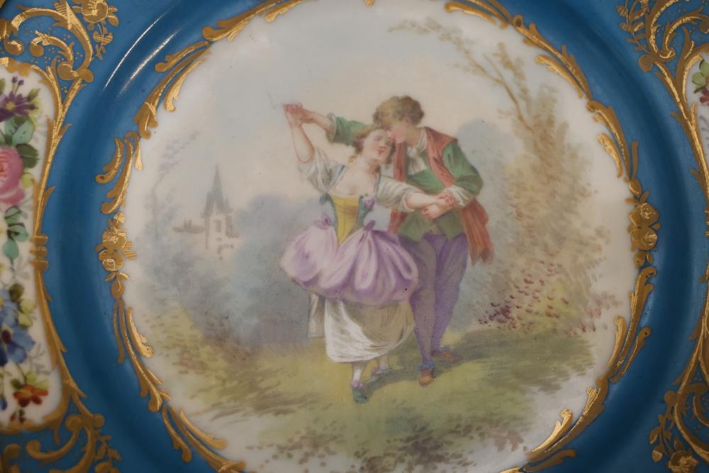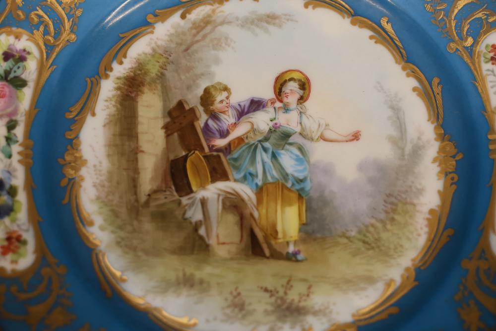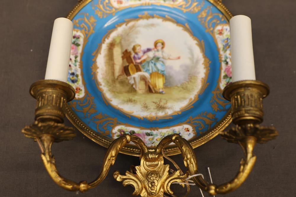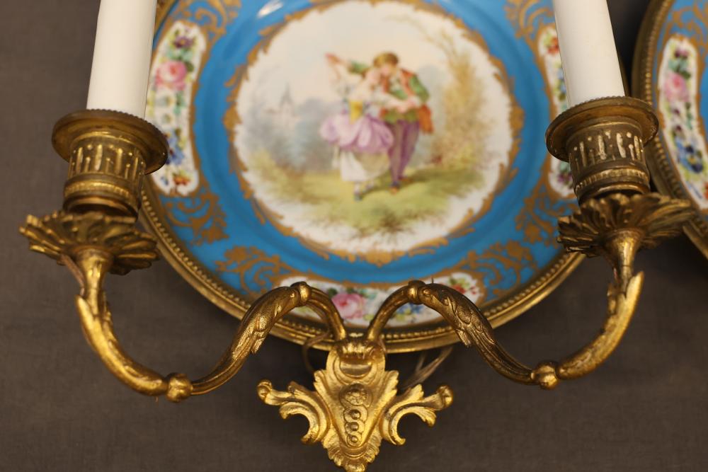 Porcelain and Gilt Bronze Candelabra Plates with Romantic Scenes. Features two hand-painted porcelain plates with blue borders, floral detailing, and romantic pastoral scenes. Each plate is mounted in an ornate gilt bronze frame with a decorative ribbon and two-arm candle holders. Markings on the reverse as shown. Pickup only.