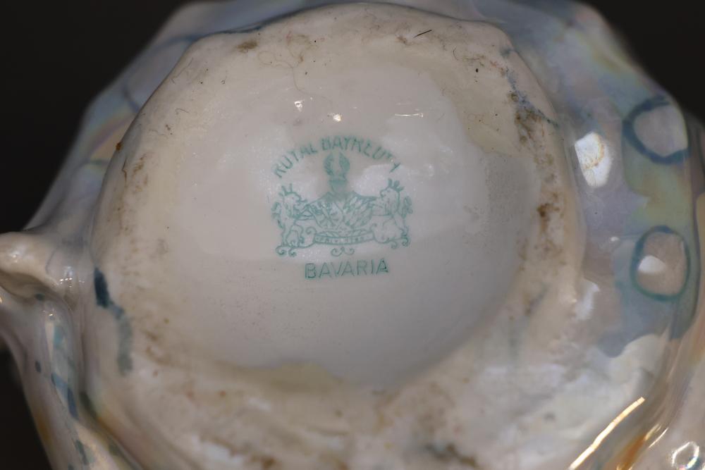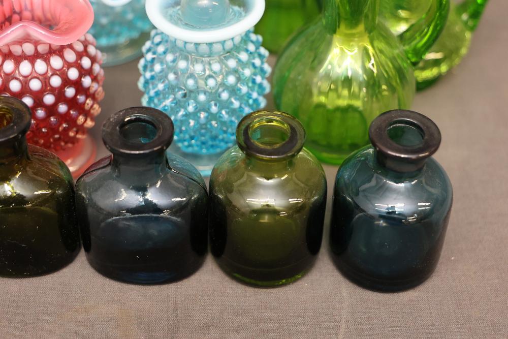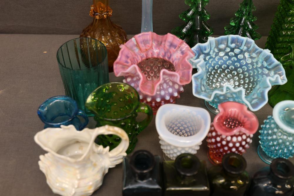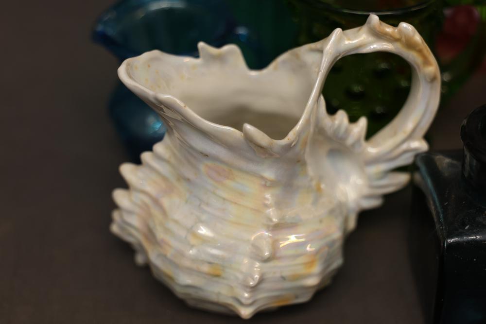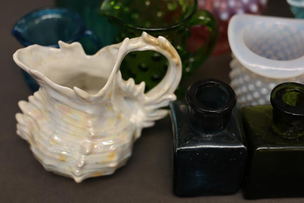 Glass and Ceramic Decorative Items. Includes multiple glass decorative items in various styles, colors, and shapes, as well as a ceramic shell-shaped pitcher marked on the bottom 'Royal Bayreuth Bavaria.' Items feature hobnail textures and vibrant colors, including green, pink, and blue. Pickup only.