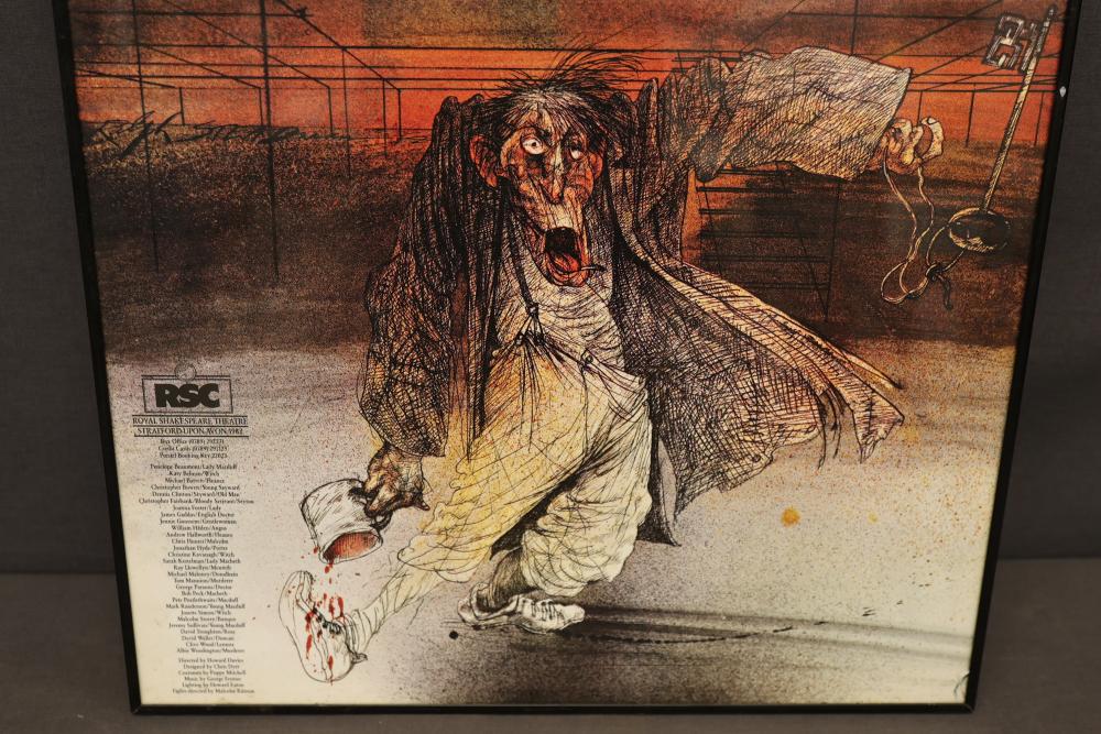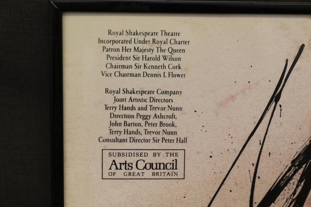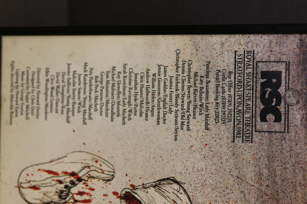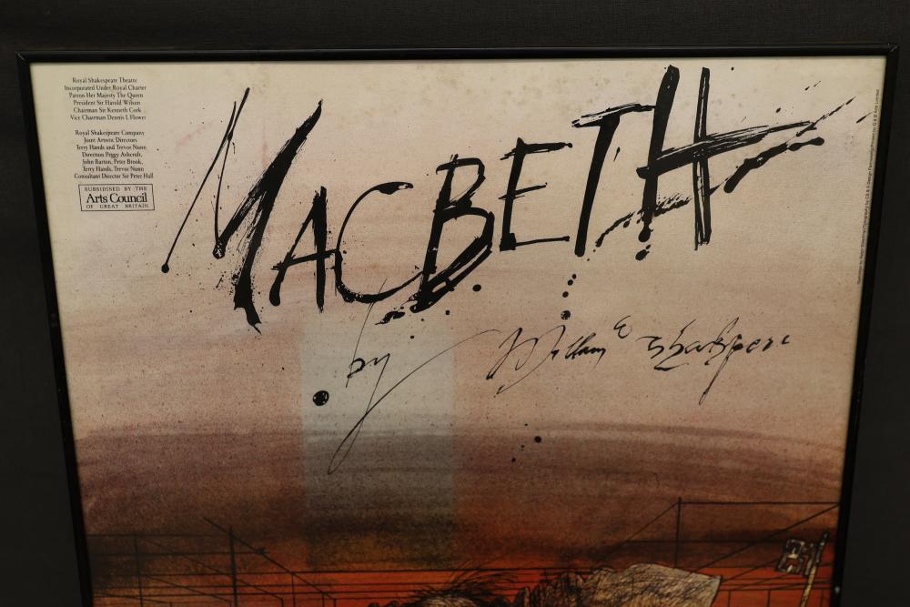Framed Royal Shakespeare Company Macbeth Poster Featuring Distinctive Artwork. This poster showcases a vivid artistic representation of the play and includes text detailing the Royal Shakespeare Company information and contributors. Framed and ready for display. Pickup only.
