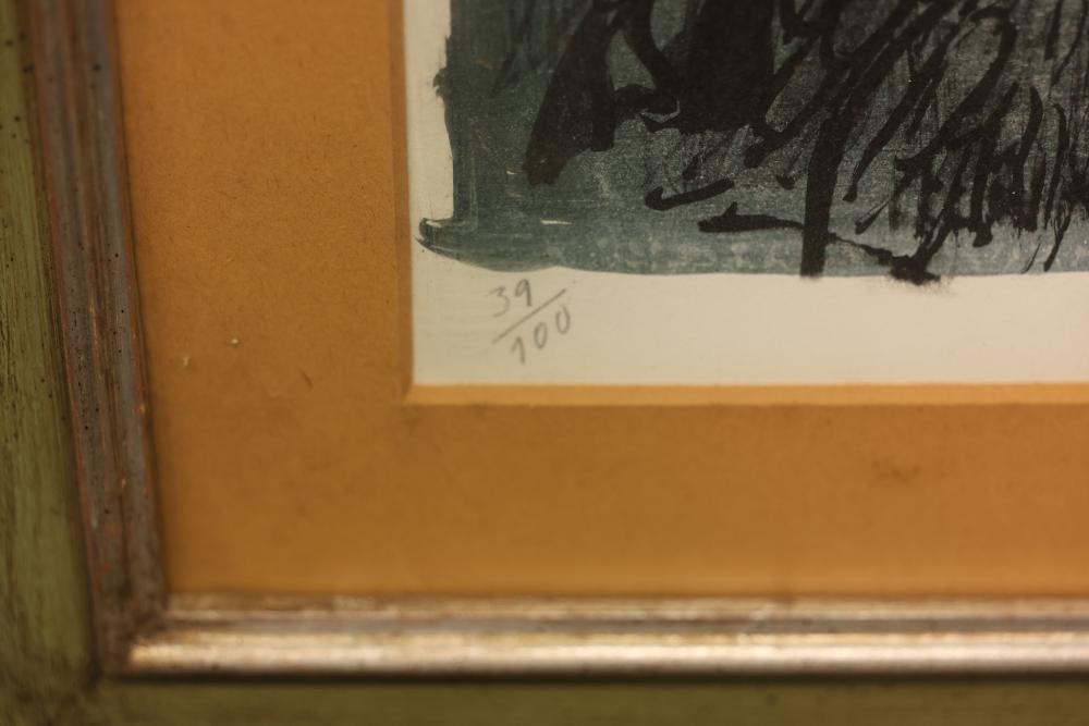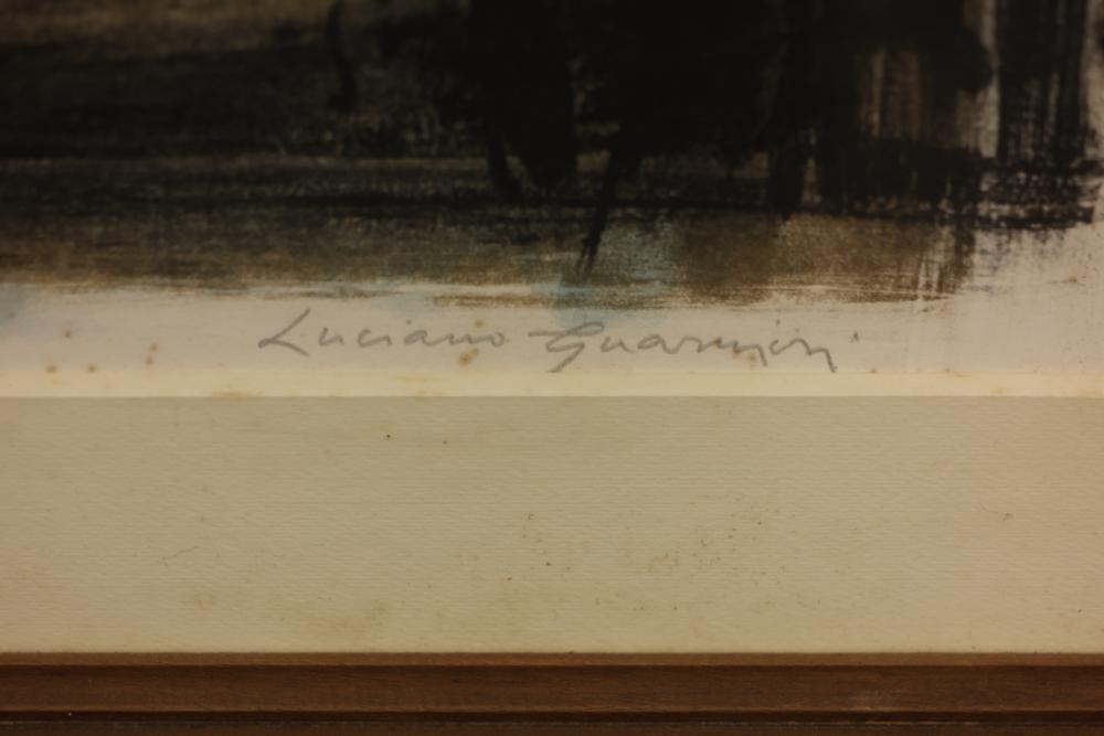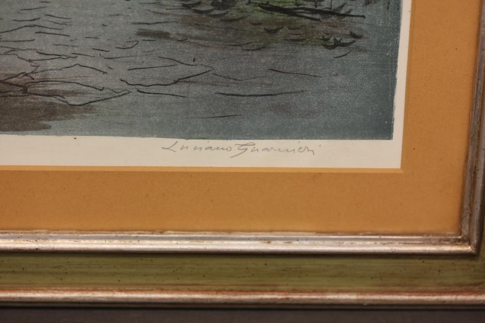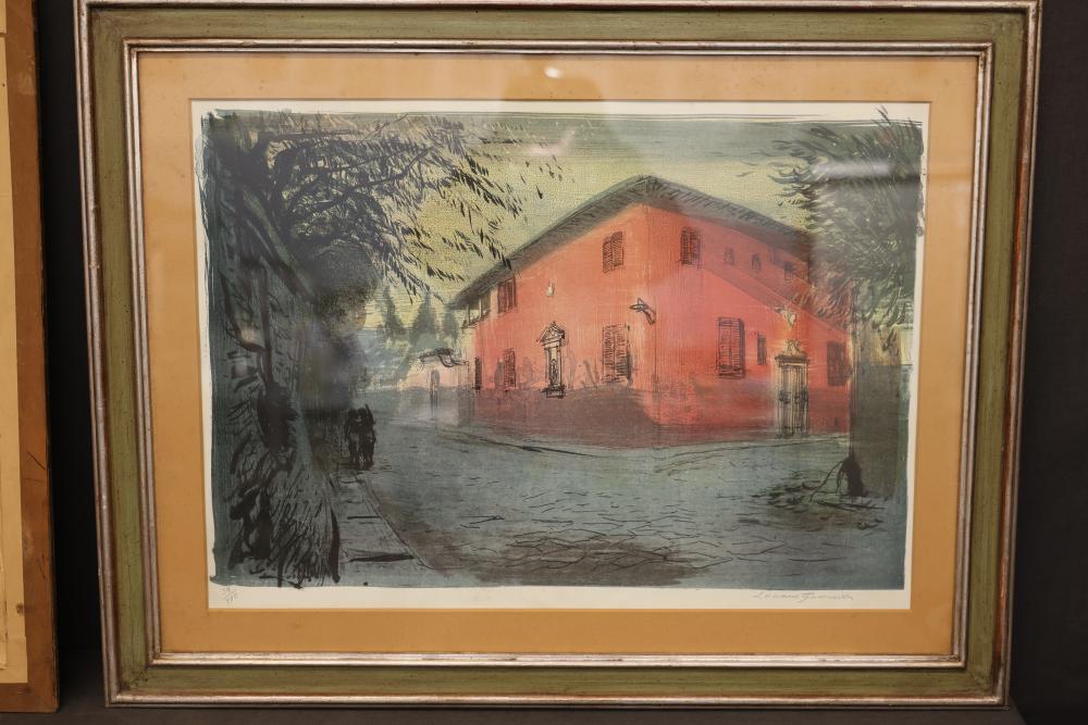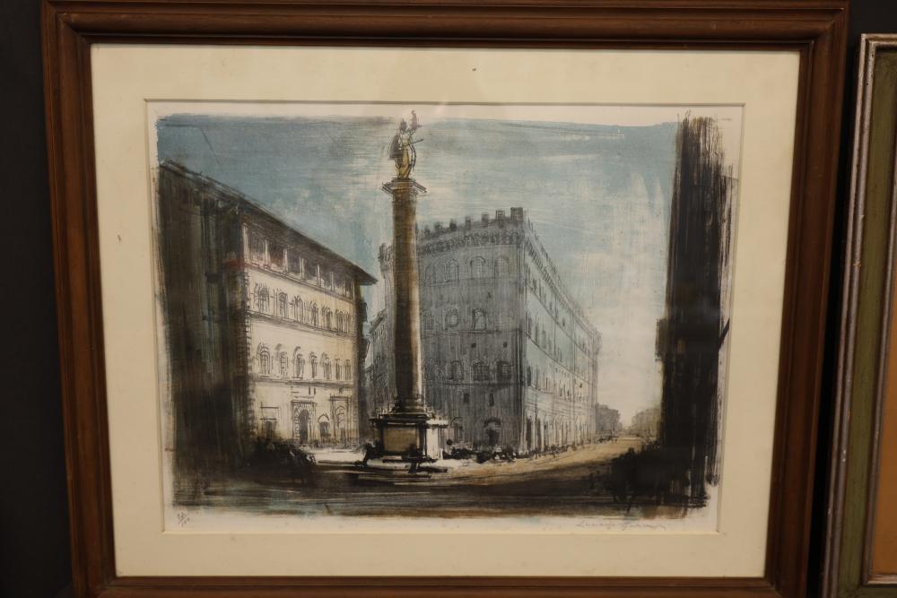 Luciano Guarnieri signed and numbered prints in frames. The artworks depict an urban scene centered on a column and a red building scene. Both prints are signed by the artist and numbered 39/100 and 17/100, respectively. Each is framed with matting and backing. Pickup only.