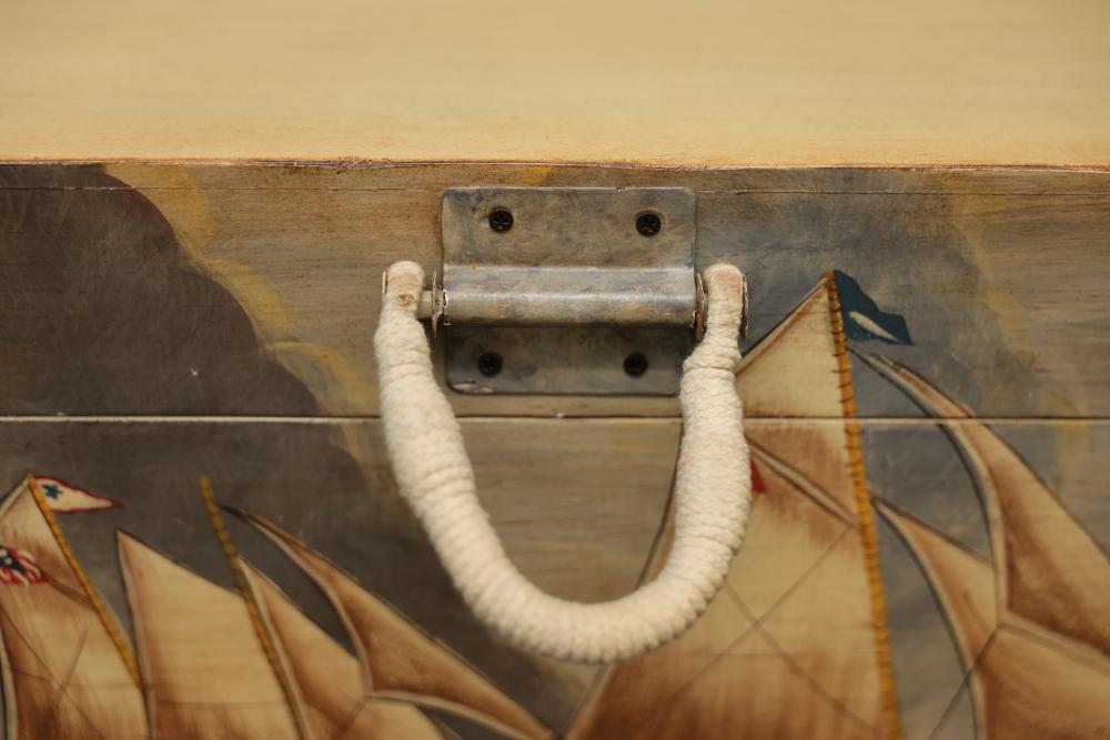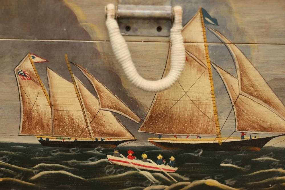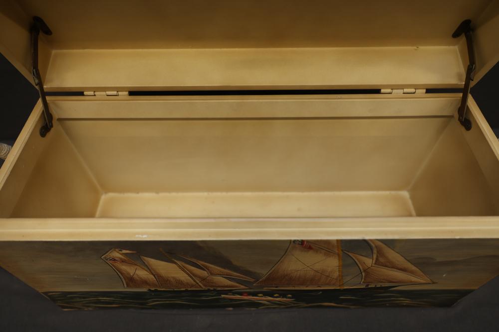 Hand-Painted Wooden Storage Chest with Nautical Scene. Features a lid with rope handles and metal hinges. Exterior displays a detailed depiction of sailboats and rowboats on water with a cloudy sky backdrop. Interior is unlined, offering an open storage compartment. Pickup only.