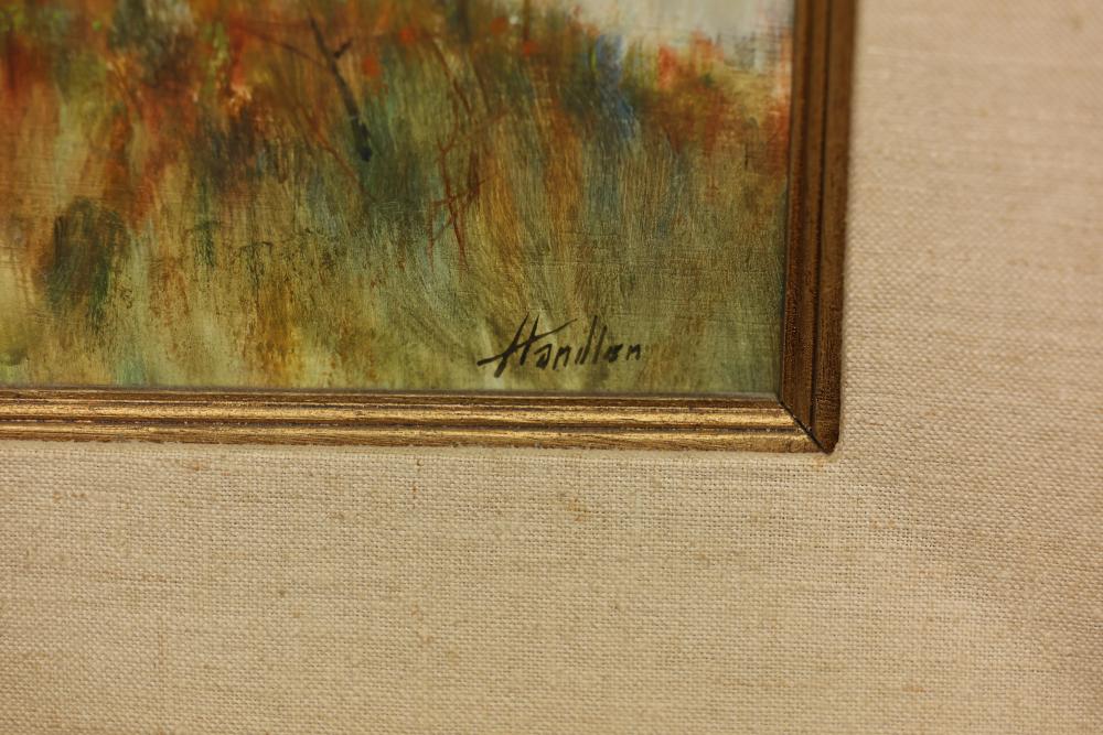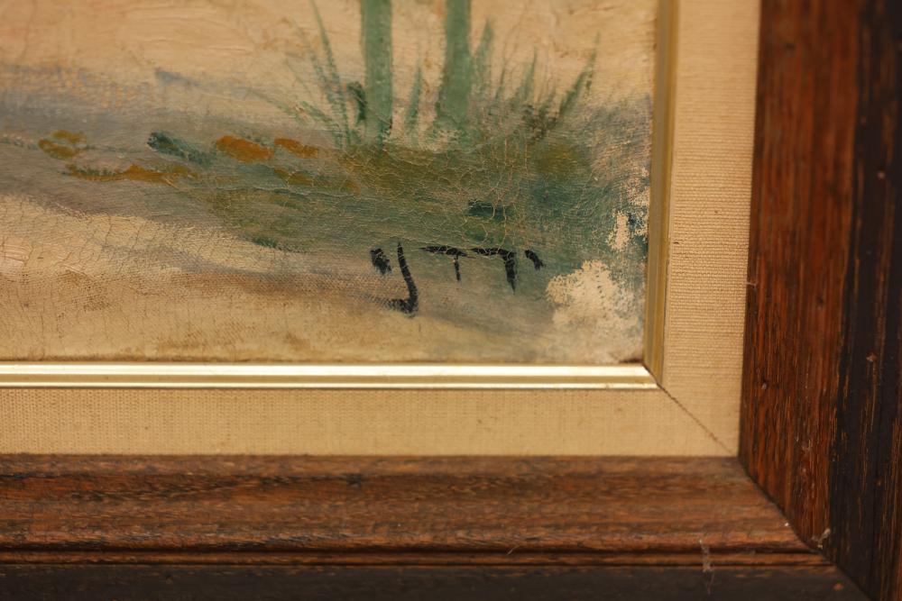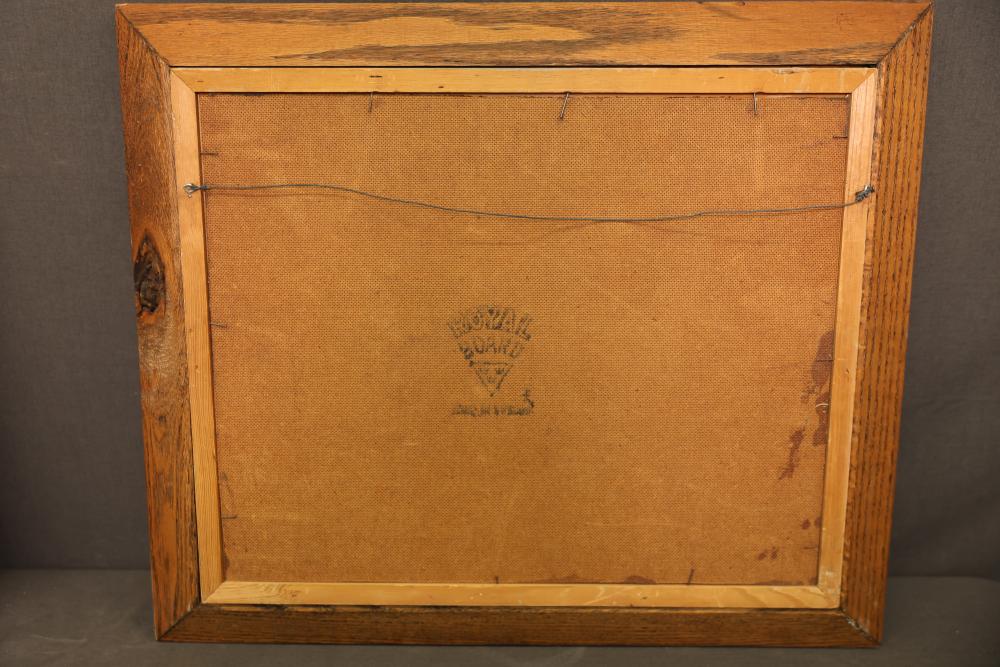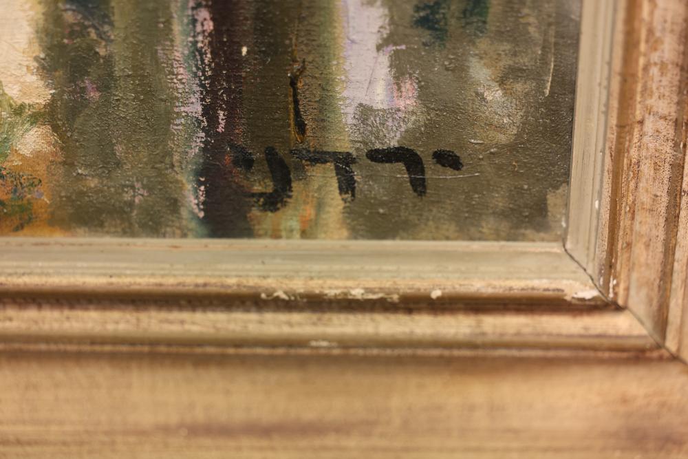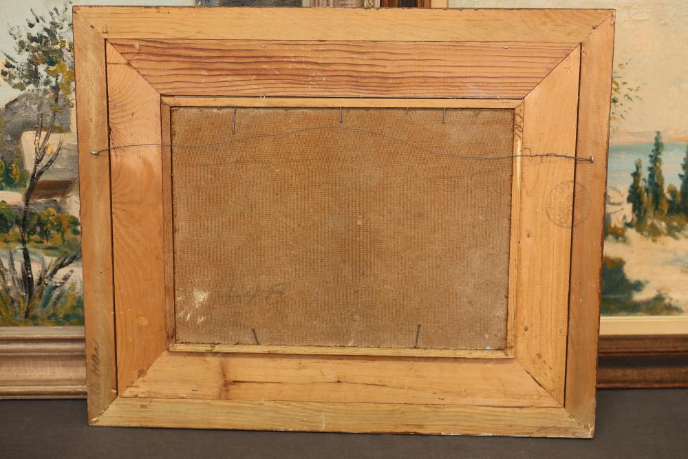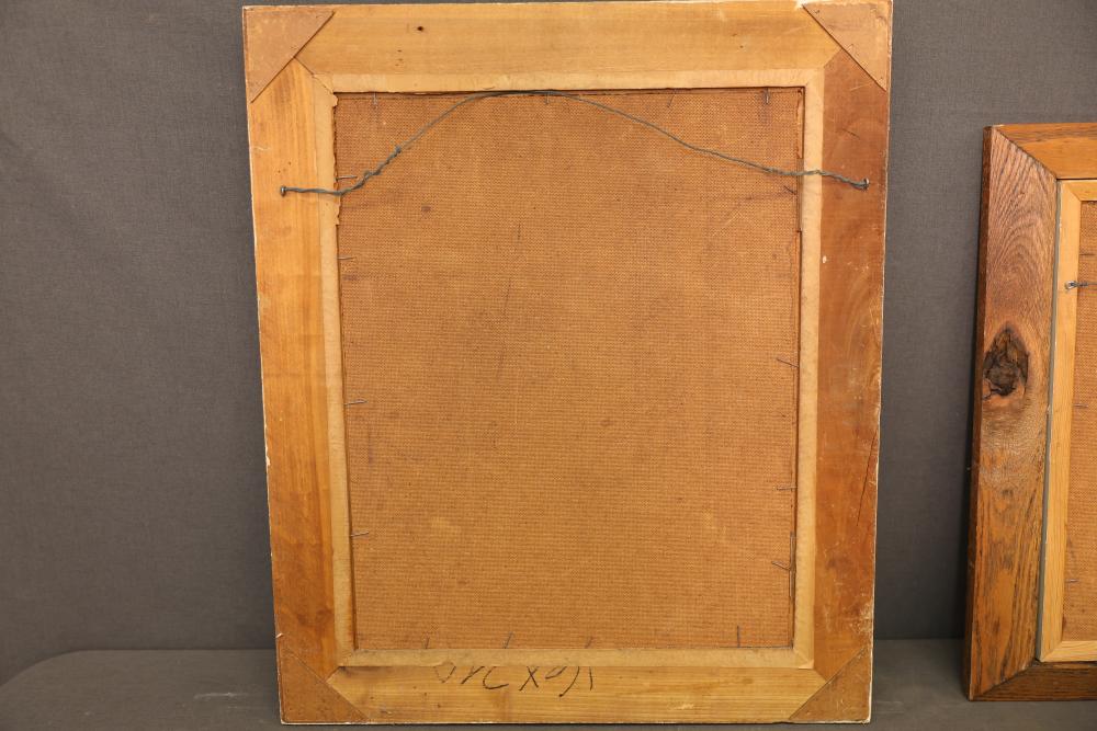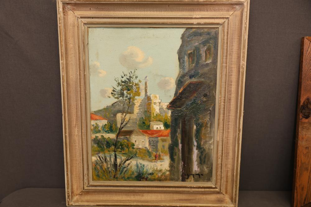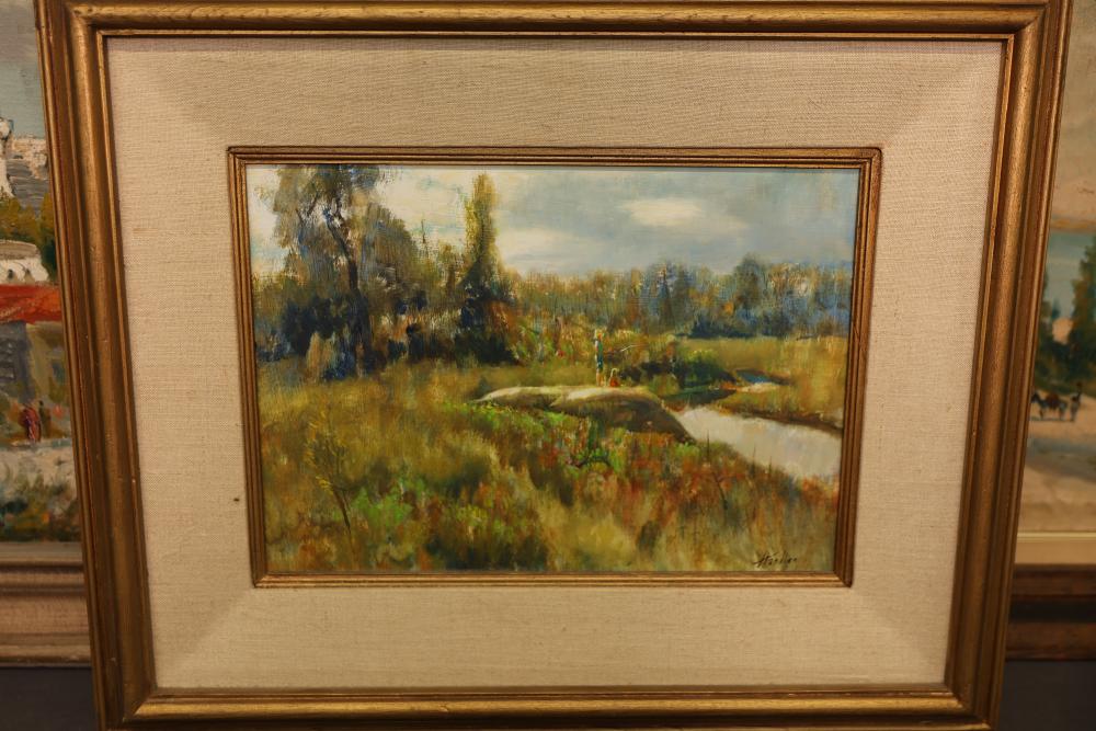 Framed Oil Paintings Depicting Landscapes with Figures and Architecture. Three framed oil paintings, each depicting unique pastoral or urban scenes in varied styles. One features a landscape with a village and distant spires, signed on the lower edge. The second illustrates a lush greenery view with a winding stream, also signed. The third presents a coastal scene with stylized trees, signed near the corner. All works are housed in wood frames and show varying usage wear. Pickup only.