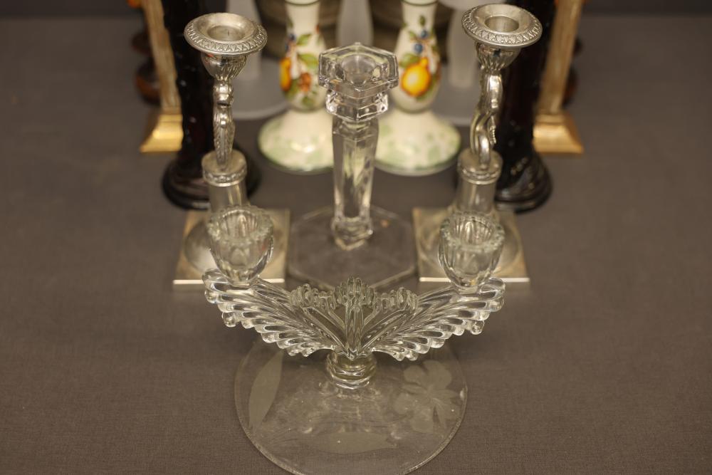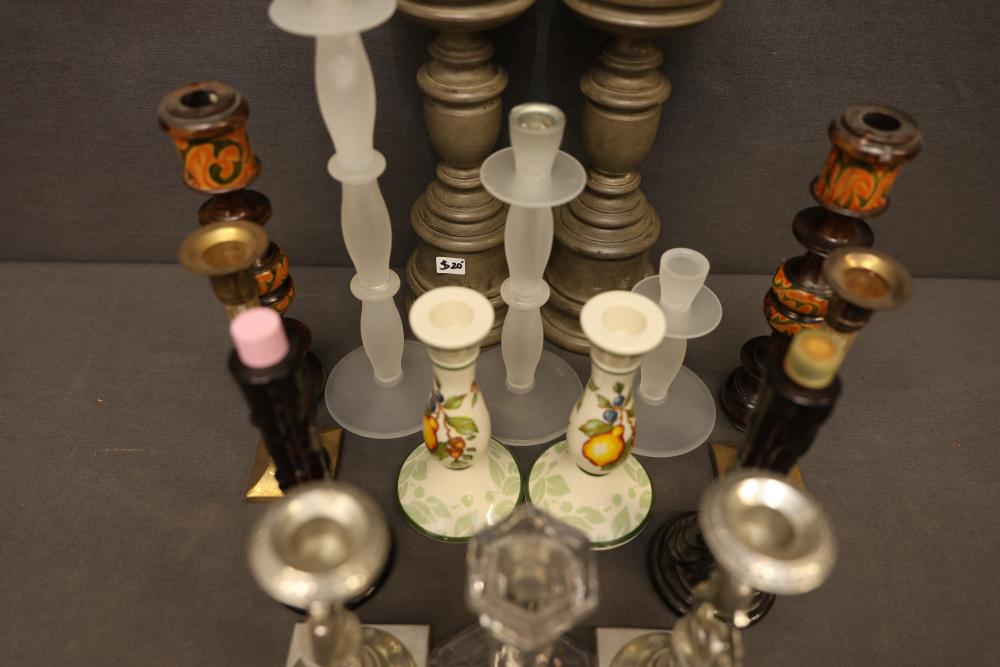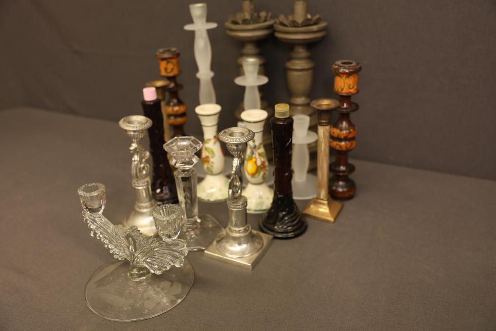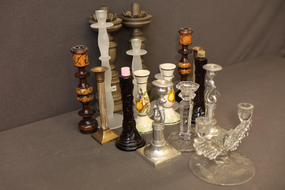 Candle holders in glass, metal, ceramic, and wood. Includes various designs and finishes, including frosted glass, silver-tone metal, hand-painted ceramic with fruit motifs, carved wood, and pressed glass. Several single holders and one double-light pressed glass holder. Pickup only.