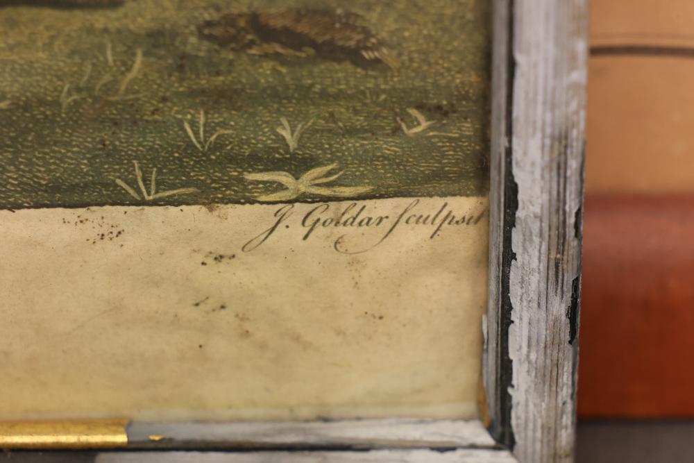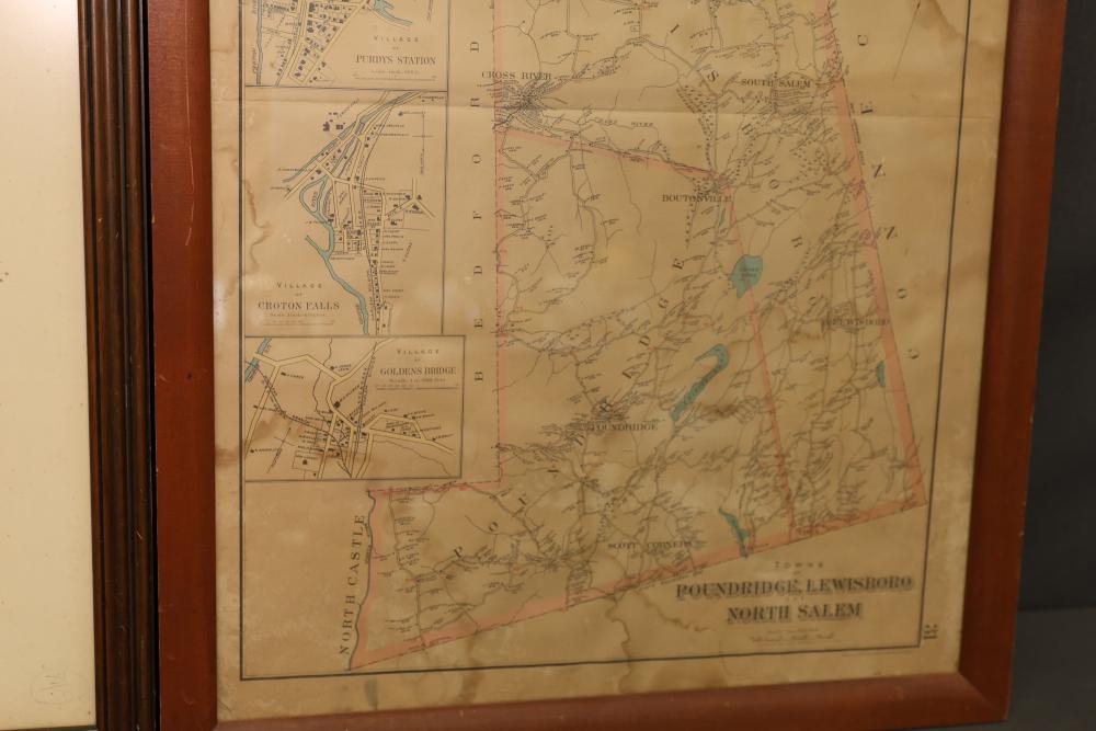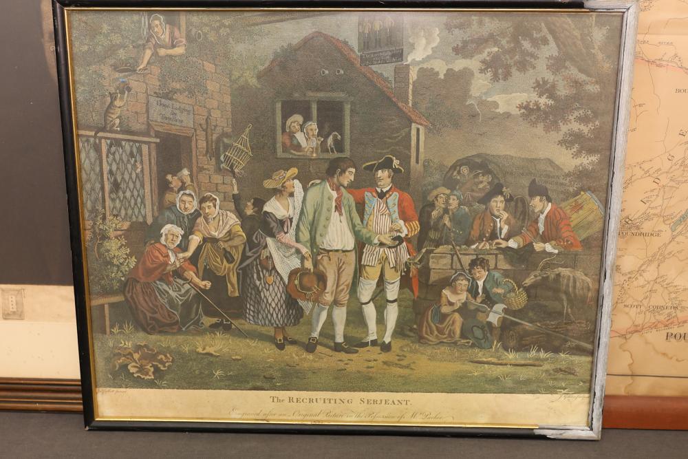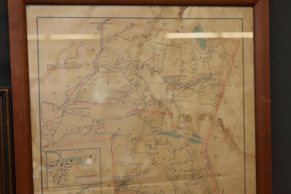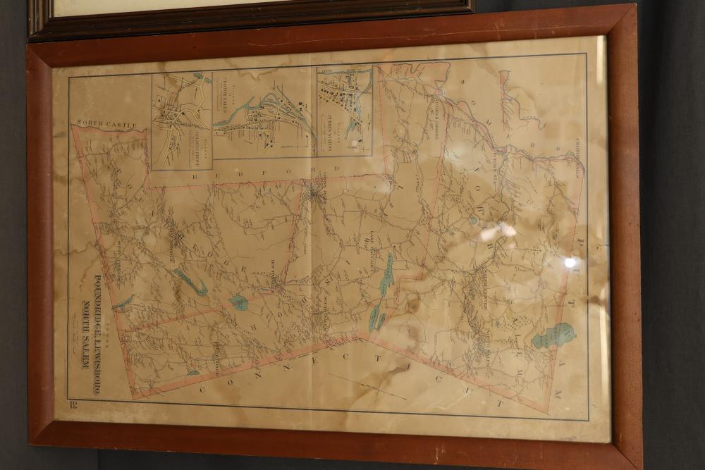 Three Framed Prints Featuring Jacques Reich and J. Goldar Works. Included are an artist's proof by Jacques Reich, a print titled "The Recruiting Sergeant" signed by J. Goldar, and a framed map labeled "Poundridge Lewisboro South Salem" with detailed geographic markings. Pickup only.