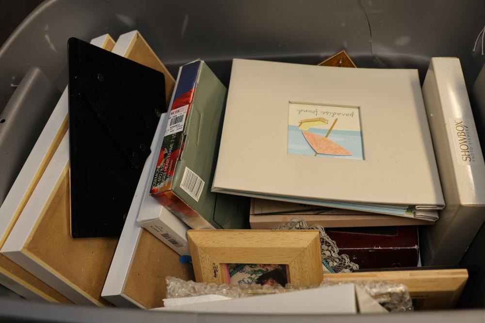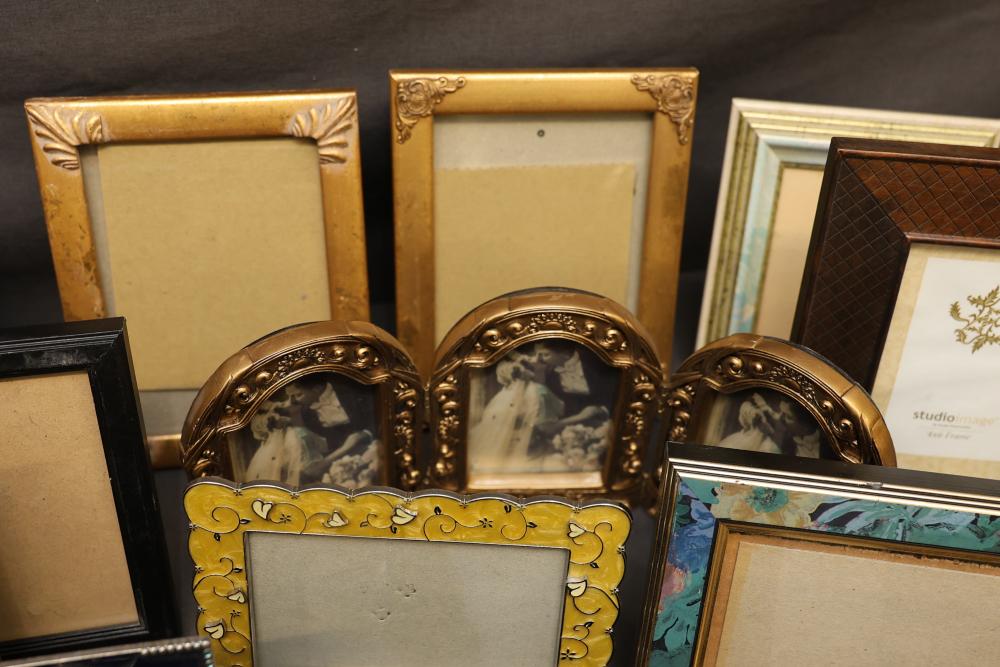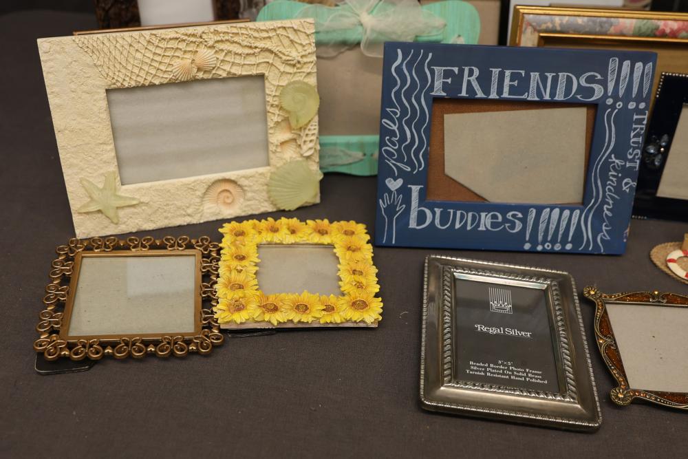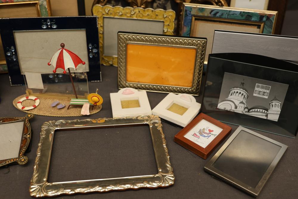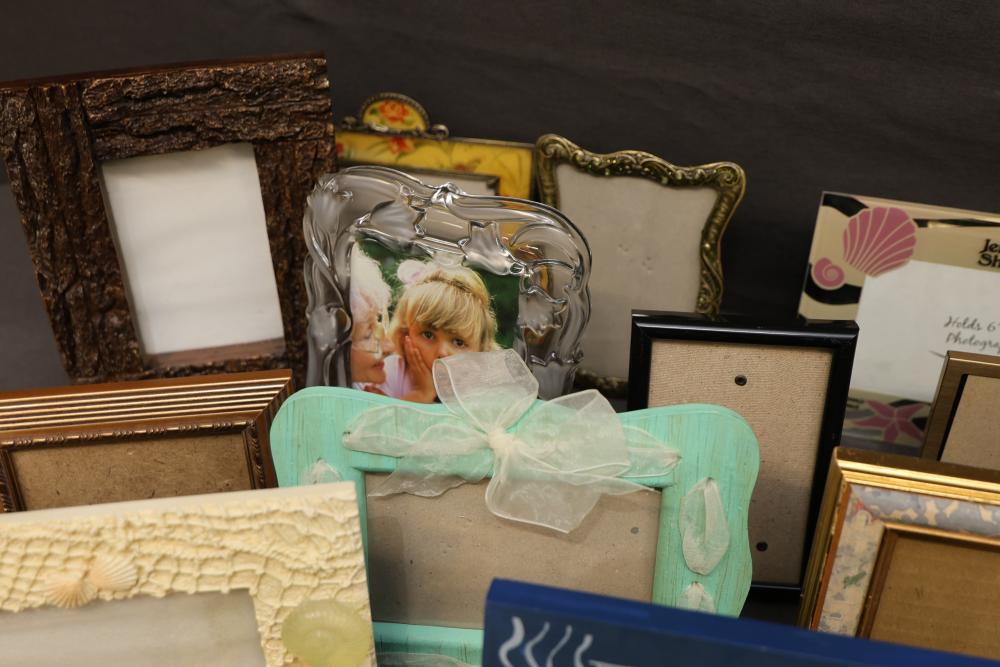 Over 40 Picture Frames in Various Sizes and Styles. Includes a mix of wooden, metal, plastic, and decorated frames with designs, shapes, and colors suitable for different display purposes. Frames include traditional, modern, and themed styles. Pickup only.