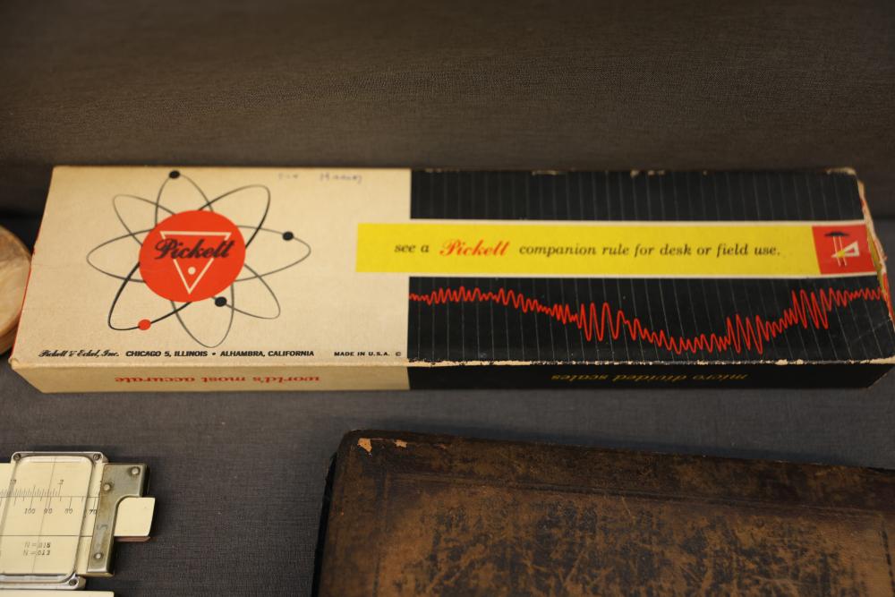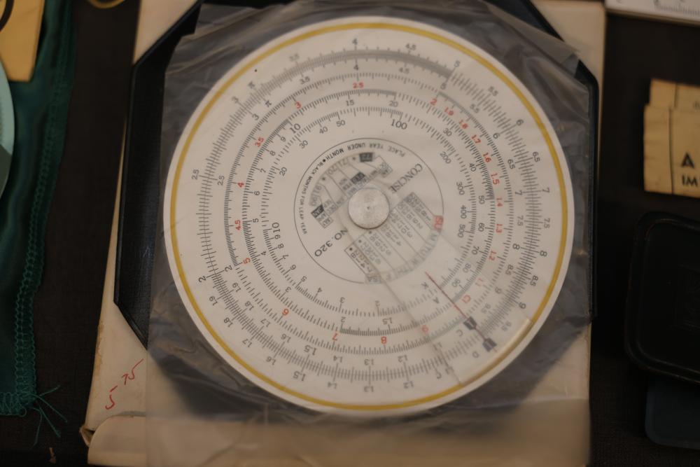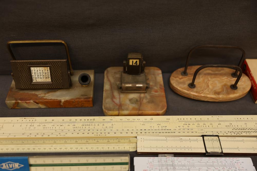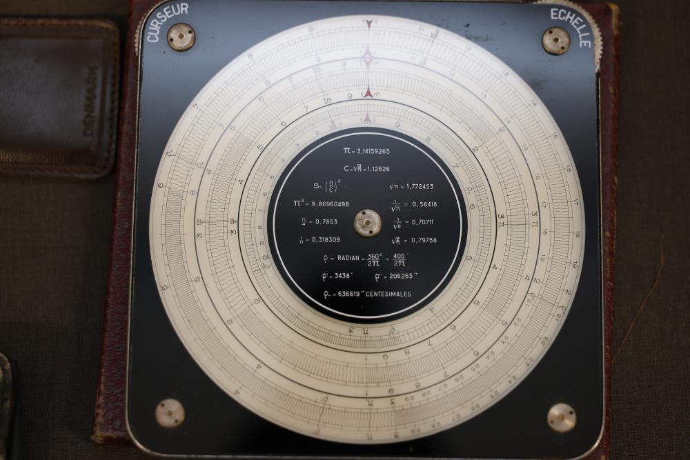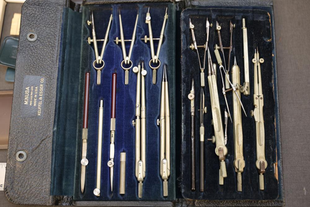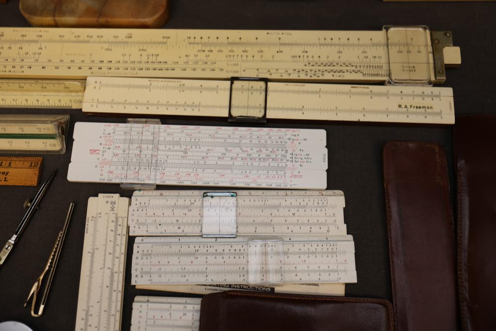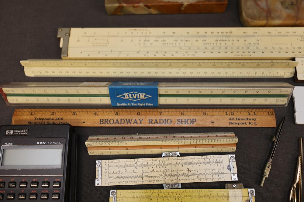 Slide rules, drafting tools, and circular slide rules with accessories, including multiple linear slide rules, circular slide rules, a set of drafting and compass instruments in a case, various instruction manuals, and a Bicmate circular slide rule with application guide. Items are shown with varied materials and scales. Pickup only.