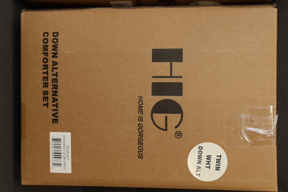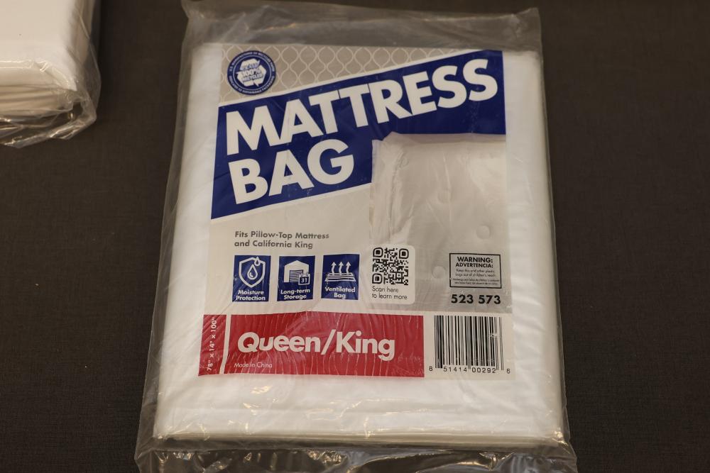 New in box bedding items including one down alternative comforter set for twin beds, sheet sets, and mattress bags. Items are sealed in original packaging. Comforter set box details include a twin white option. Mattress bags are suitable for queen and king mattresses. Pickup only.