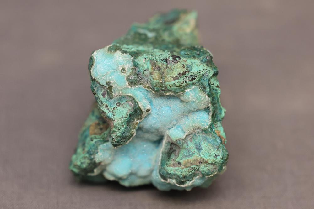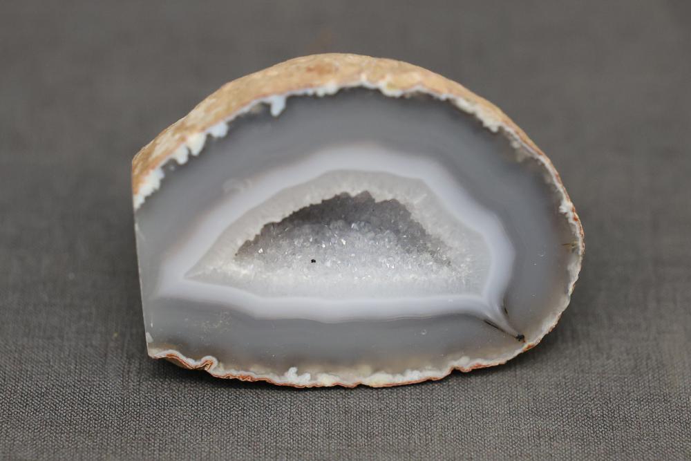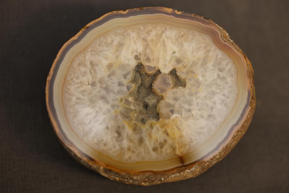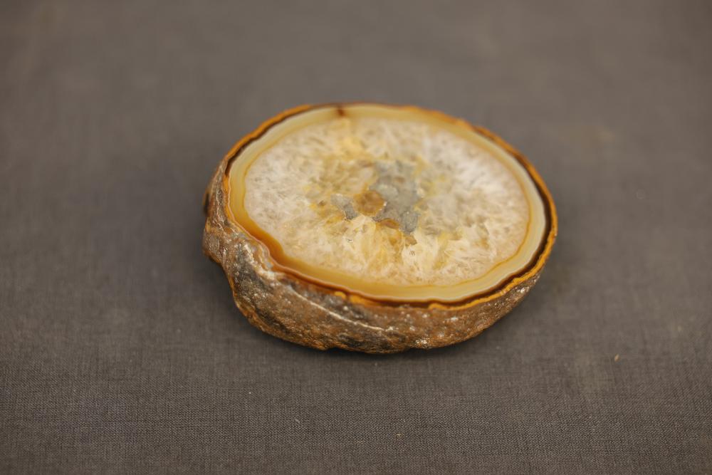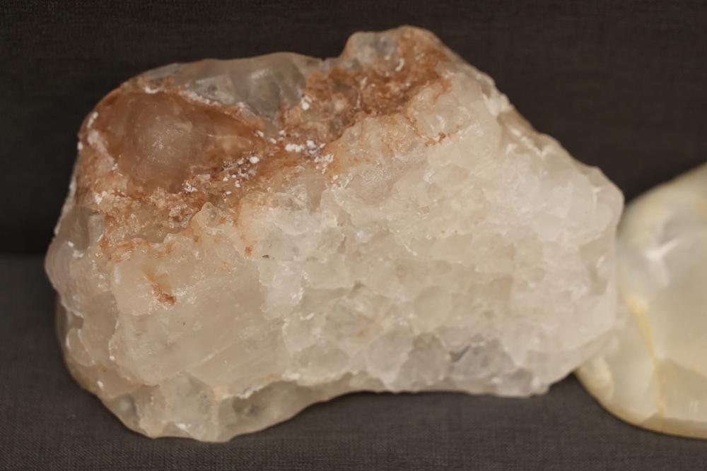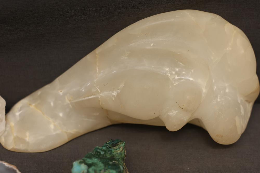 Mineral and geode specimens including a polished stone carving, a raw quartz fragment with natural crystalline textures, a polished agate geode slice with a crystalline center, and a rough green-blue stone specimen retaining rugged natural surfaces. Pickup only.