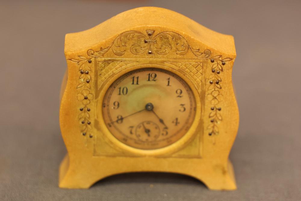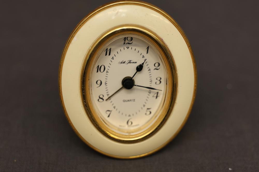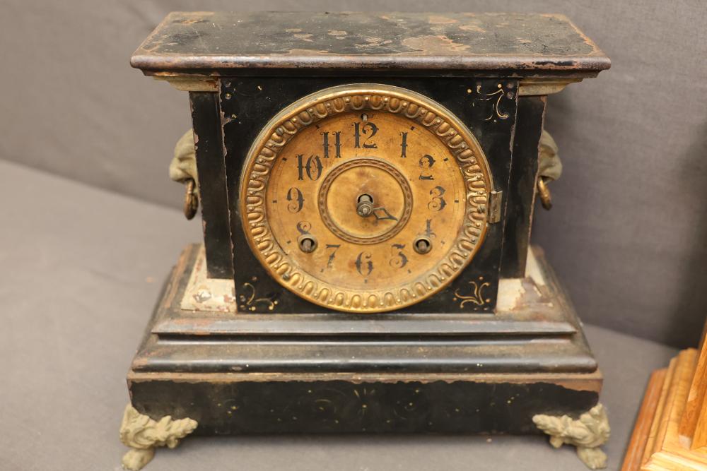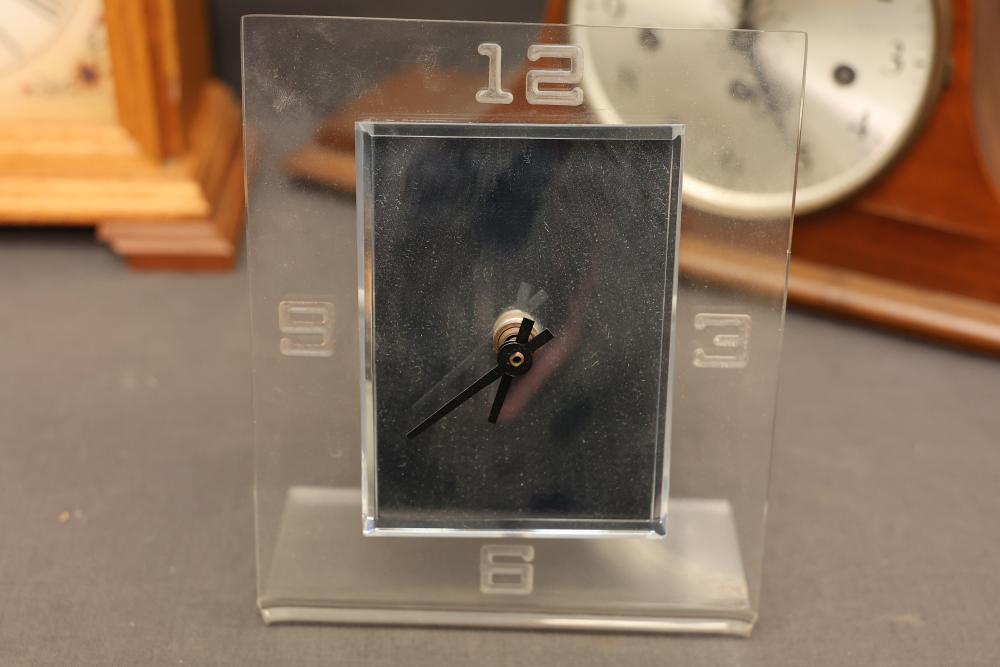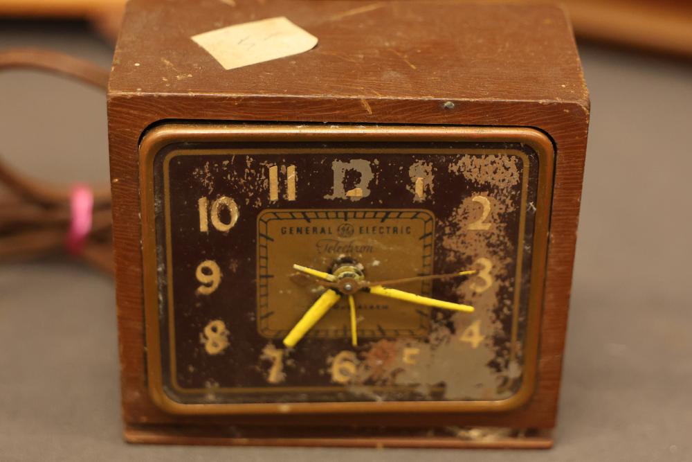 Table and Mantel Clocks Featuring Wooden Designs. This grouping includes timepieces showcasing diverse designs, from detailed wooden cases to glass and metal construction. Notable items encompass a General Electric clock with a manufacturer's label, a dual-column desk clock, and several other styles representing diverse aesthetics. Pickup only.