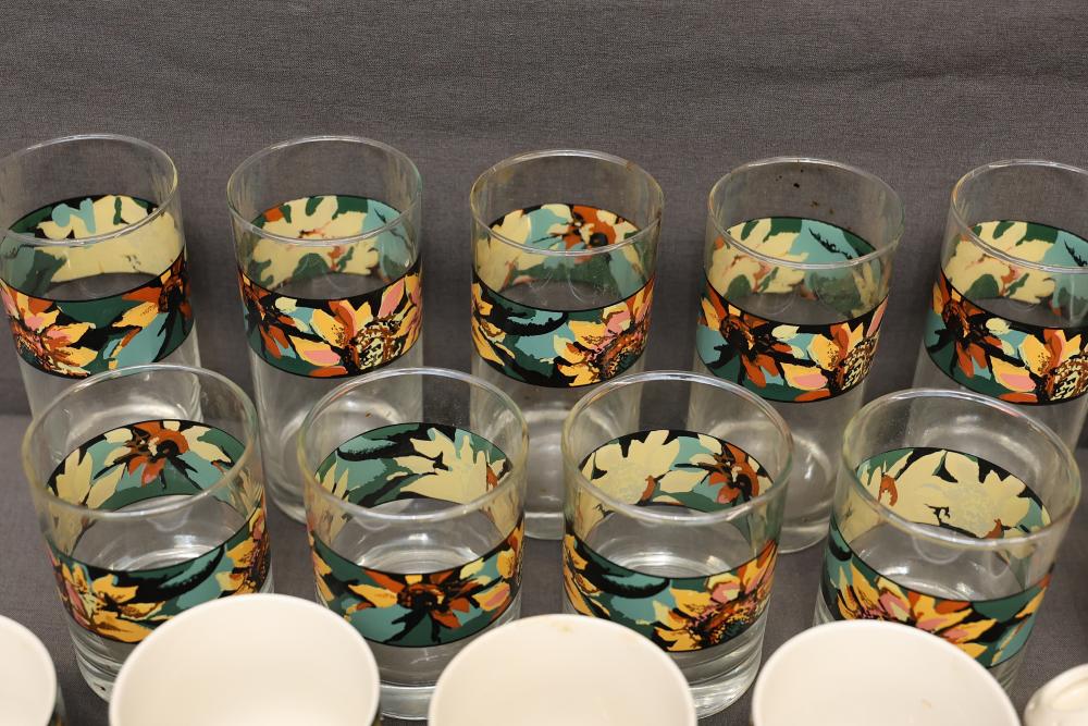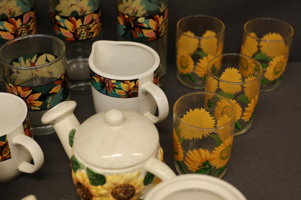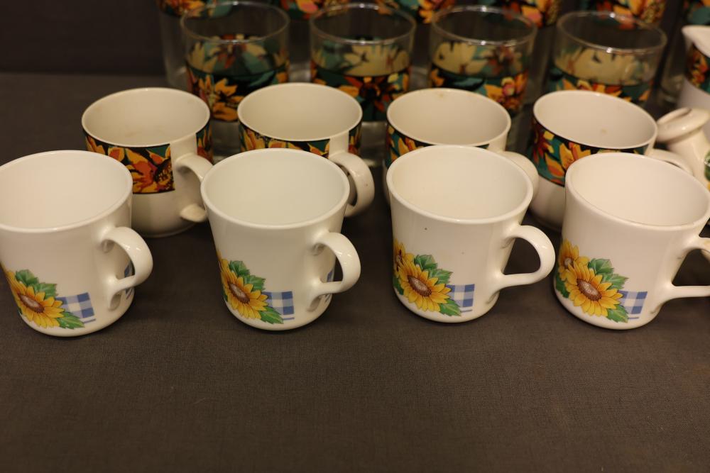 Sunflower-Themed Drinkware Set With Cups, Glasses, and Teapots. Includes ceramic cups with sunflower designs, glass tumblers featuring sunflower motifs, a ceramic teapot, a milk pitcher, and a small sugar container. Pickup only.