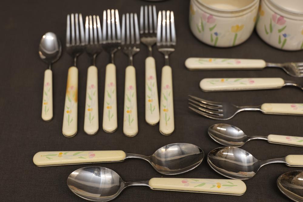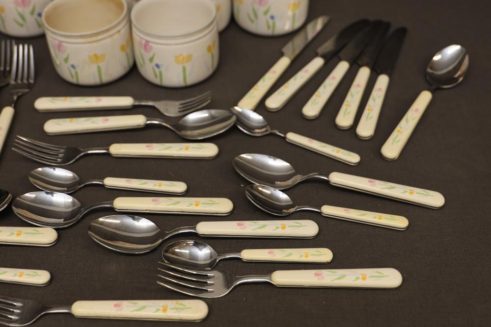 Floral Ceramic and Cutlery Dinner Set with Pastel Handles. Includes ceramic cups, a sugar container, a milk jug, and a selection of cutlery with floral-patterned handles. Pieces feature a matching floral design. Pickup only.