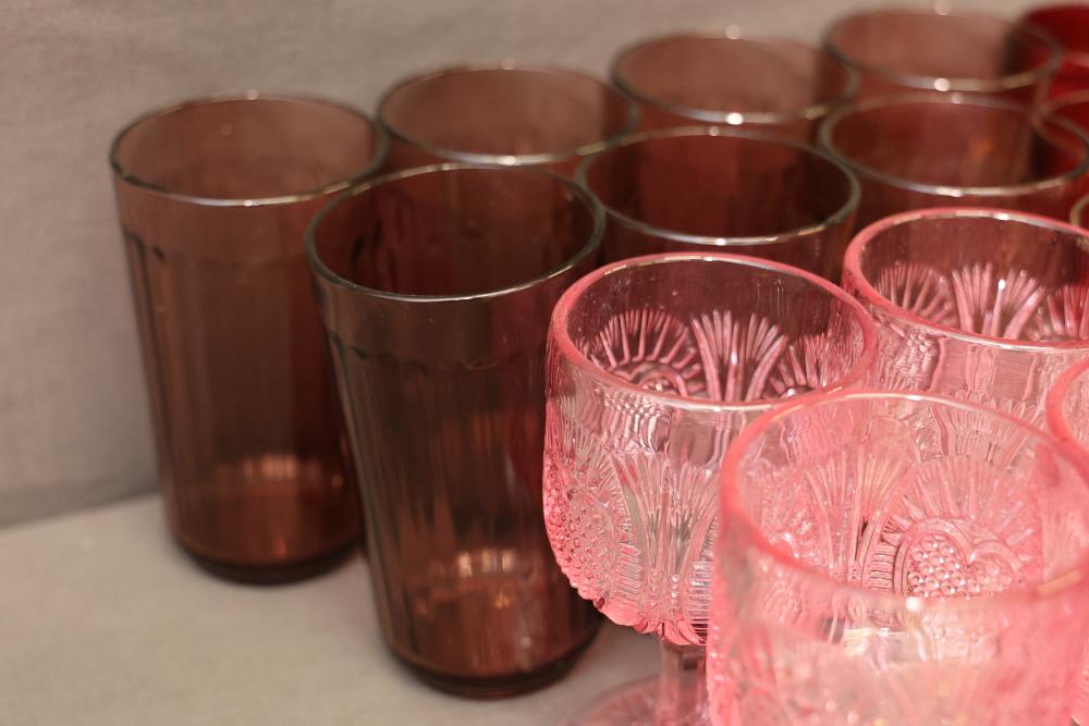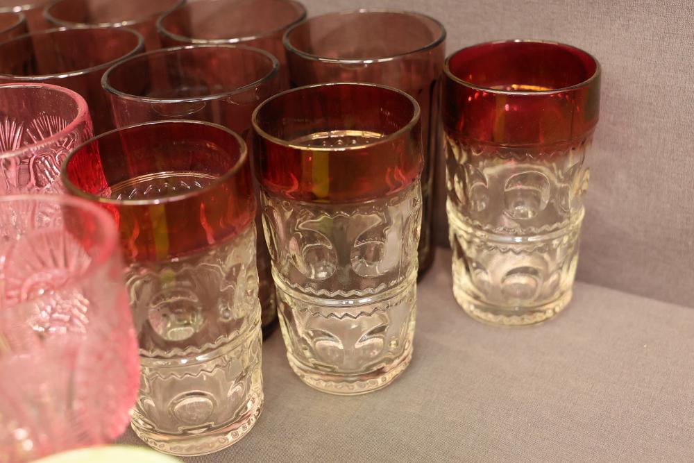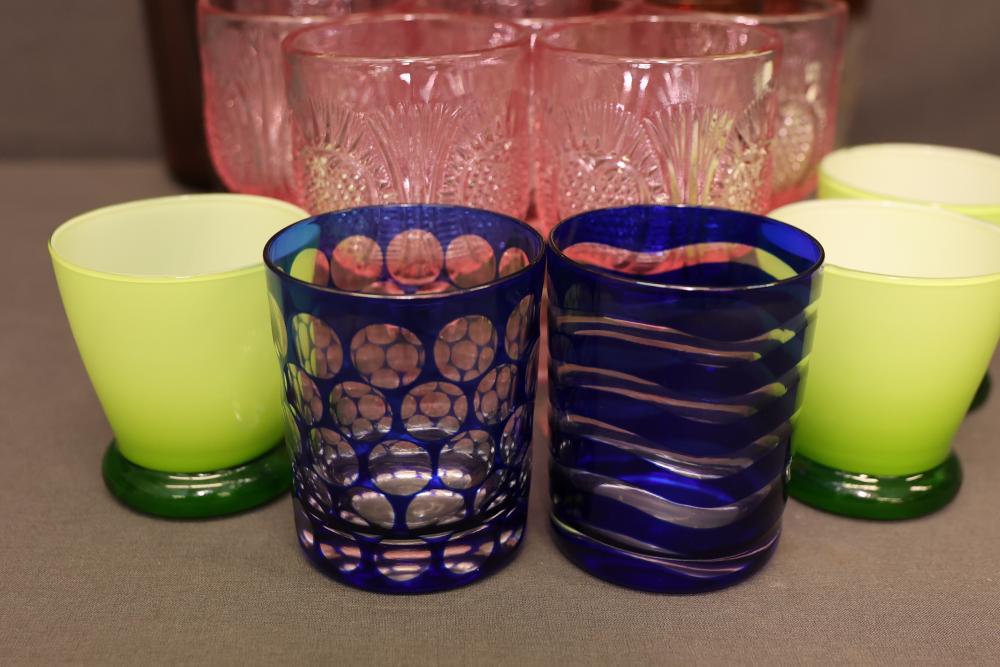 Colored Glasses With Decorative Patterns. A group of glasses in varying colors, including pink, blue, green, and brown tones, with distinct decorative patterns and designs such as embossed details and stripes. Pickup only.