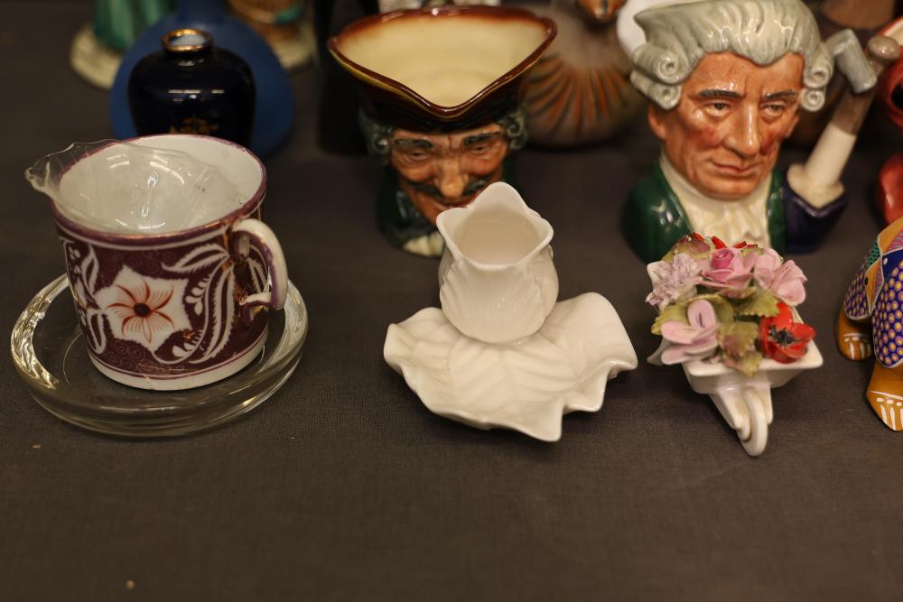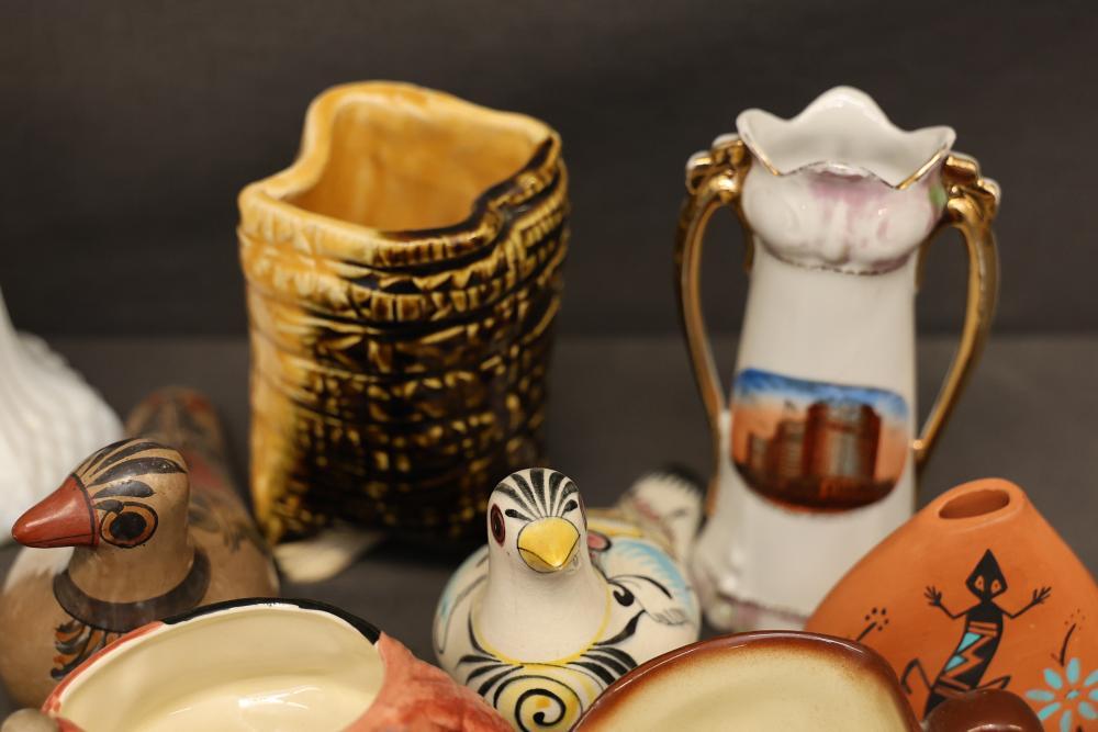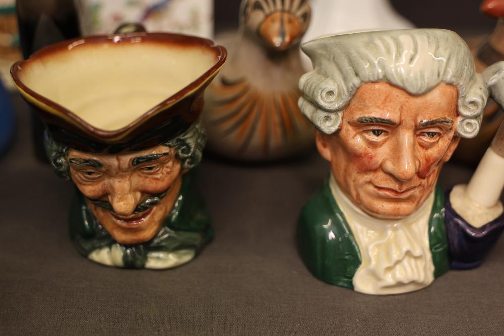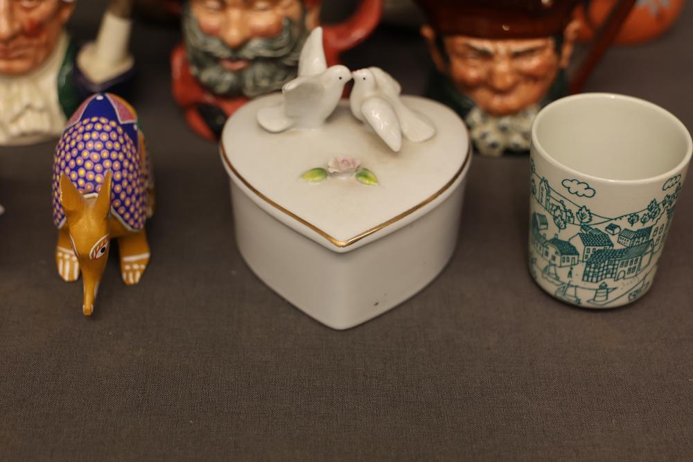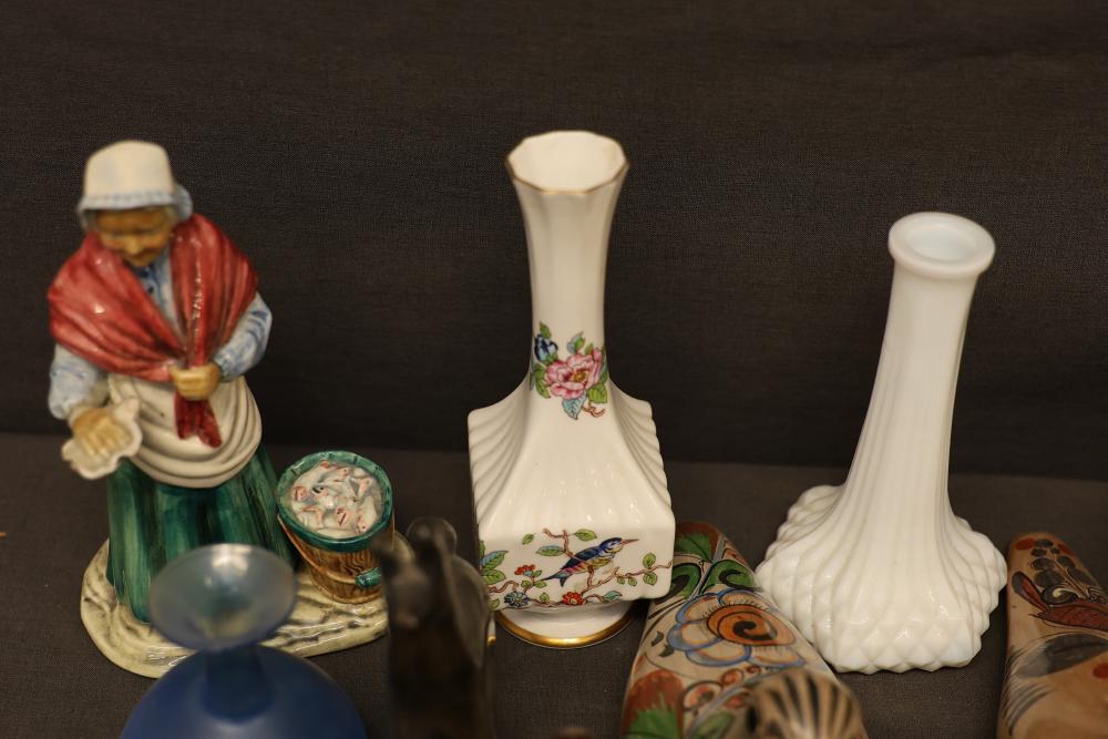 Decorative Ceramic and Porcelain Figurines, Mugs, and Plates, including themed mugs, decorative plates with images of countryside scenes, and figurines of various designs. Pickup only.