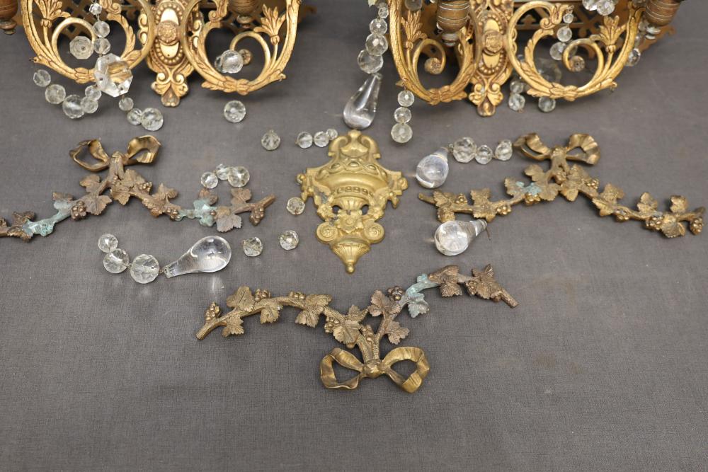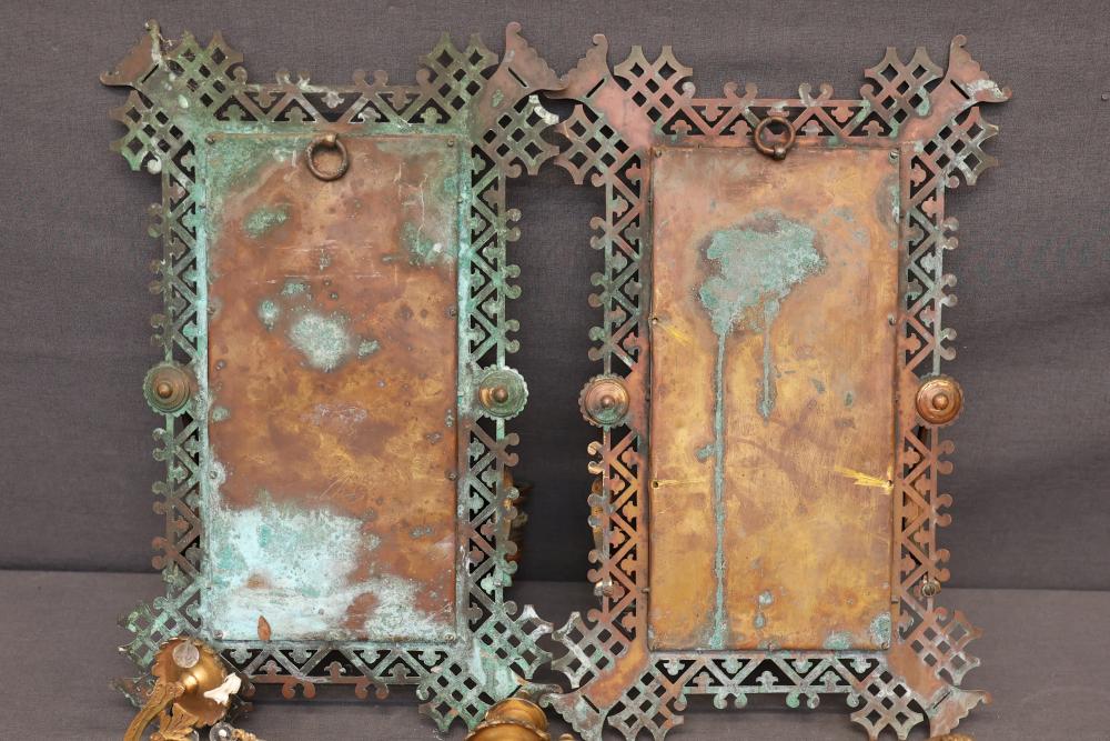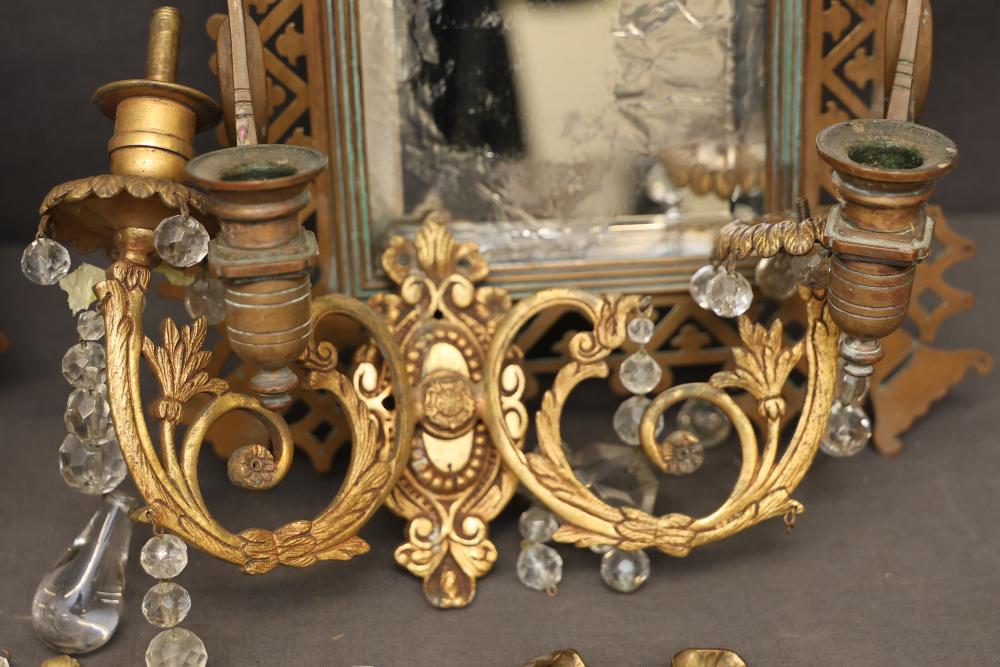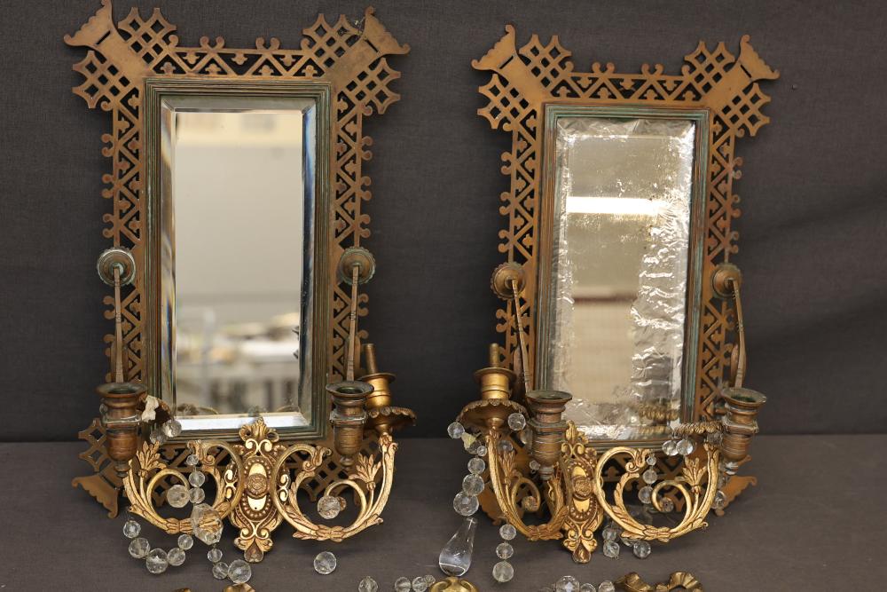 Gilt bronze mirrored wall sconces with intricate lattice-designed frames. Each sconce features dual candleholders and is decorated with crystal accents. The mirrors show noticeable wear, patina is present, and some crystal pieces are detached or missing. Pickup only.