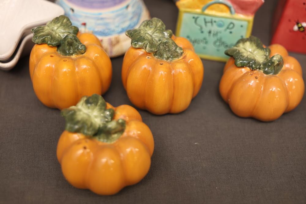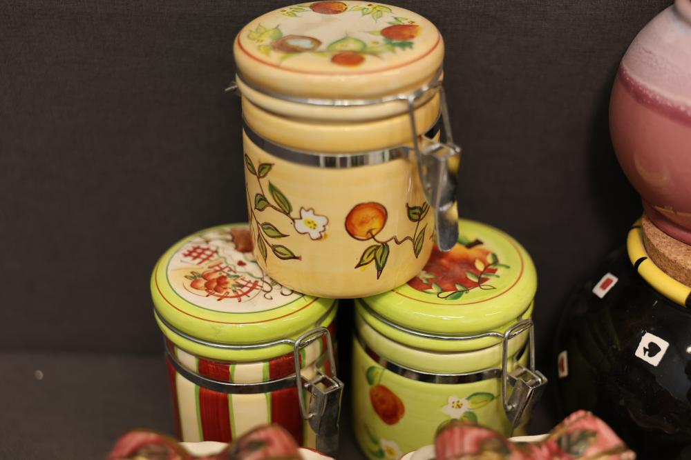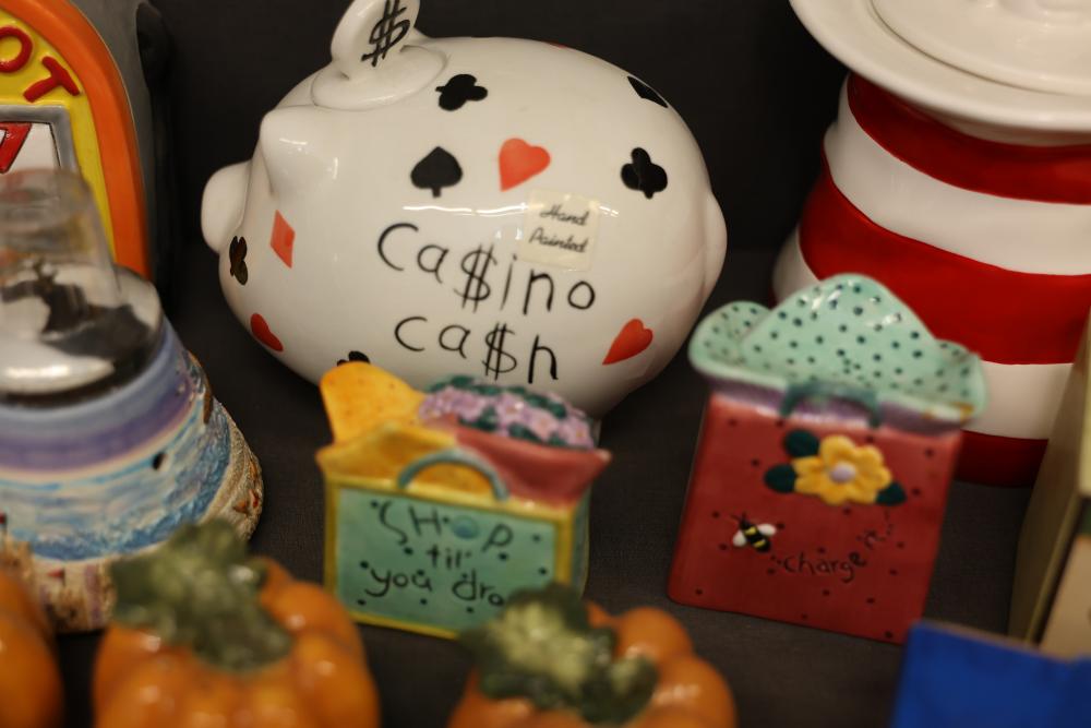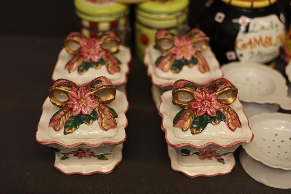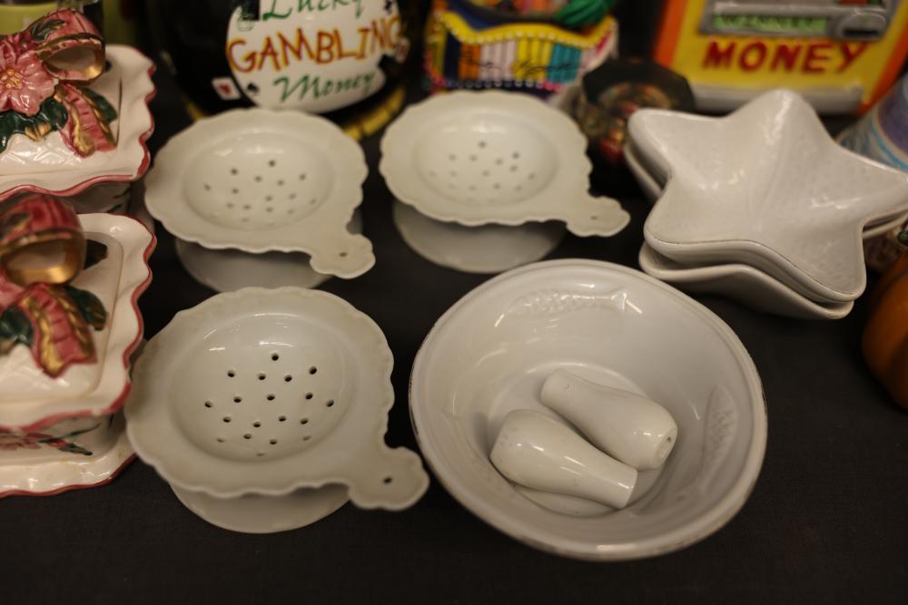 Ceramic items including piggy banks designed with casino and jackpot themes, a Cat in the Hat figurine, pumpkin-shaped salt and pepper shakers, floral-themed trinket boxes with bows, lidded jars with fruit patterns, ceramic strainers, star-shaped plates, and more decorative pieces. Pickup only.