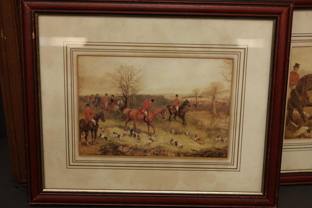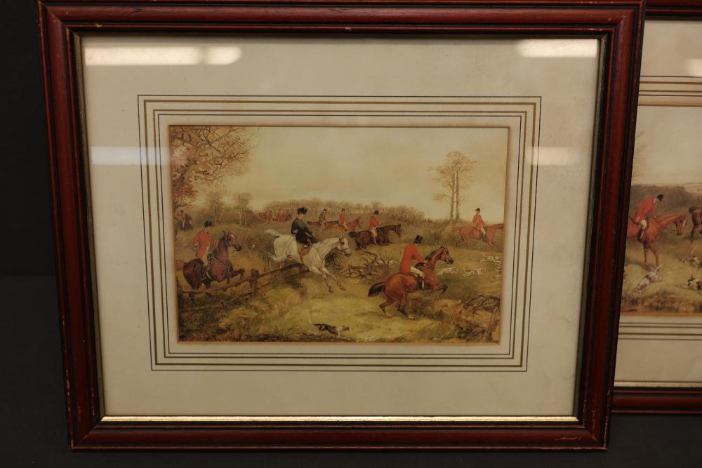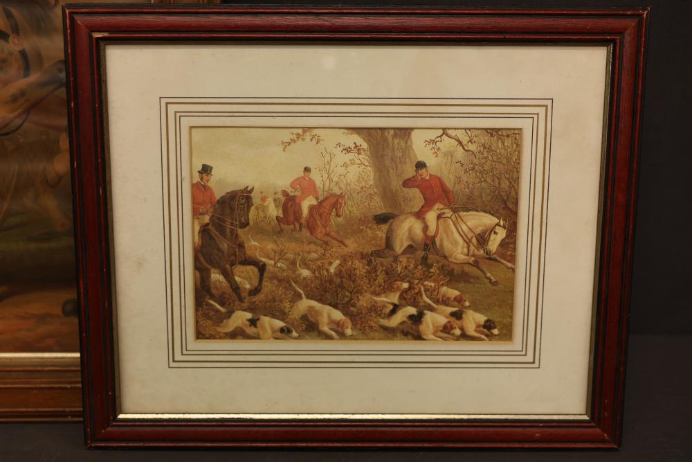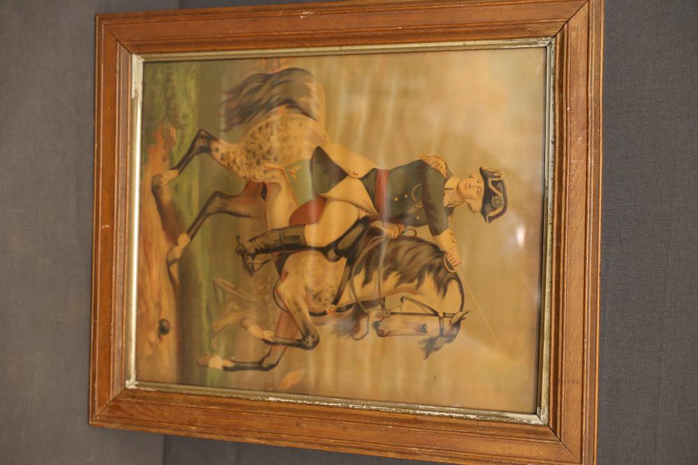 Framed prints including equestrian scenes and military-themed artwork. One piece depicts a historical military figure on horseback, signed 'F. Gleason, Boston.' The other three frames feature equestrian hunting scenes with riders and hounds. Frames exhibit wear consistent with prior use. Pickup only.