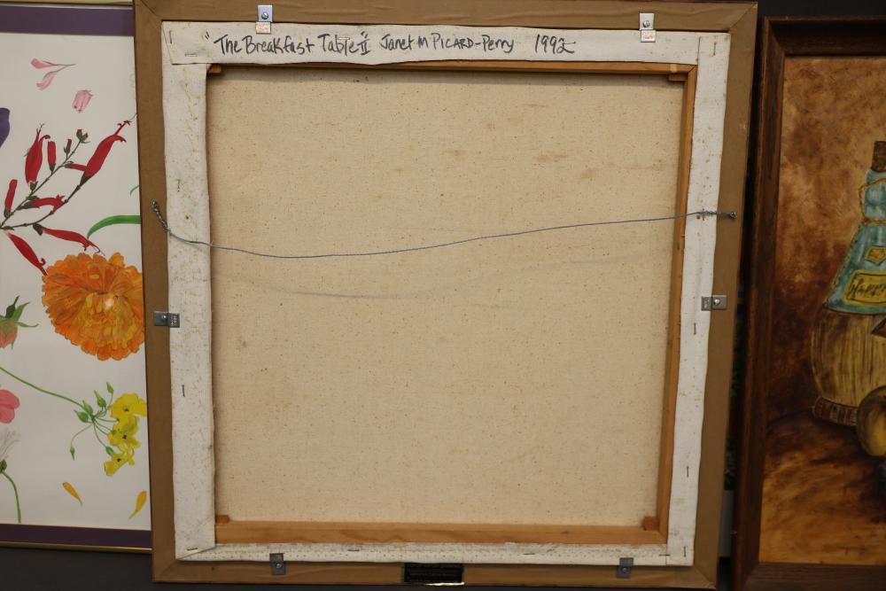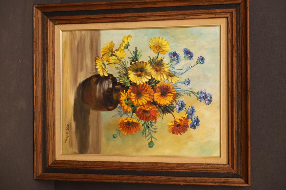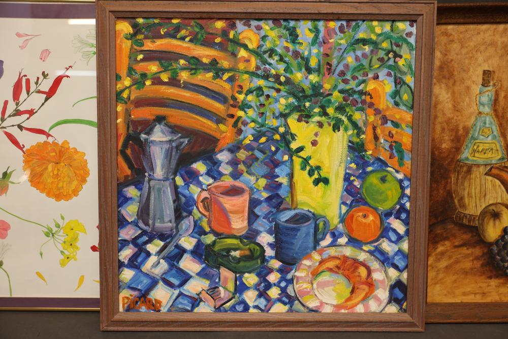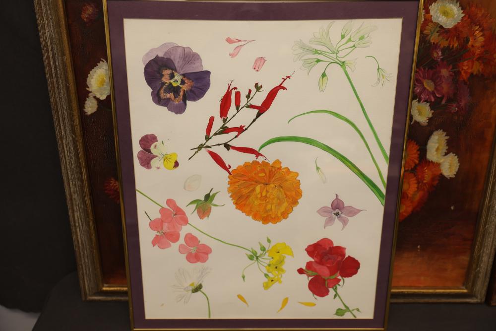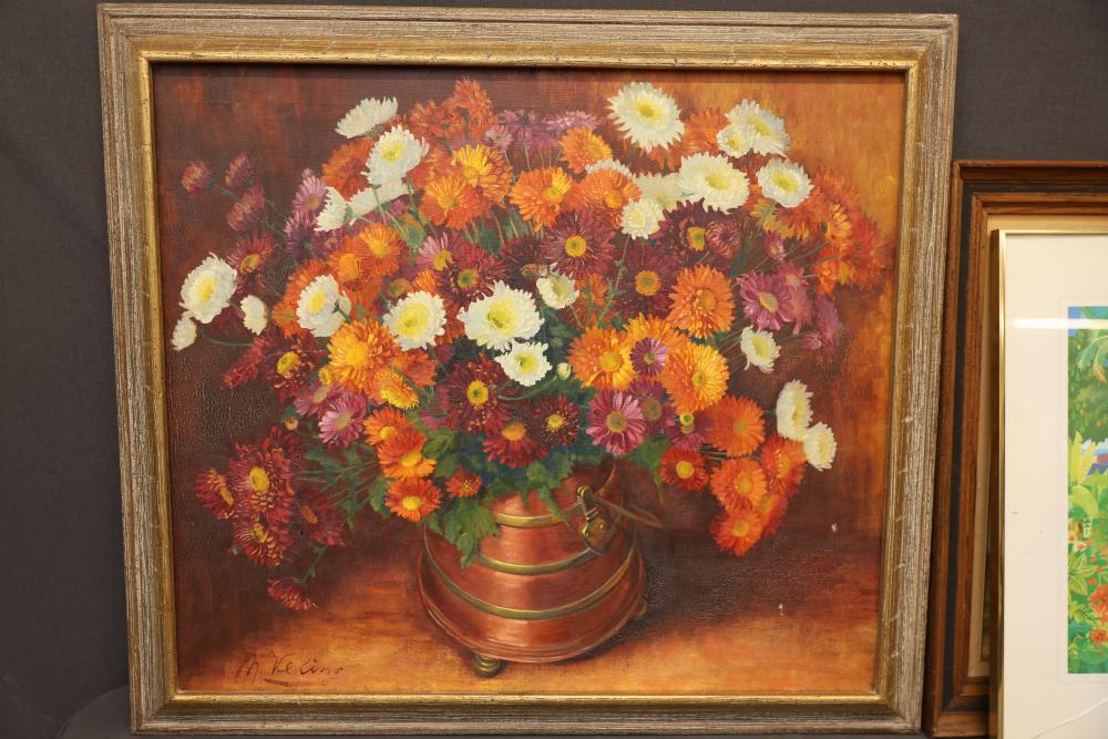 Framed Artwork Assortment, Including Signed Floral and Still Life Paintings. A collection of framed pieces featuring various styles, including signed works by artists Jim Barker (1988), J.E. Greenleaf, Picard, and M. Veling. Subjects include floral arrangements and still life compositions, with vibrant and detailed designs. Mixed media and frames show signs of handling and wear. Glass frame for isle of enchantment is cracked. Pickup only.