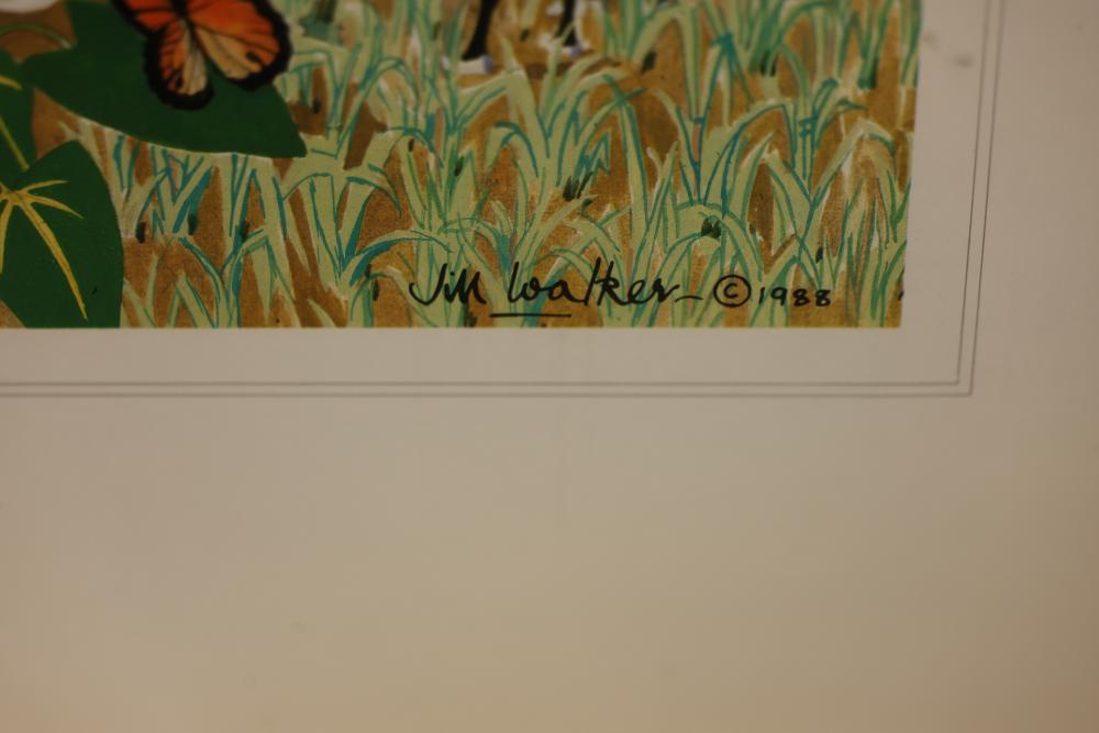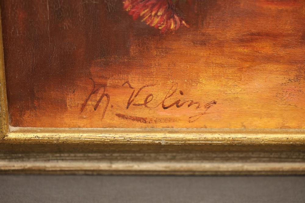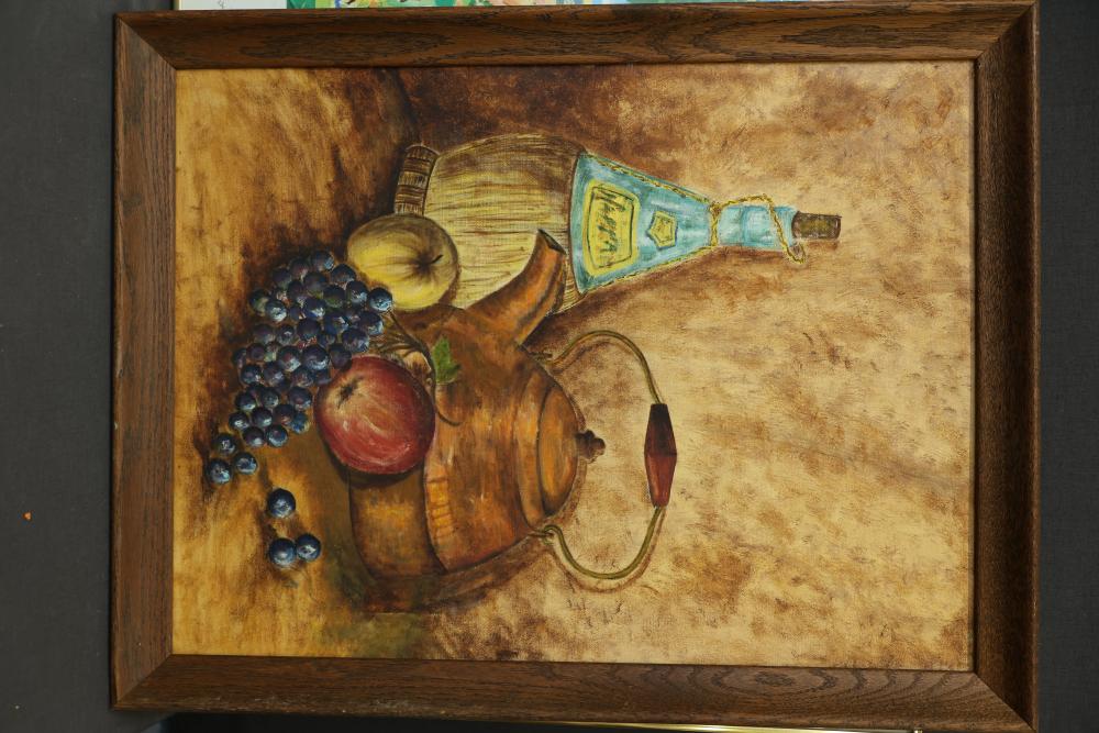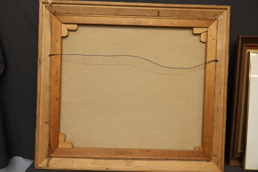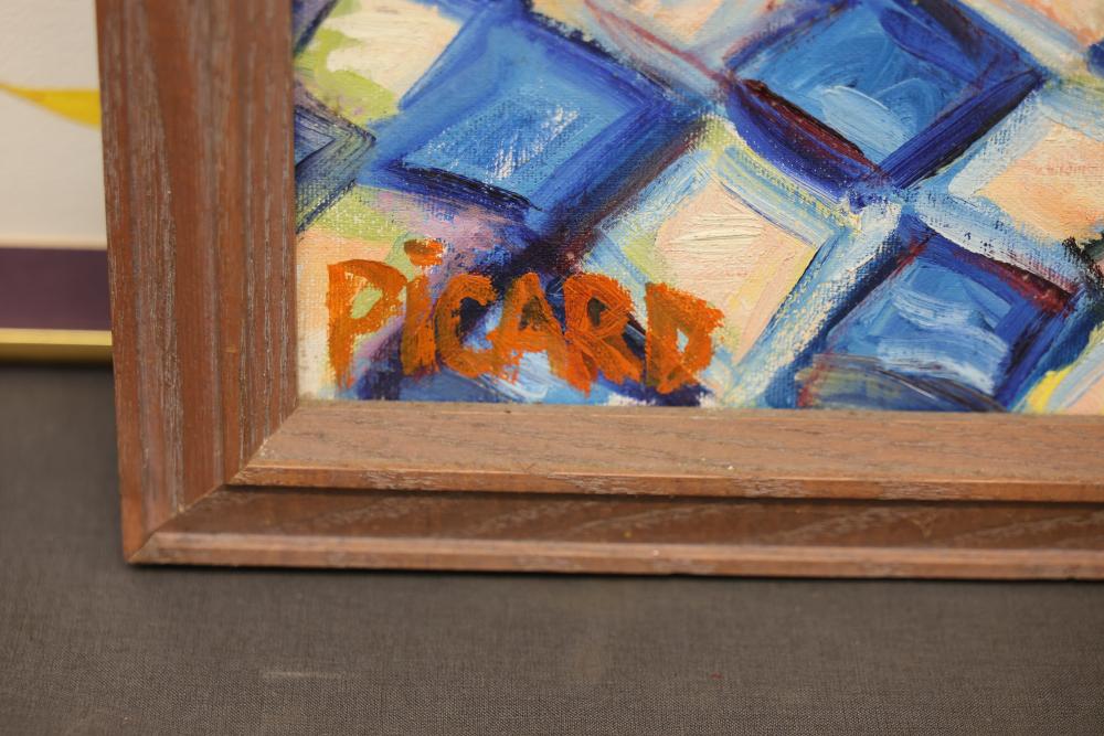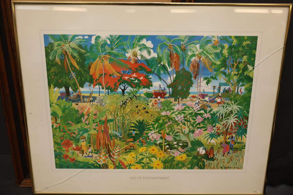 Framed Artwork Assortment, Including Signed Floral and Still Life Paintings. A collection of framed pieces featuring various styles, including signed works by artists Jim Barker (1988), J.E. Greenleaf, Picard, and M. Veling. Subjects include floral arrangements and still life compositions, with vibrant and detailed designs. Mixed media and frames show signs of handling and wear. Glass frame for isle of enchantment is cracked. Pickup only.