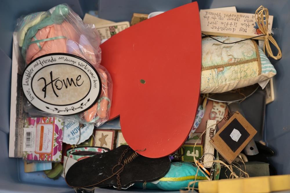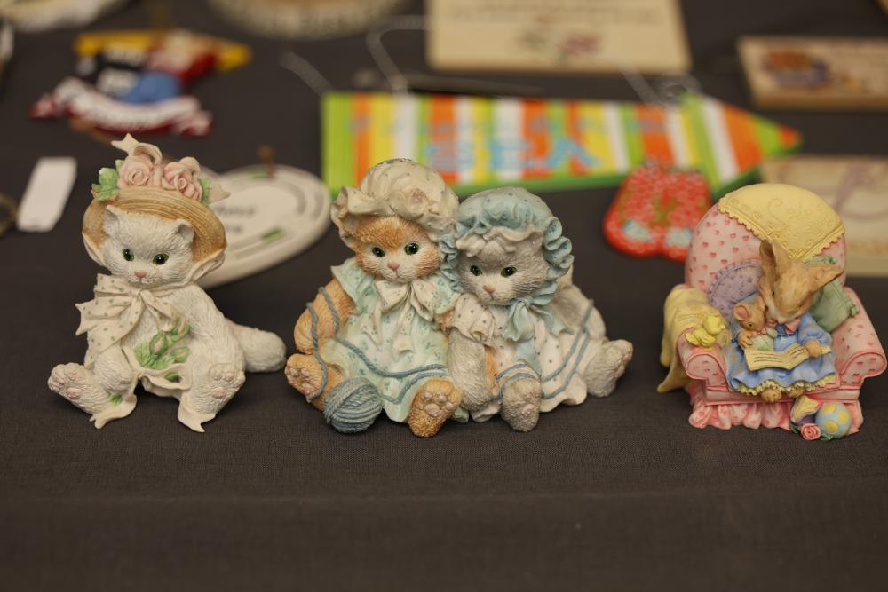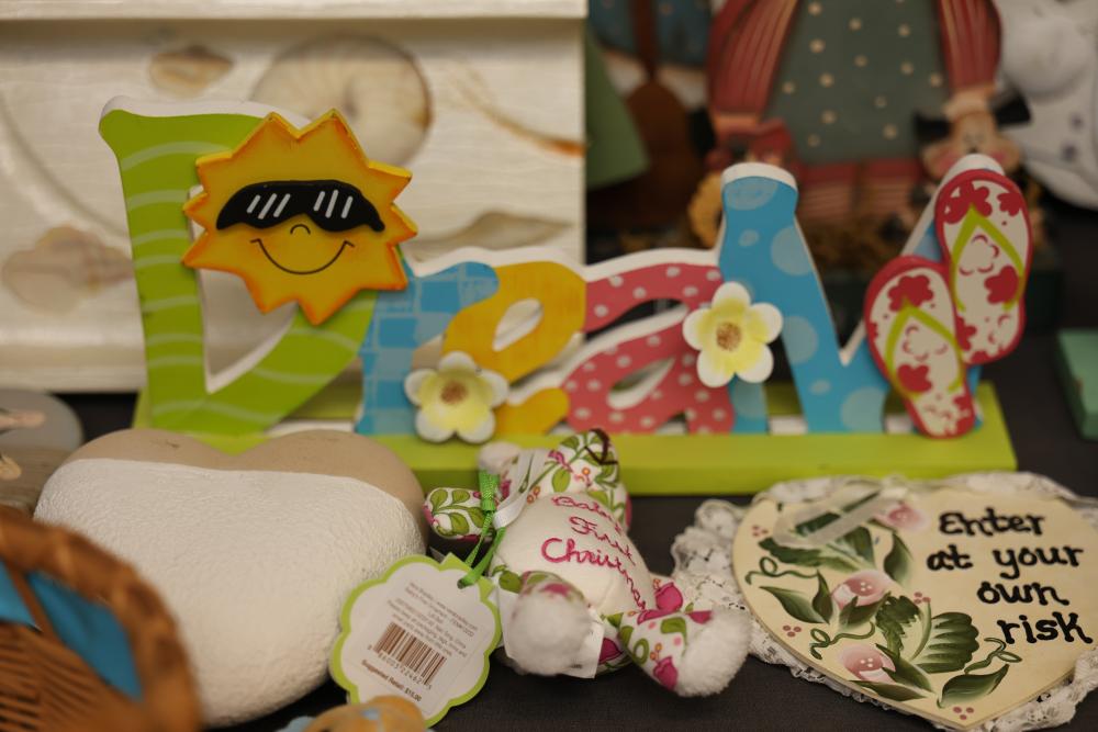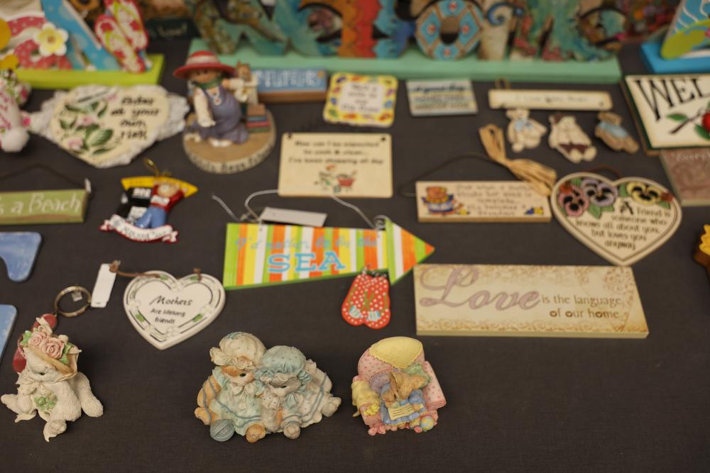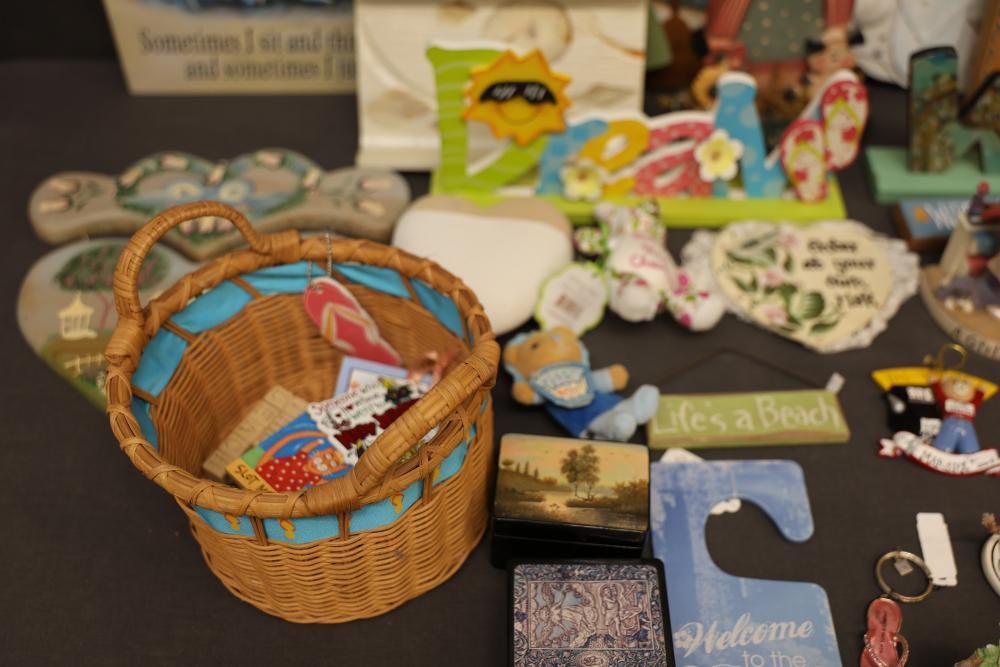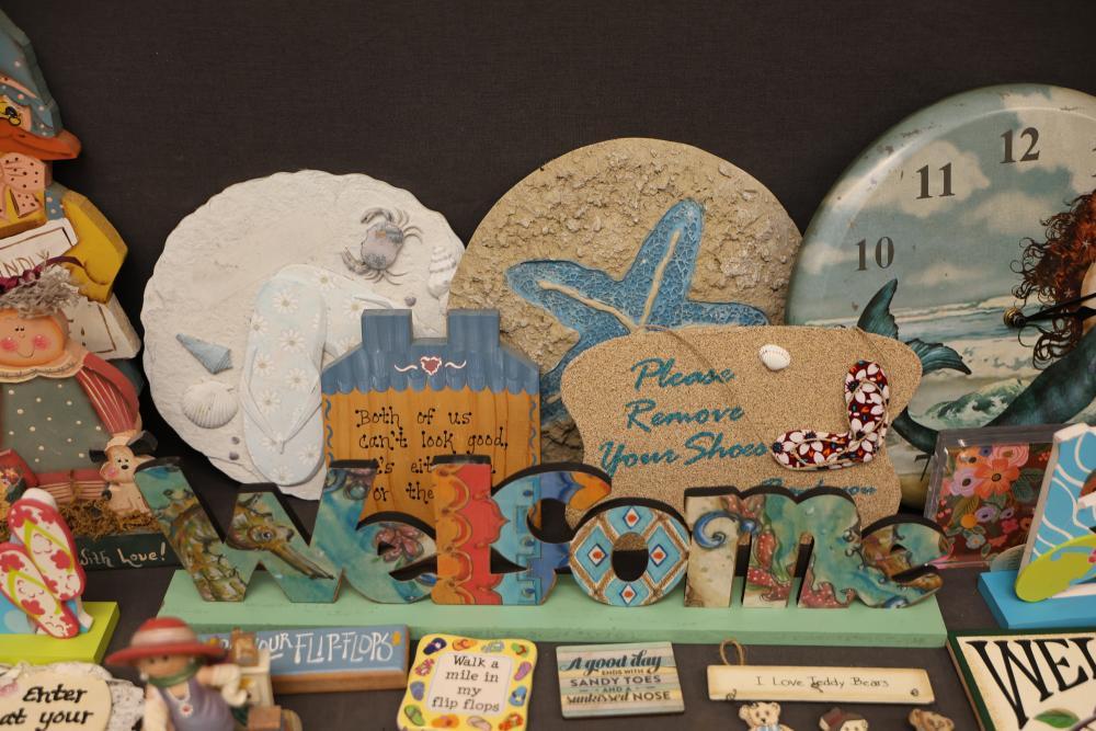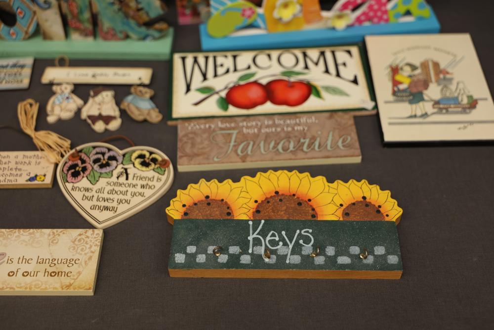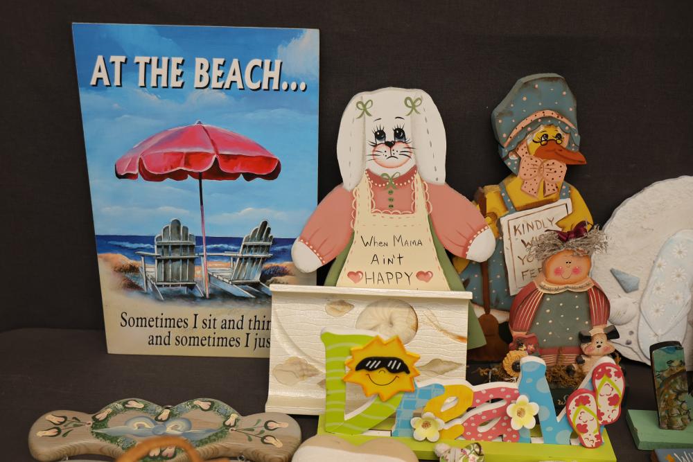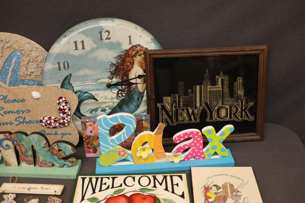Decorative Items Including Figurines, Signs, and Wicker Basket. Includes a variety of figurines, decorative hanging signs with text and images, a small painted wooden key holder, and a wicker basket with decorative accents. Pickup only.