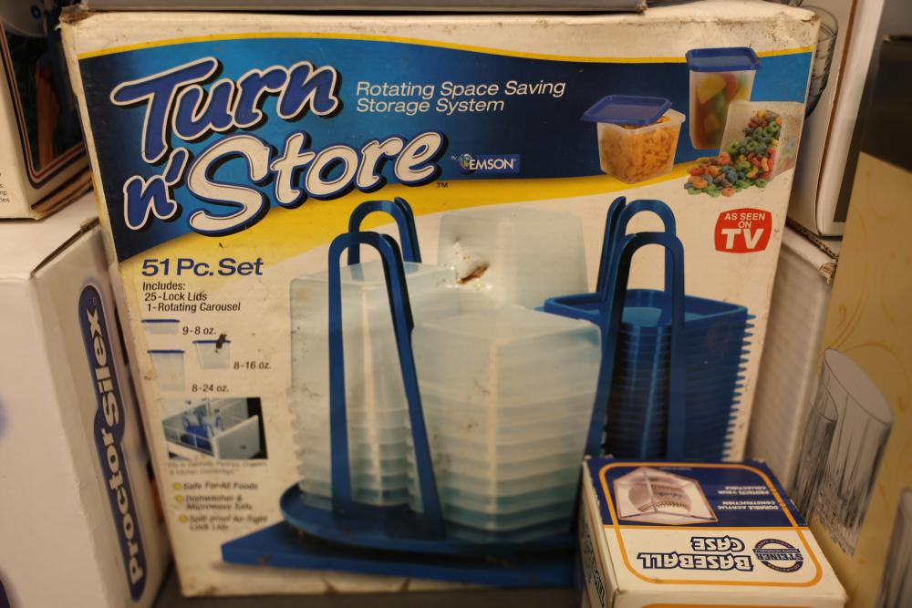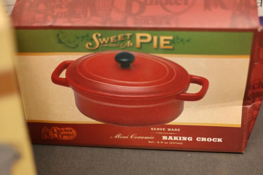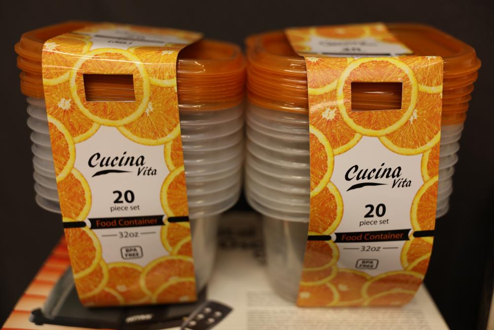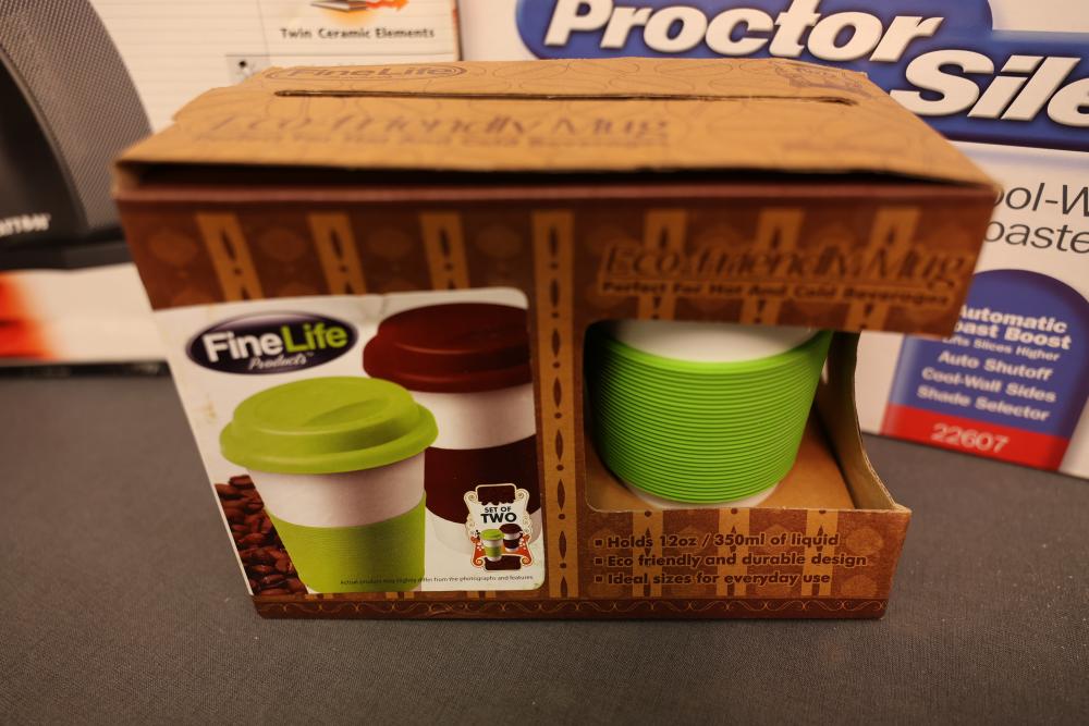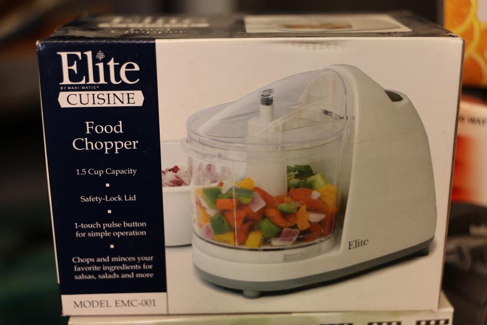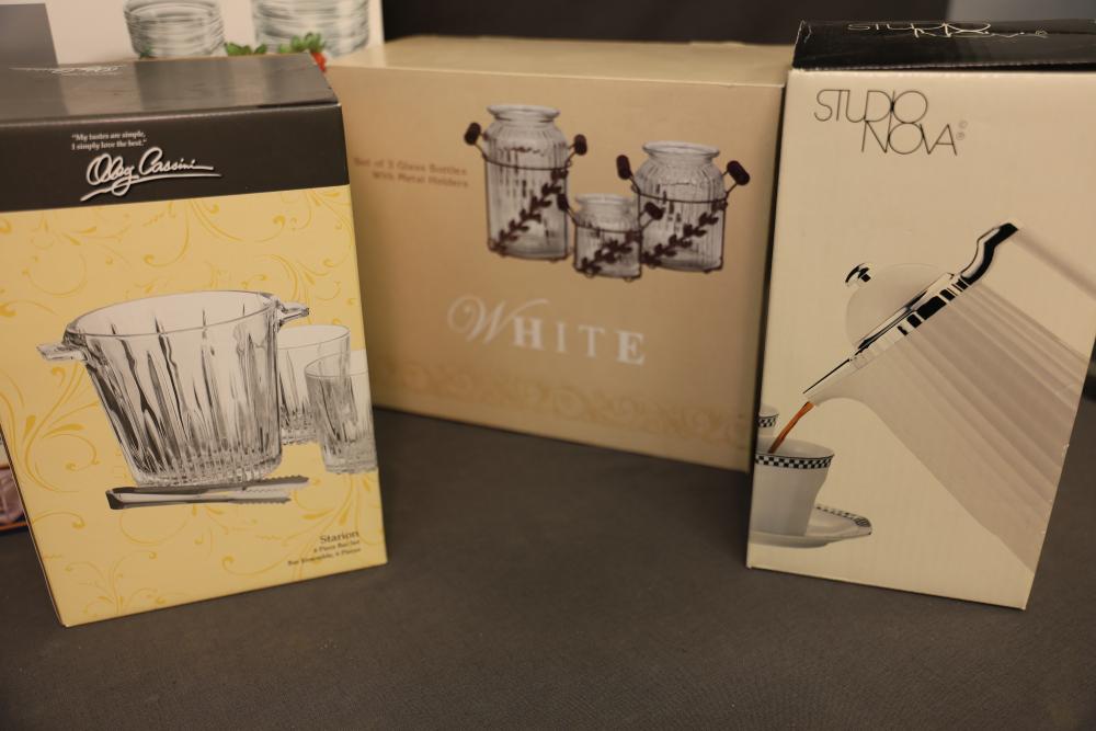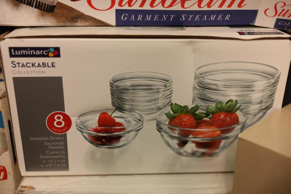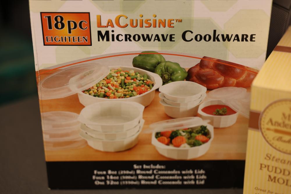 Kitchen and household items including cookware, food storage containers, small appliances, and various accessories. Items feature brands such as Proctor Silex, Elite Cuisine, and Luminarc. Includes an array of products like a digital ceramic heater, food chopper, stackable glass bowls, pudding mold, baking crock, electric air pump, microwave cookware, and more. Most items appear to be new in box. Pickup only.