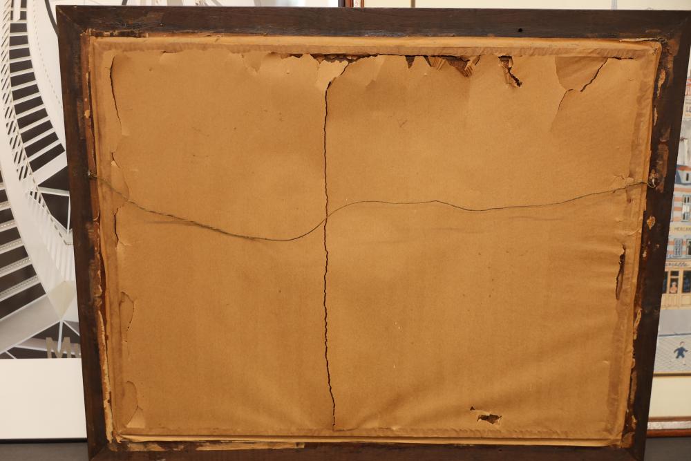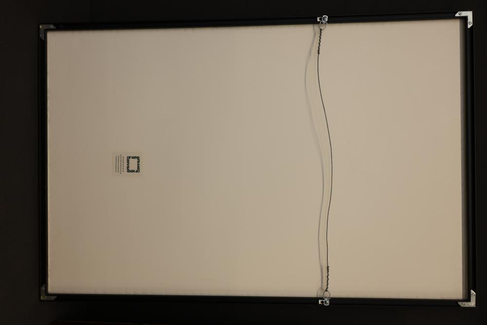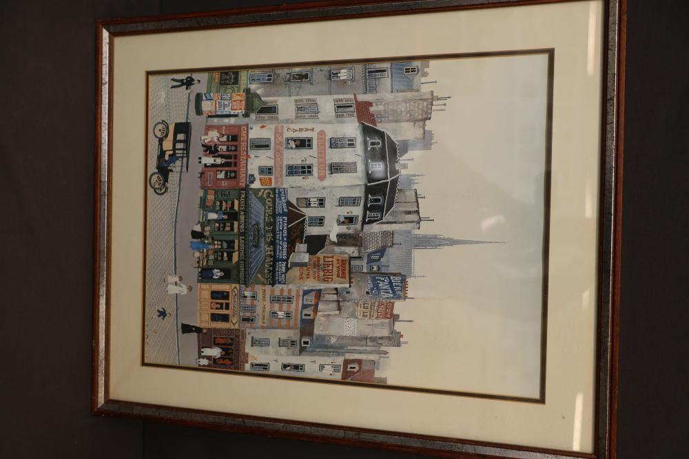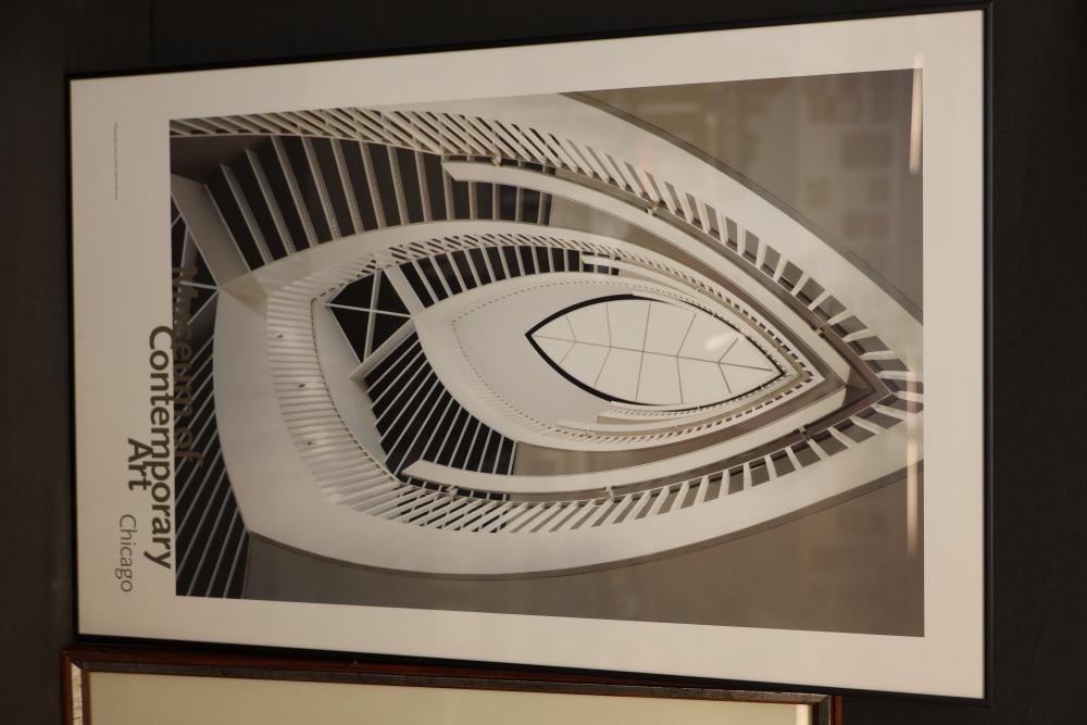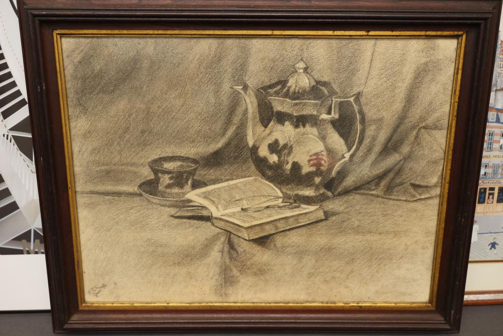 Framed Artwork Including City Scene, Still Life, and Architectural Print. Includes a vibrant cityscape with figures, a pencil drawing of a teapot and an open book, and an architectural photograph print marked 'Contemporary Art Chicago.' Pickup only.