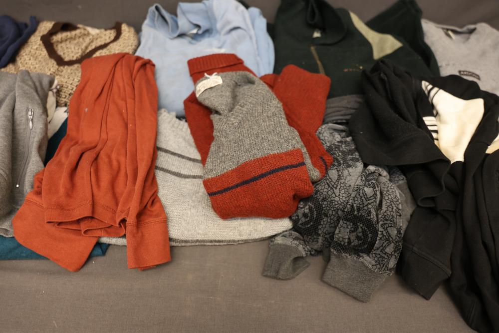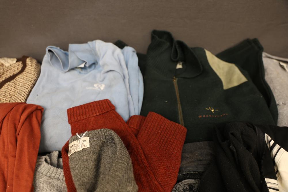 Clothing Assortment Featuring Sweaters, Shirts, and Jackets by Club Room and Others. Includes a variety of men's and women's garments, such as sweaters, polo shirts, knitwear, and other apparel. Brands include Club Room and additional unnamed labels. Pickup only.