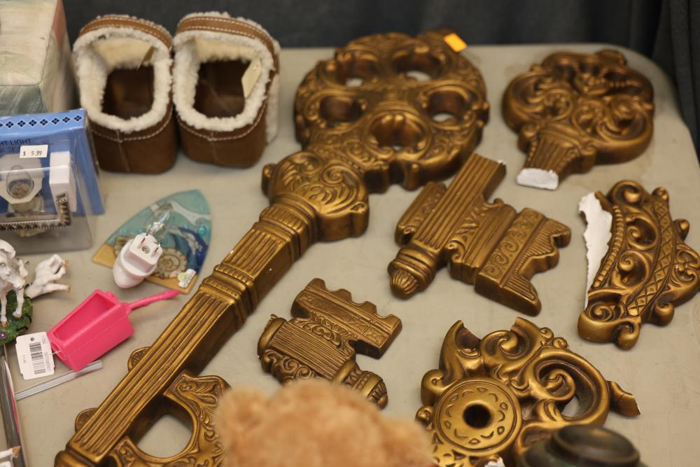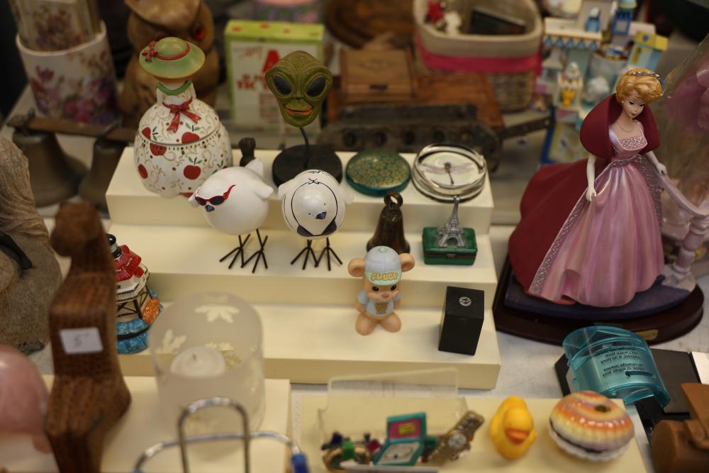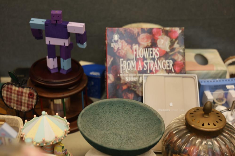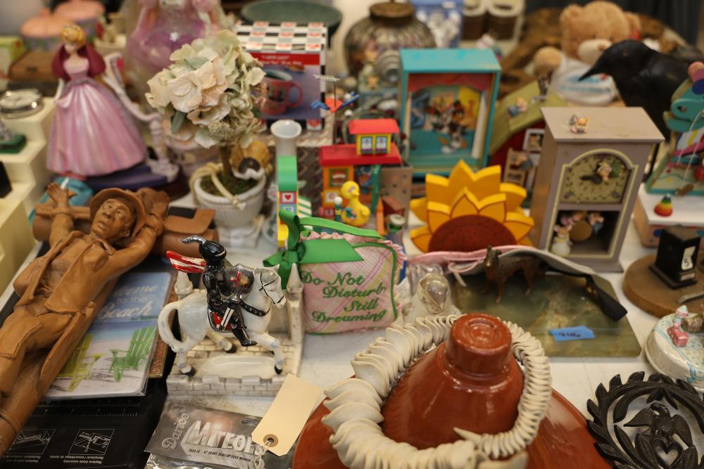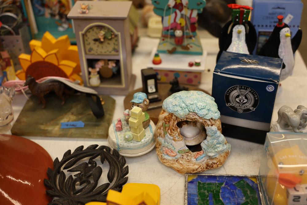 Decorative items including a ceramic pitcher with handle and green floral design, two pink lidded containers, a circular wooden plaque, a small purple block-style robot sculpture, a green textured bowl, a lidded glass jar, brown metallic decorative key-themed wall hangings, a plush teddy bear with branded shirt, a novelty animal hoof item, painted ceramic figurines including roosters, various miniature animal figurines, colorful toy carousel, and additional decorative items. Pickup only.