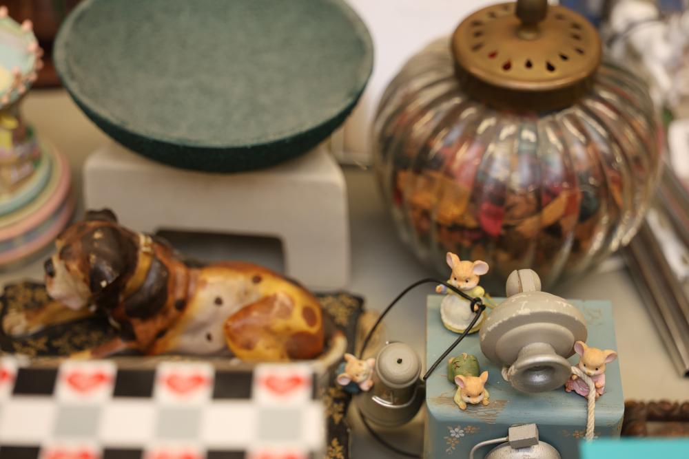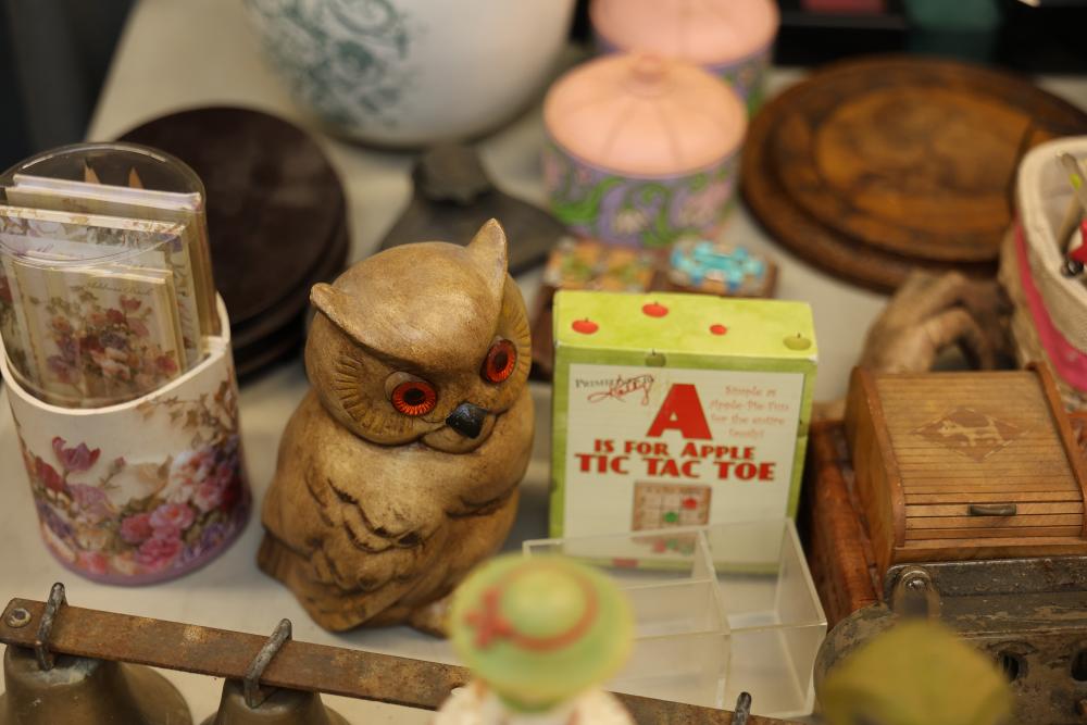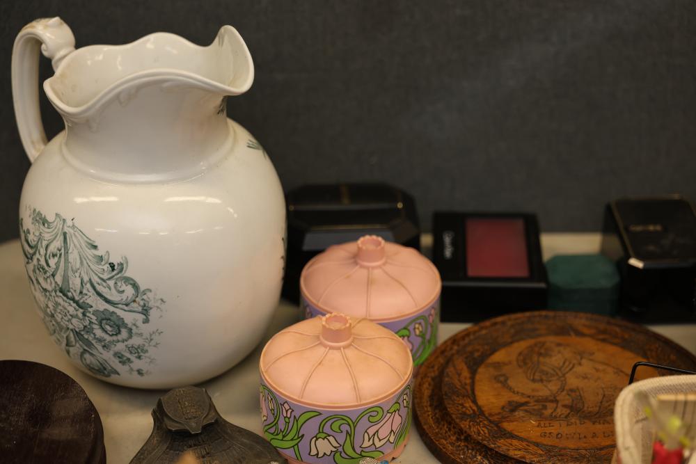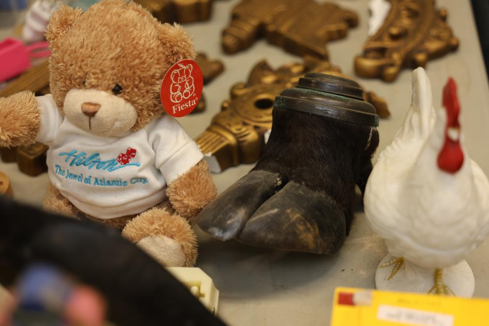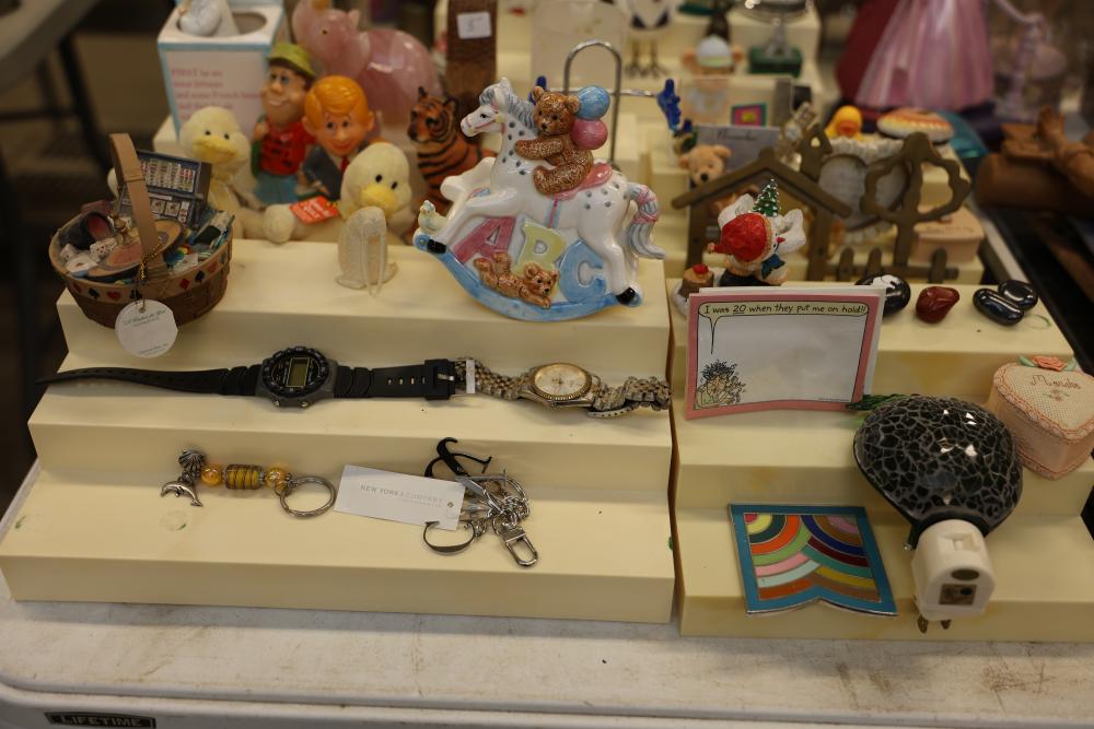 Decorative items including a ceramic pitcher with handle and green floral design, two pink lidded containers, a circular wooden plaque, a small purple block-style robot sculpture, a green textured bowl, a lidded glass jar, brown metallic decorative key-themed wall hangings, a plush teddy bear with branded shirt, a novelty animal hoof item, painted ceramic figurines including roosters, various miniature animal figurines, colorful toy carousel, and additional decorative items. Pickup only.