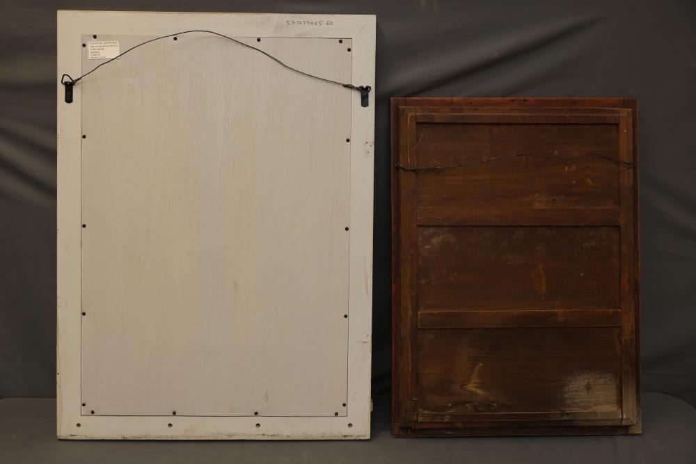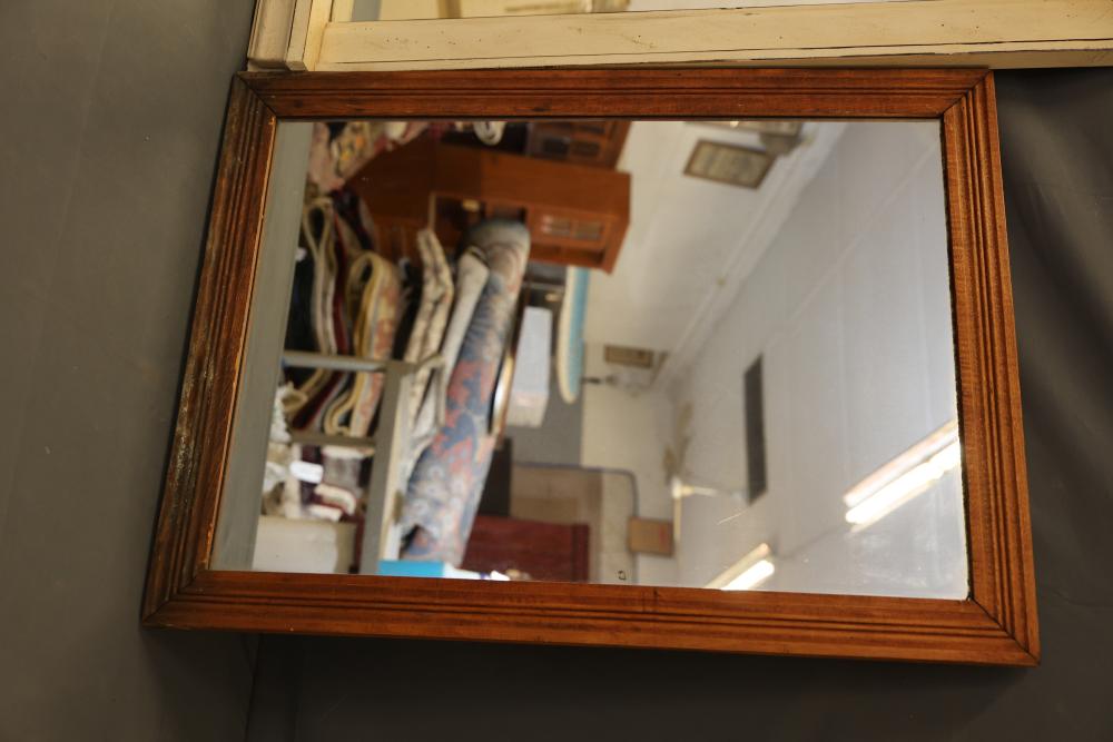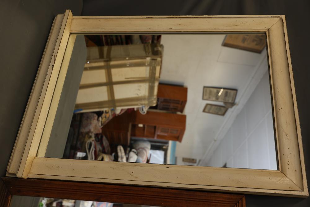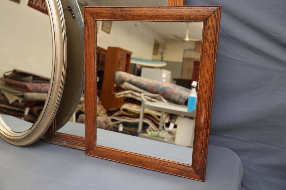 Four Framed Mirrors in Varied Styles. Includes a rectangular white-painted wood frame mirror, an oval silver-tone frame mirror, a rectangular oak frame mirror, and a square wood frame mirror. 38x28, 31x23, 23.5x19.5,31x21.5 Pickup only.