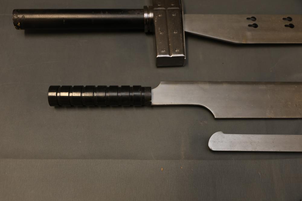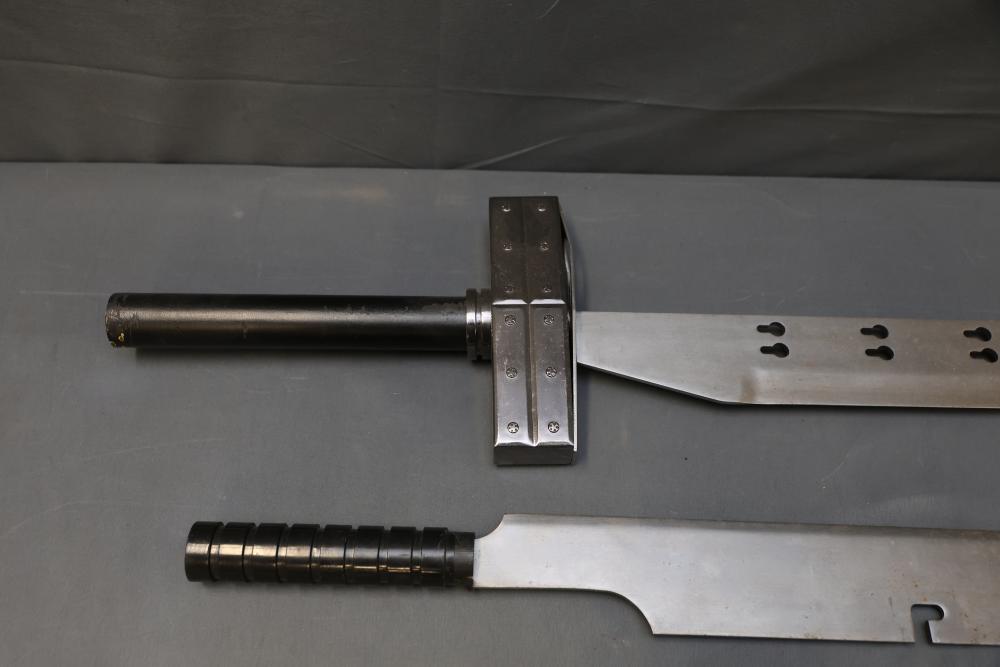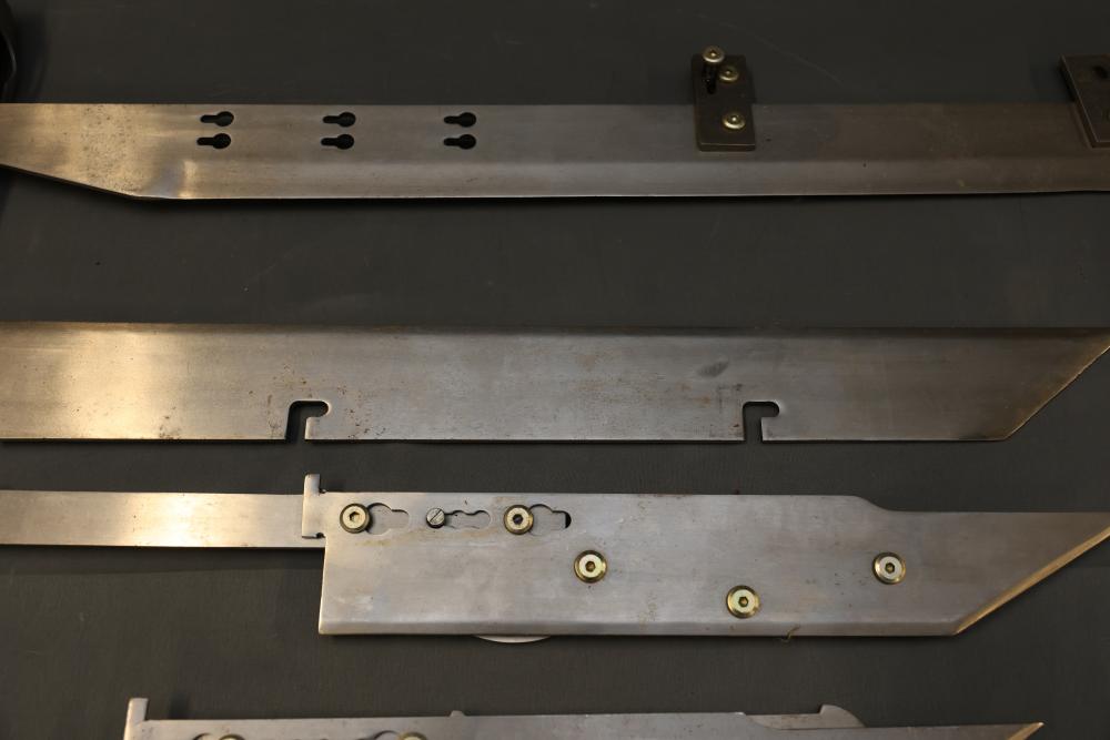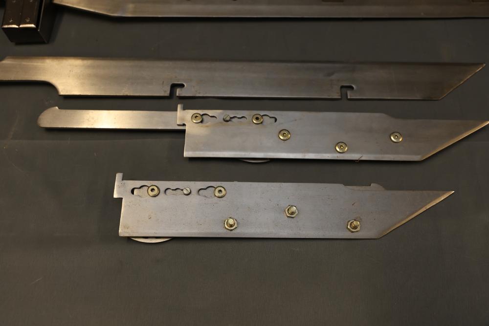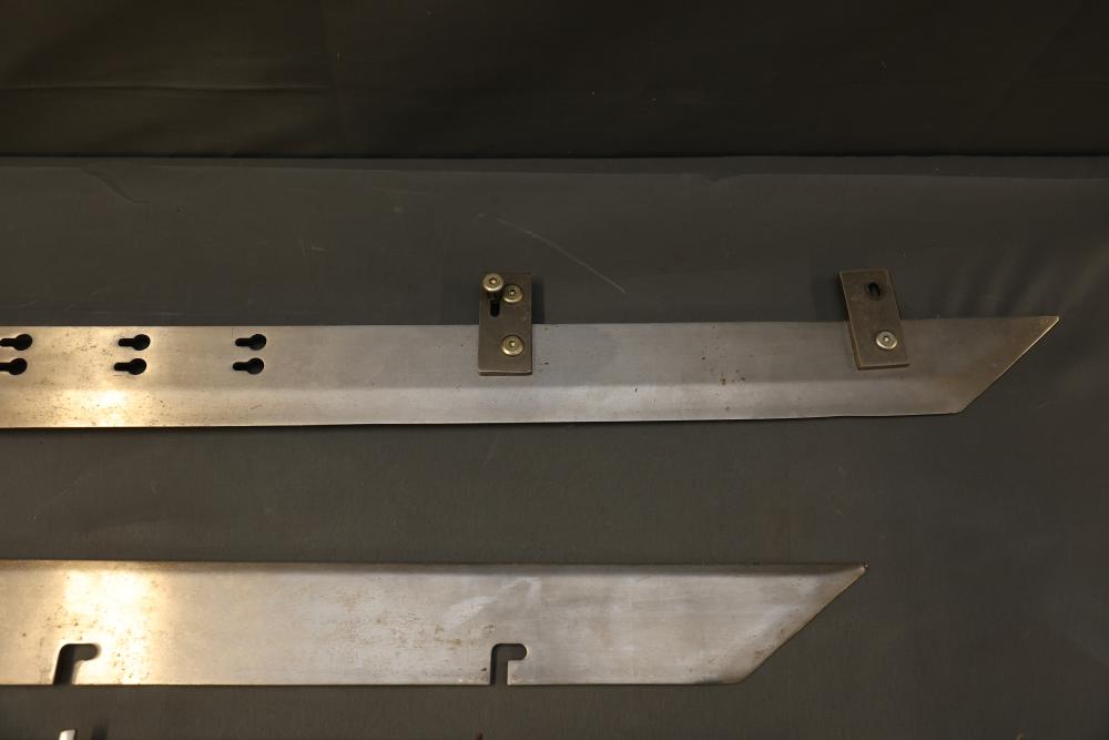 Steel Blades with Handles and Mounting Hardware. Includes two large steel blades featuring mounting brackets and multiple bolt attachments, and two handles designed for secure grip. The arrangement includes hardware with visible bolt placements for durability. Pickup only.