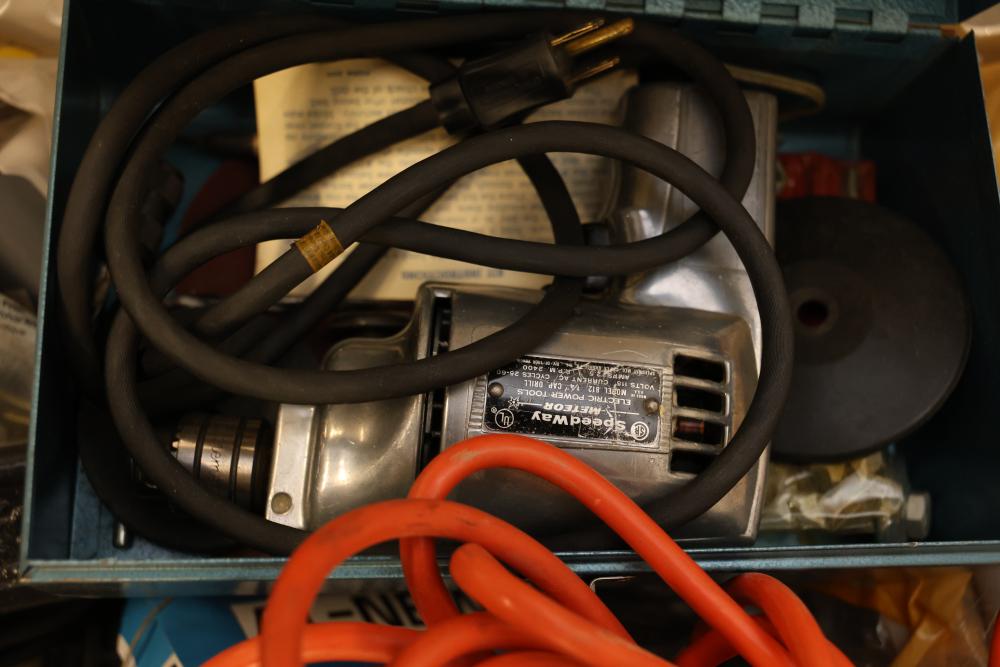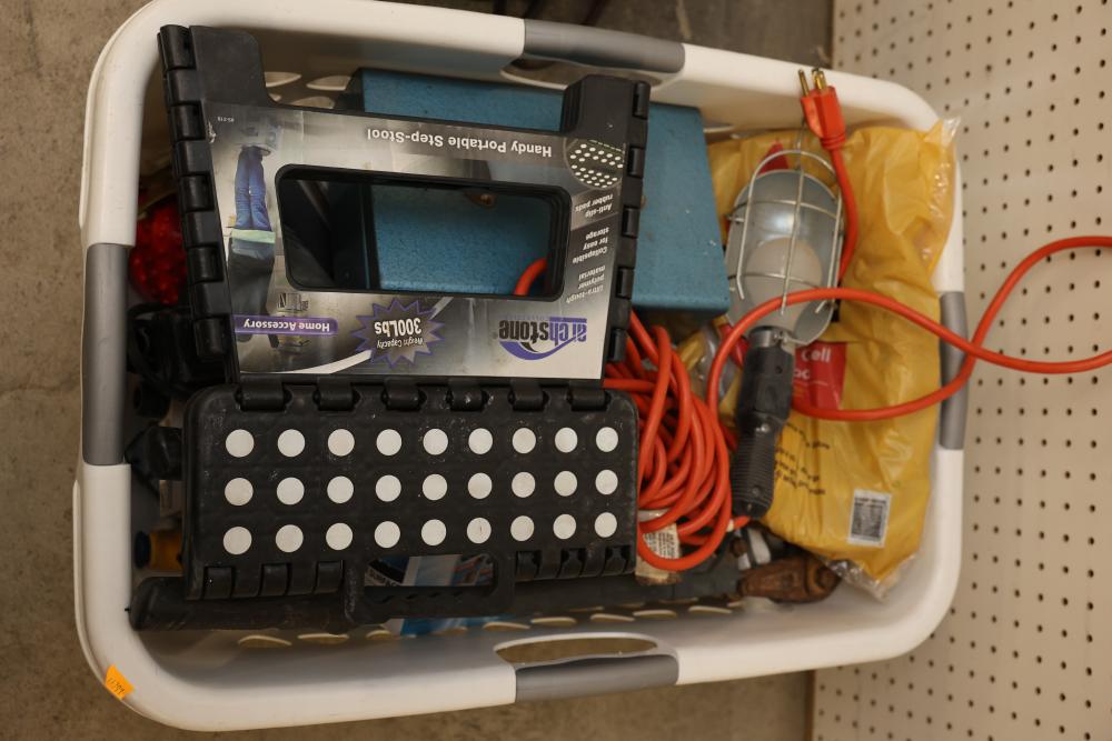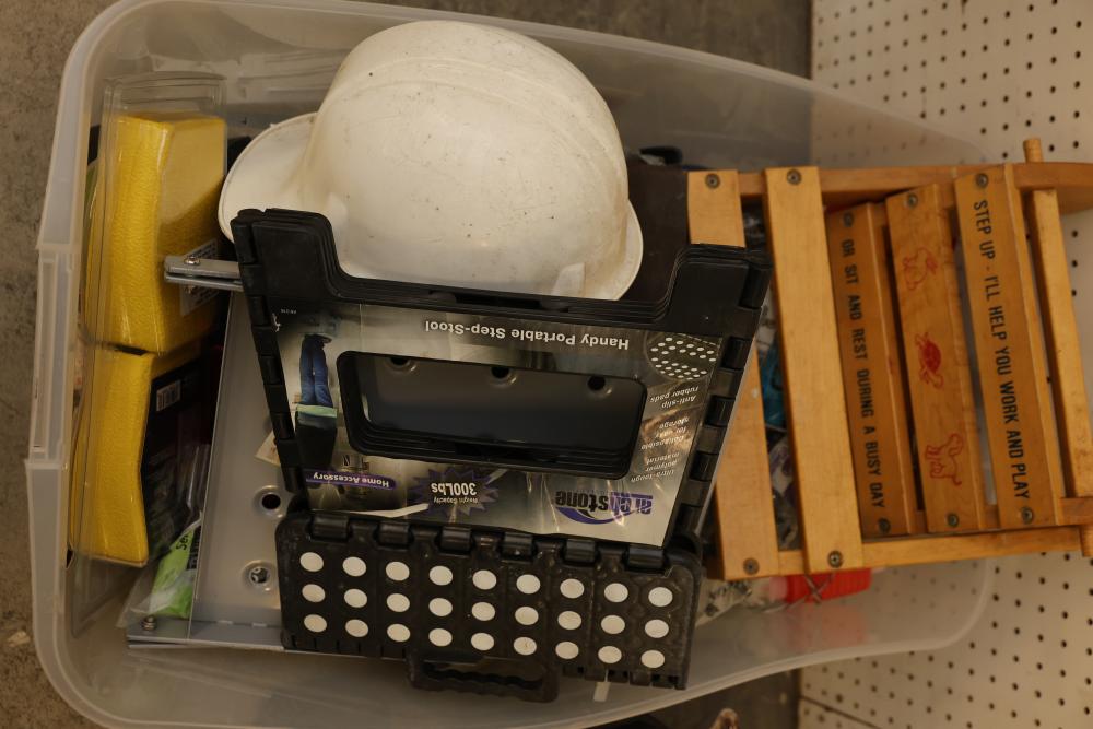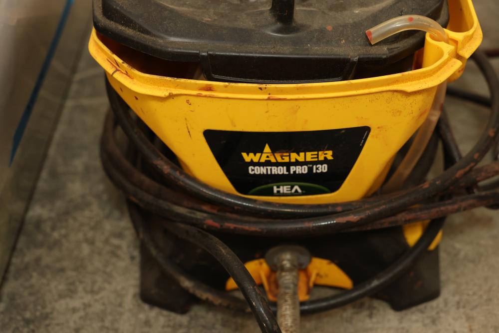 Tools and hardware with Wagner Control Pro 130 paint sprayer, folding wooden stool, utility knives, pocket knife stored in a wooden box, safety helmet, funnels, magnetic gelpad, extension cords, and flexible abrasive items. Includes plastic storage bins for organization. Pickup only.