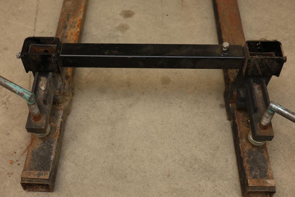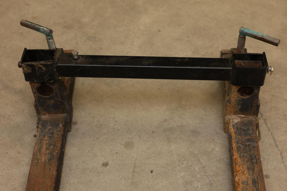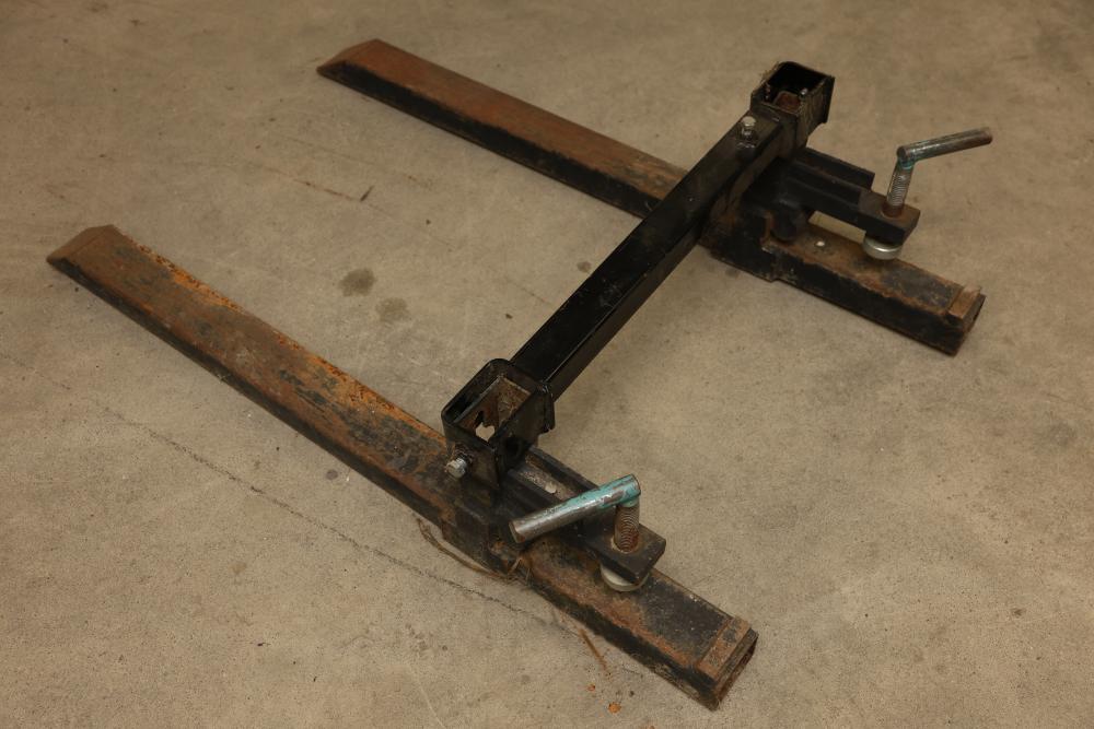 Adjustable Clamp-On Pallet Fork Attachment. Features a steel frame construction with two fork arms and an adjustable steel crossbar. Includes clamp-on mechanisms with two threaded handles for secure attachment to tractor buckets. Fork arms have beveled tips to assist in lifting materials. Pickup only.