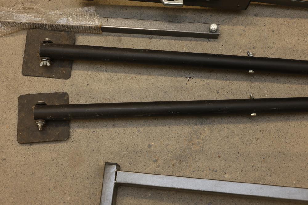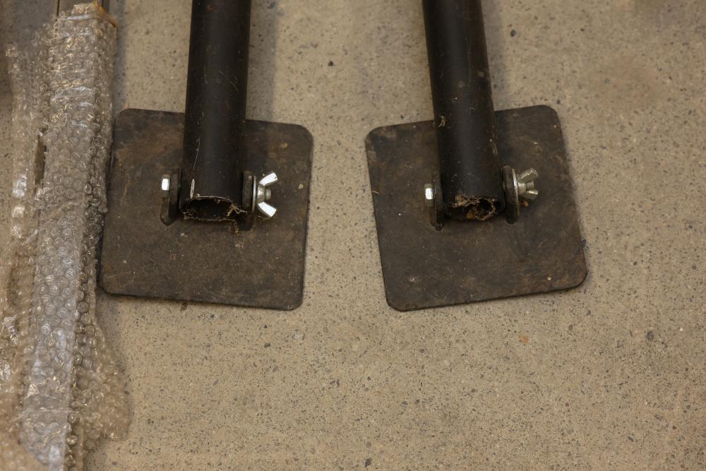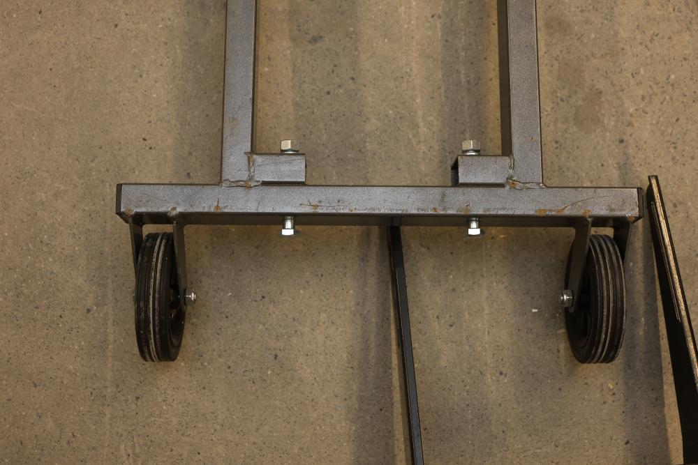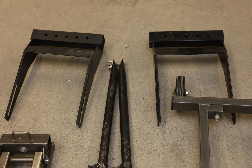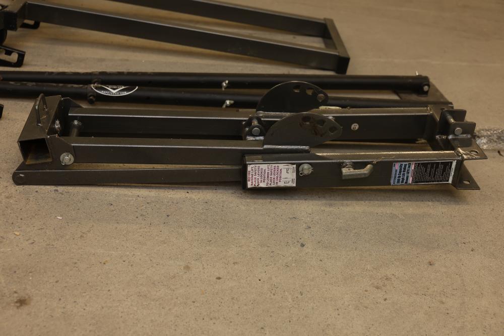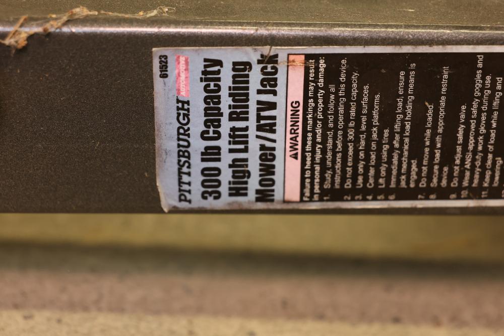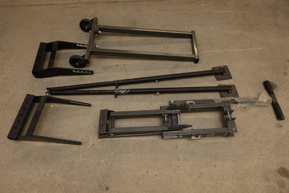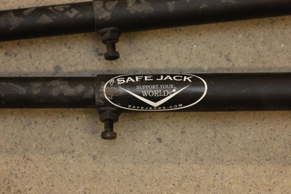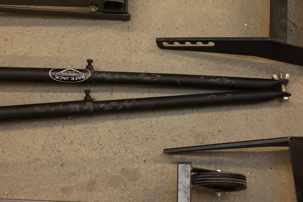 Safe Jack components and Pittsburgh 300 lb capacity high lift riding mower/ATV jack. Includes metal jack frame, two metal bases with wheels, two Safe Jack branded support bars, stabilizing plates, adjustable metal forks, and a handle. Pickup only.