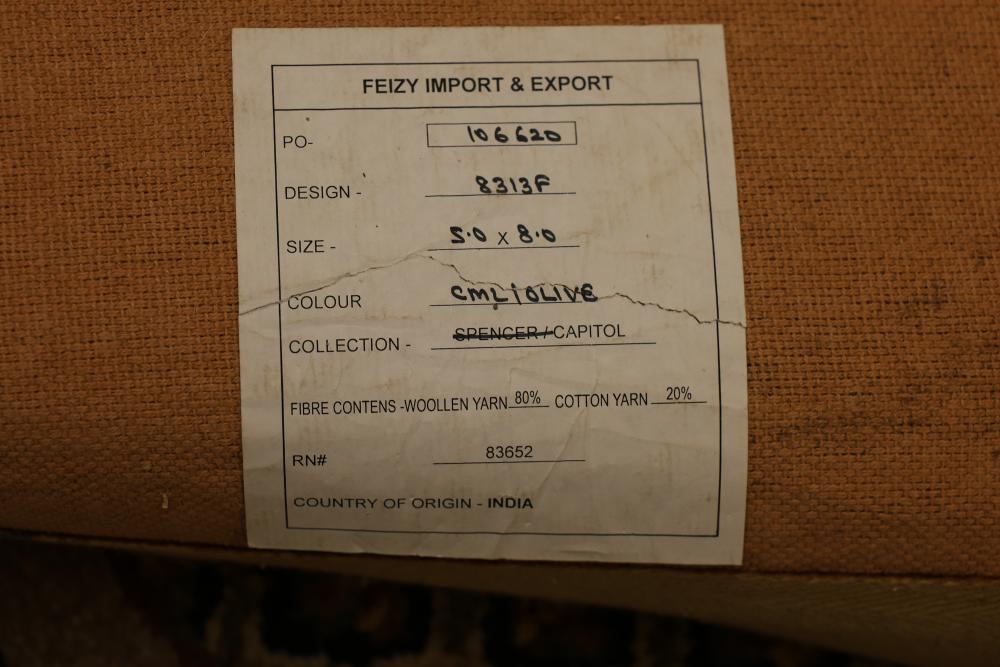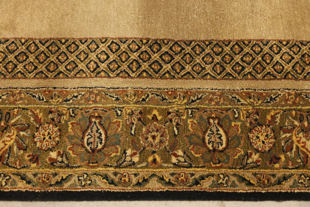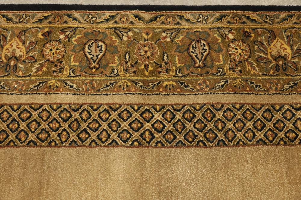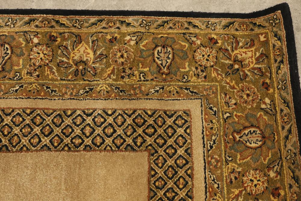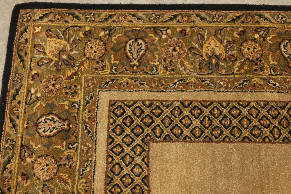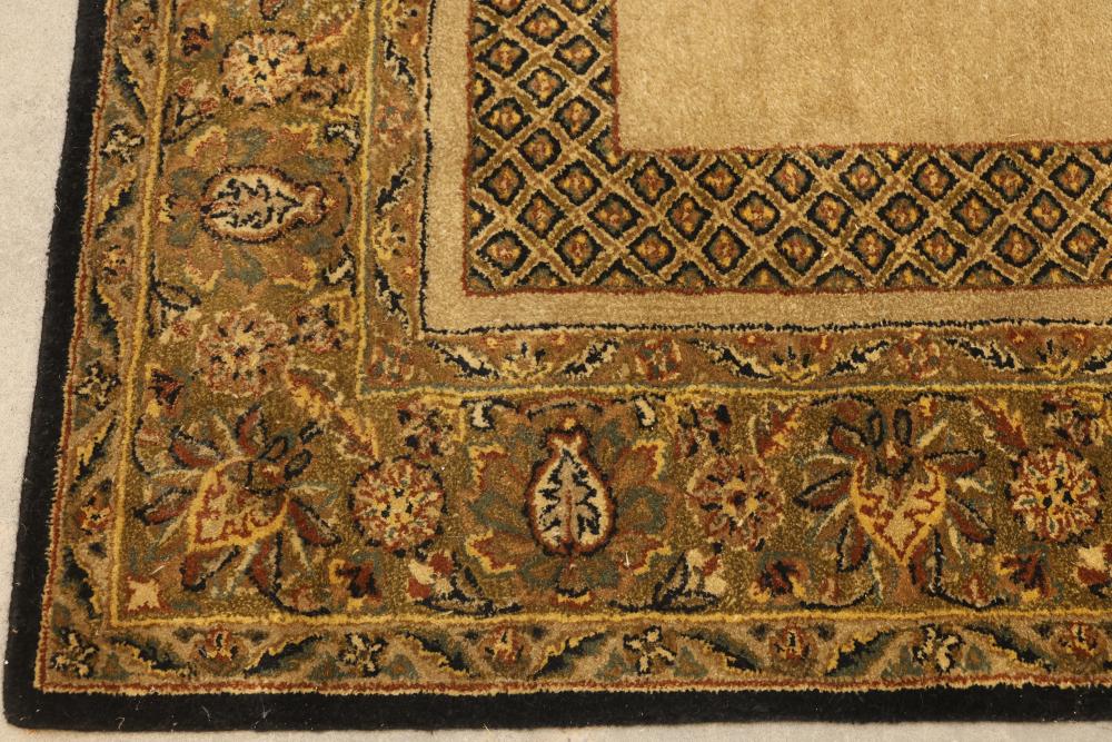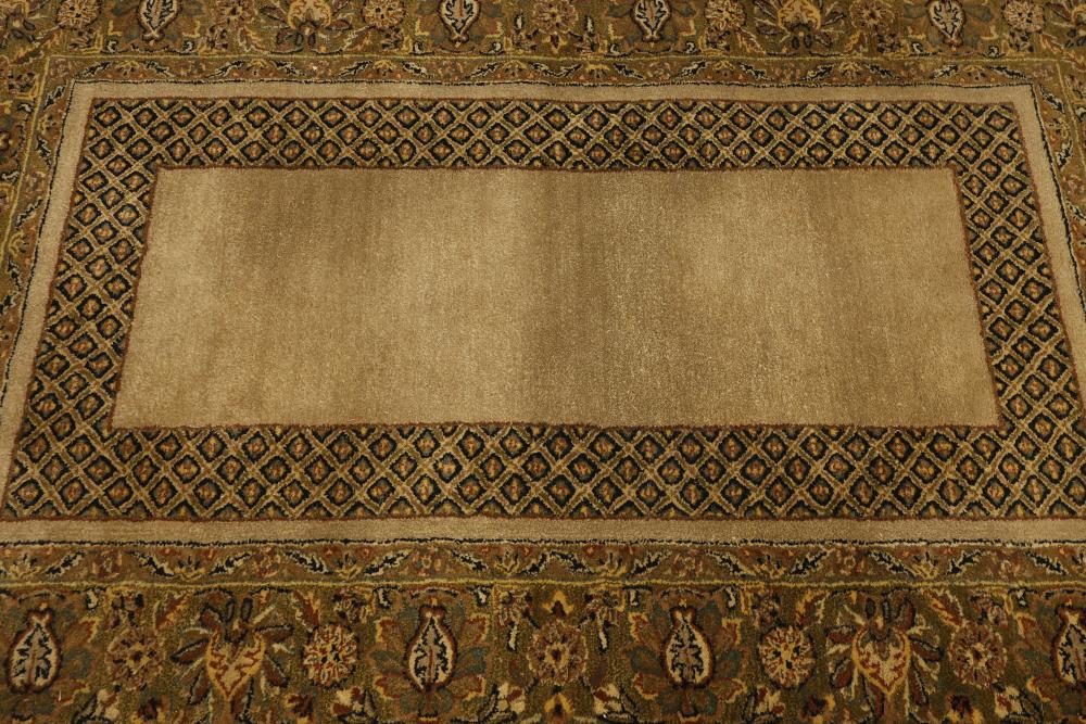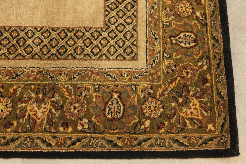 Wool and Cotton Area Rug with Floral and Geometric Borders, 97in x 60in. Featuring a beige center panel framed by a diamond-patterned geometric border and a floral motif outer border in tones of olive and earth colors. Pickup only.