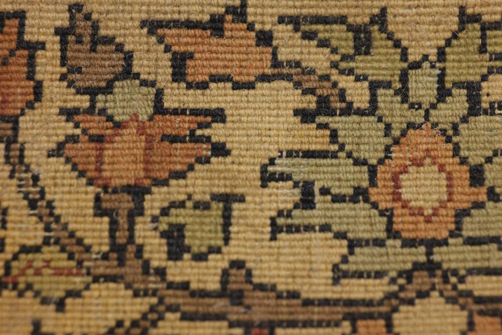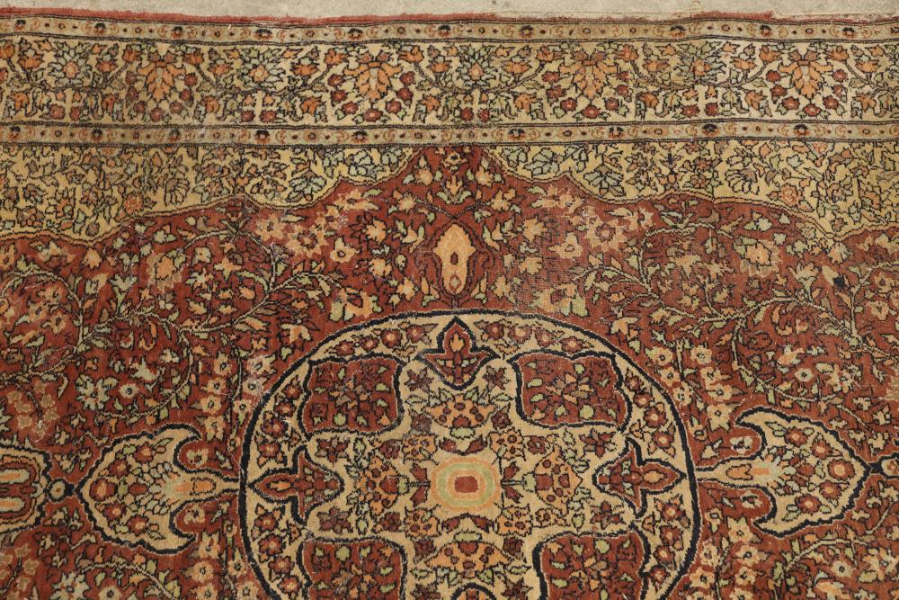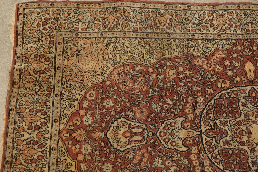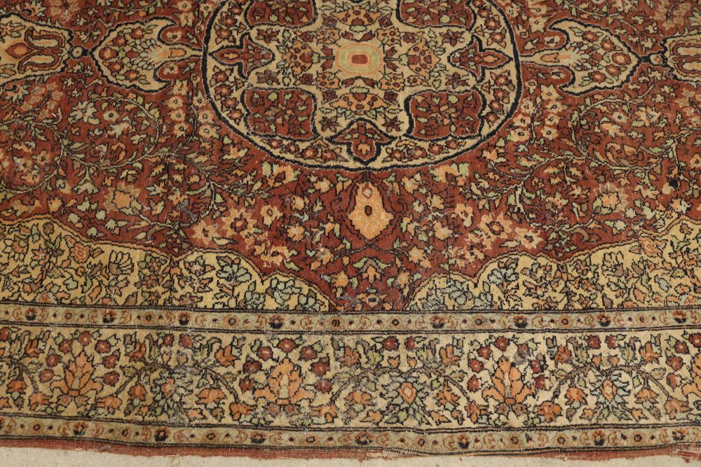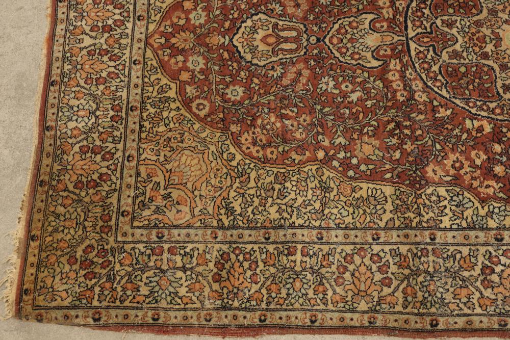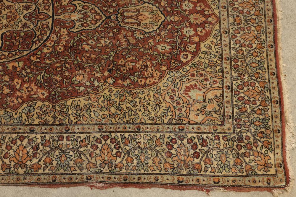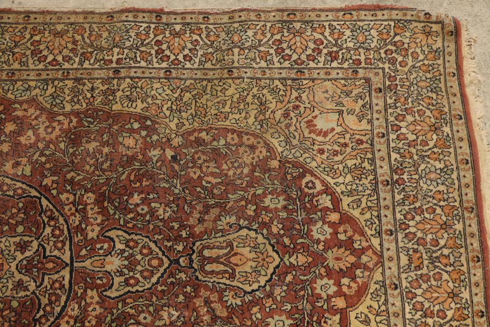 hand-knotted area rug featuring an intricate floral border and a central medallion design. The rug showcases a warm palette of red, beige, and yellow tones, with detailed floral patterns woven throughout. 85in x 49in. Pickup only.