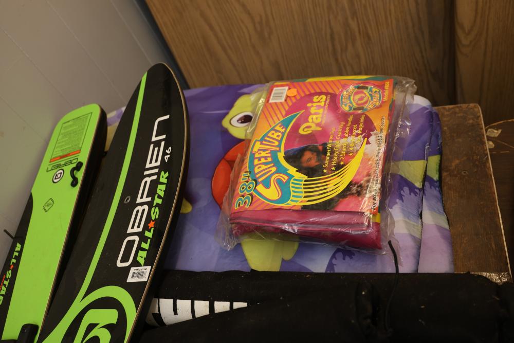 Outdoor and sporting equipment including folding chairs, inflatable floatation devices, O'Brien Elite Star water skis, Adirondack-style fishing rods in a carrying case, a Rawlings baseball glove, a pair of goggles, multiple dumbbells, a foam roller, a cooler, a red fuel container, packaged items, and other related accessories. Pickup only.
