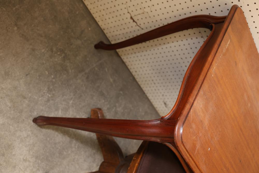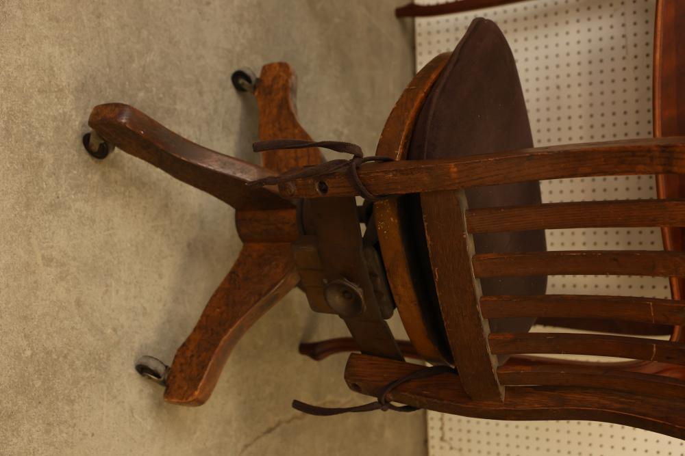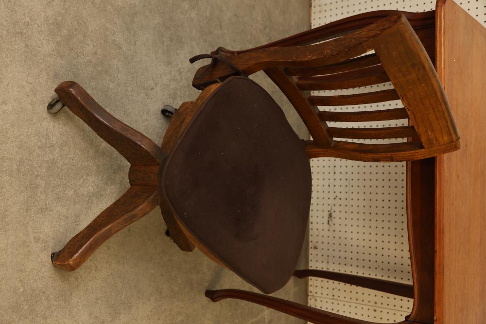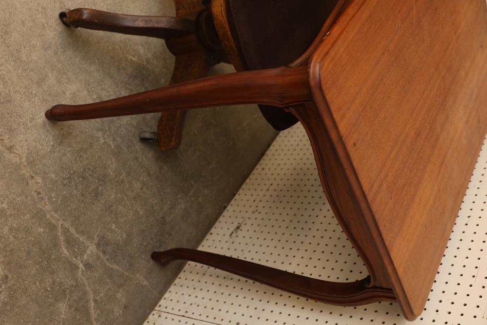 Wood Writing Desk with Cabriole Legs and Adjustable Swivel Chair. The desk measures 34x24x30 inches and features a rectangular top and elegantly curved cabriole legs. The accompanying chair has a slatted wood backrest, a padded brown circular seat, and an adjustable swivel design on a four-point wood base with casters. Pickup only.