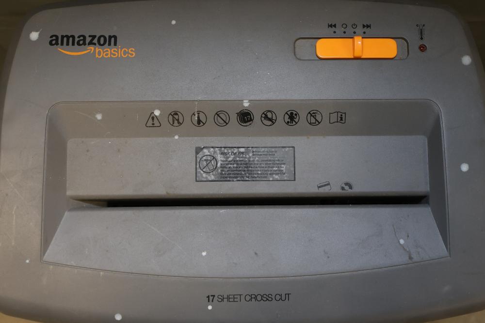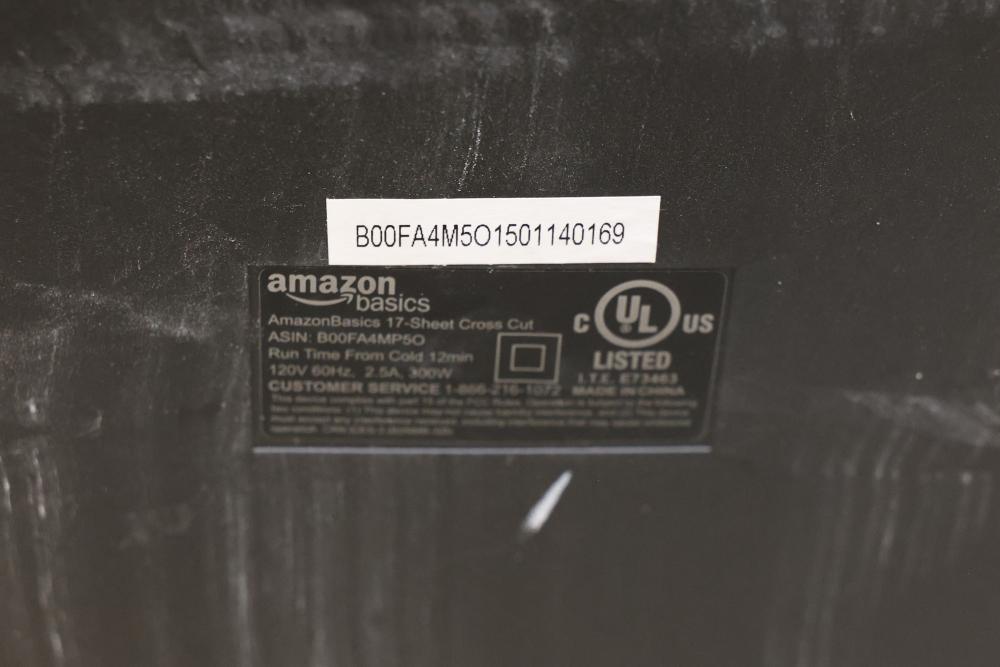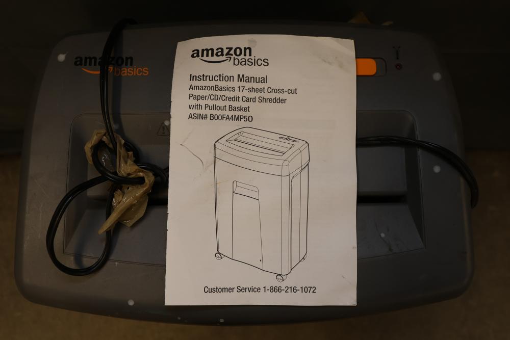 Amazon Basics 17-Sheet Cross-Cut Paper Shredder with Pullout Basket featuring a 17-sheet capacity. Includes an instruction manual and shows control buttons for power and reverse functionality. Designed for efficient shredding and mounted on castor wheels for mobility. Pickup only.