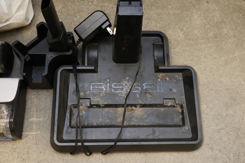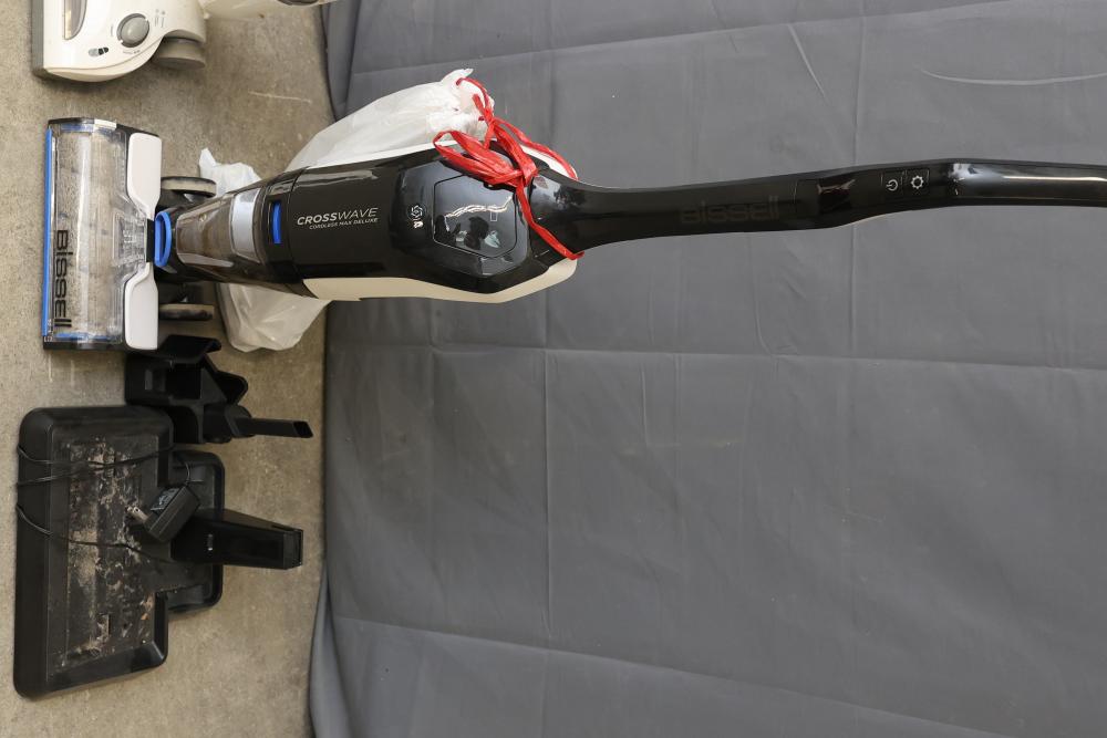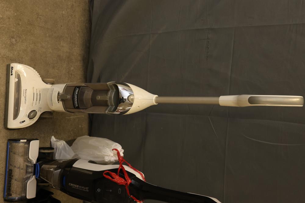 Bissell CrossWave Cordless Max Deluxe Vacuum and Shark Vacuum. Includes Bissell CrossWave vacuum with charger, docking station, and replacement rolls. Shark vacuum is included but does not have a charger. Both vacuums are pictured together with accessories. Pickup only.