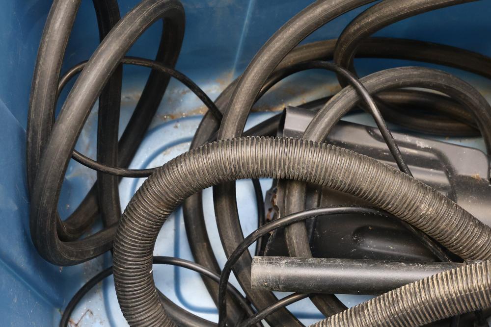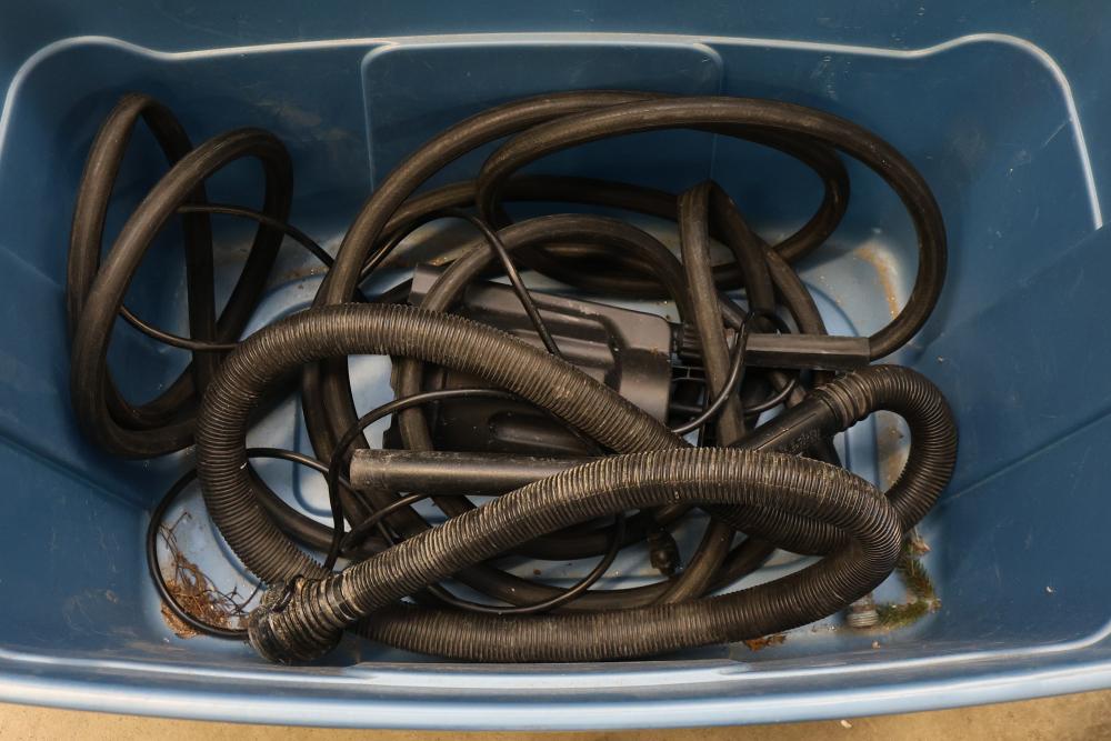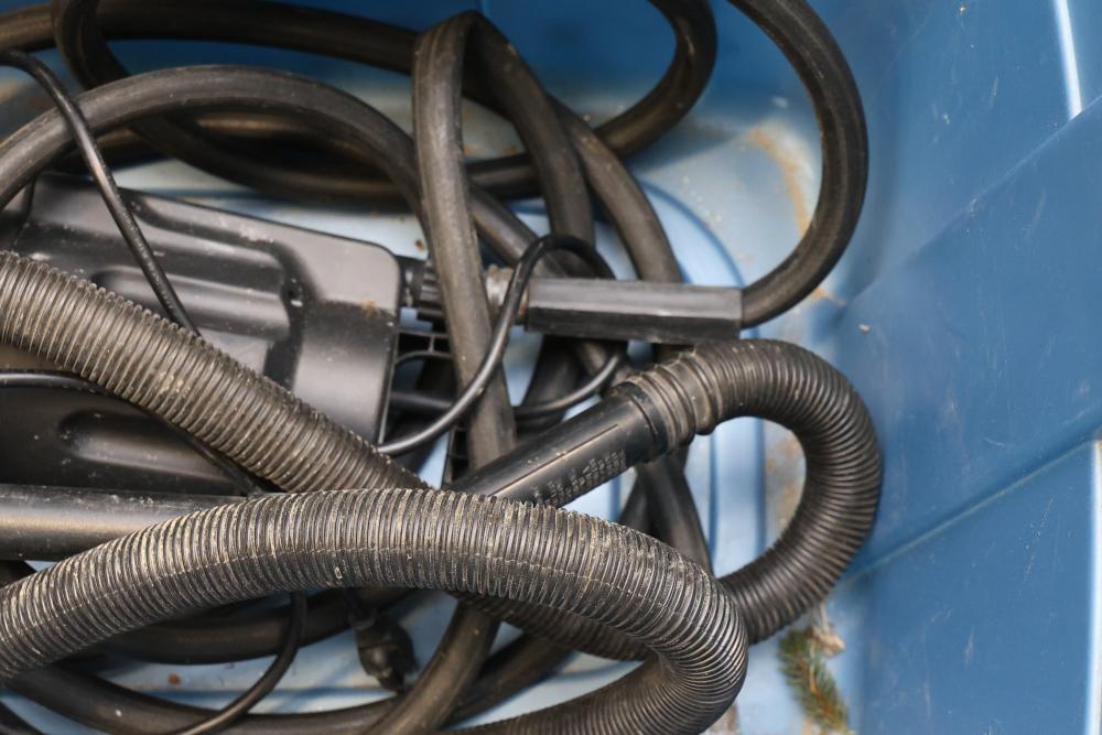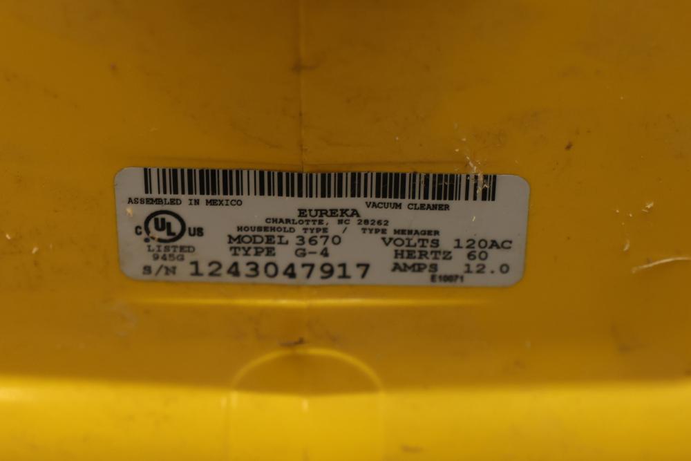Eureka Mighty Mite 3670 vacuum cleaner in yellow and black design. Includes a bin containing a variety of hoses and attachments, compatible with the vacuum. The vacuum cleaner is labeled with type 4, 120 AC, 12 amps, and model 3670. Pickup only.