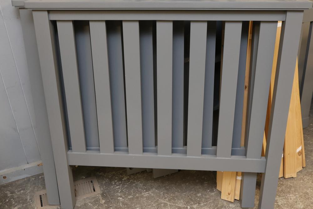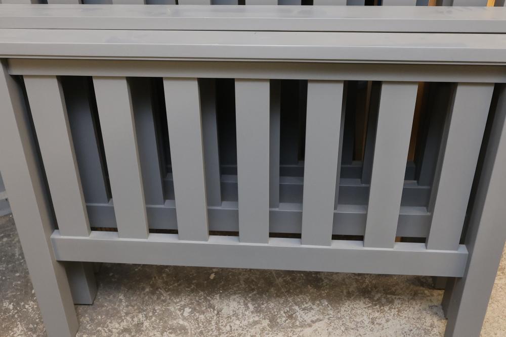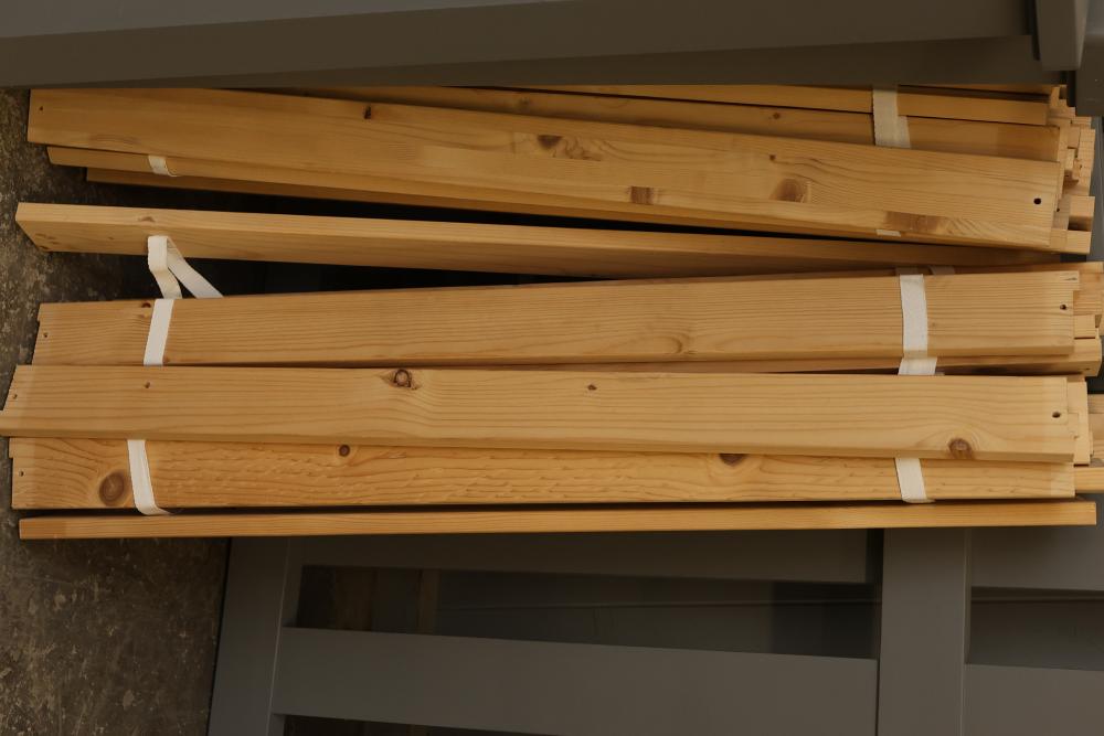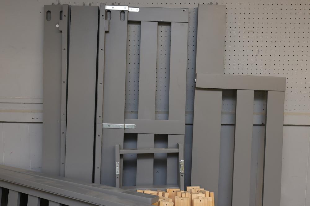 Gray Wooden Bunk Bed Frame With Hardware and Instructions. Includes wooden slats, vertical side panels, support rails, and ladder components for assembly. Designed with a slatted pattern on the headboards and footboards. Hardware and assembly instructions are included. Pickup only.