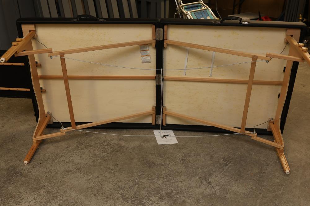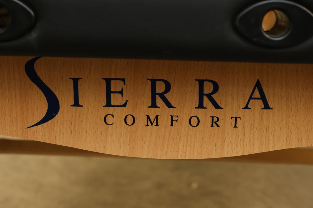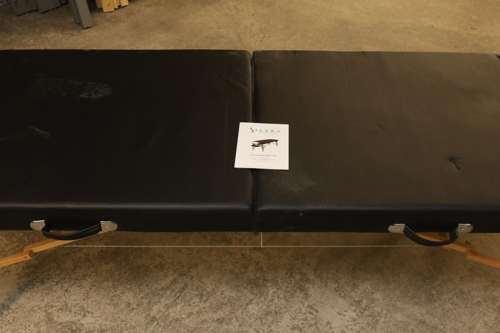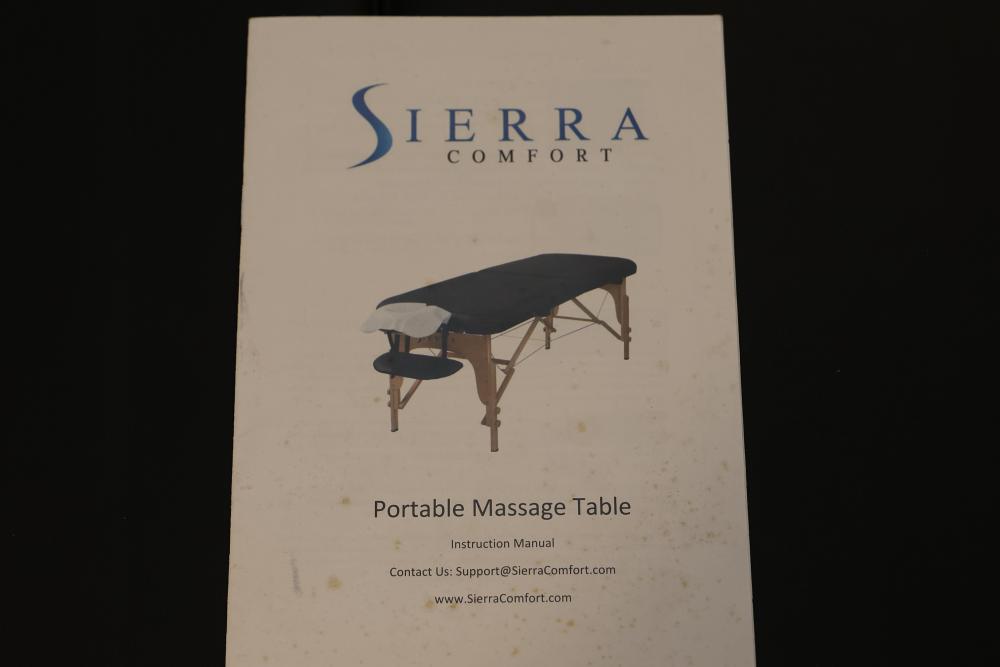 Sierra Comfort Portable Massage Table with Black Upholstery. Features foldable wooden legs and frame, black padded surface, and built-in carrying handles. Includes an instruction manual for assembly and use. Designed for portability and stability in various settings. Pickup only.